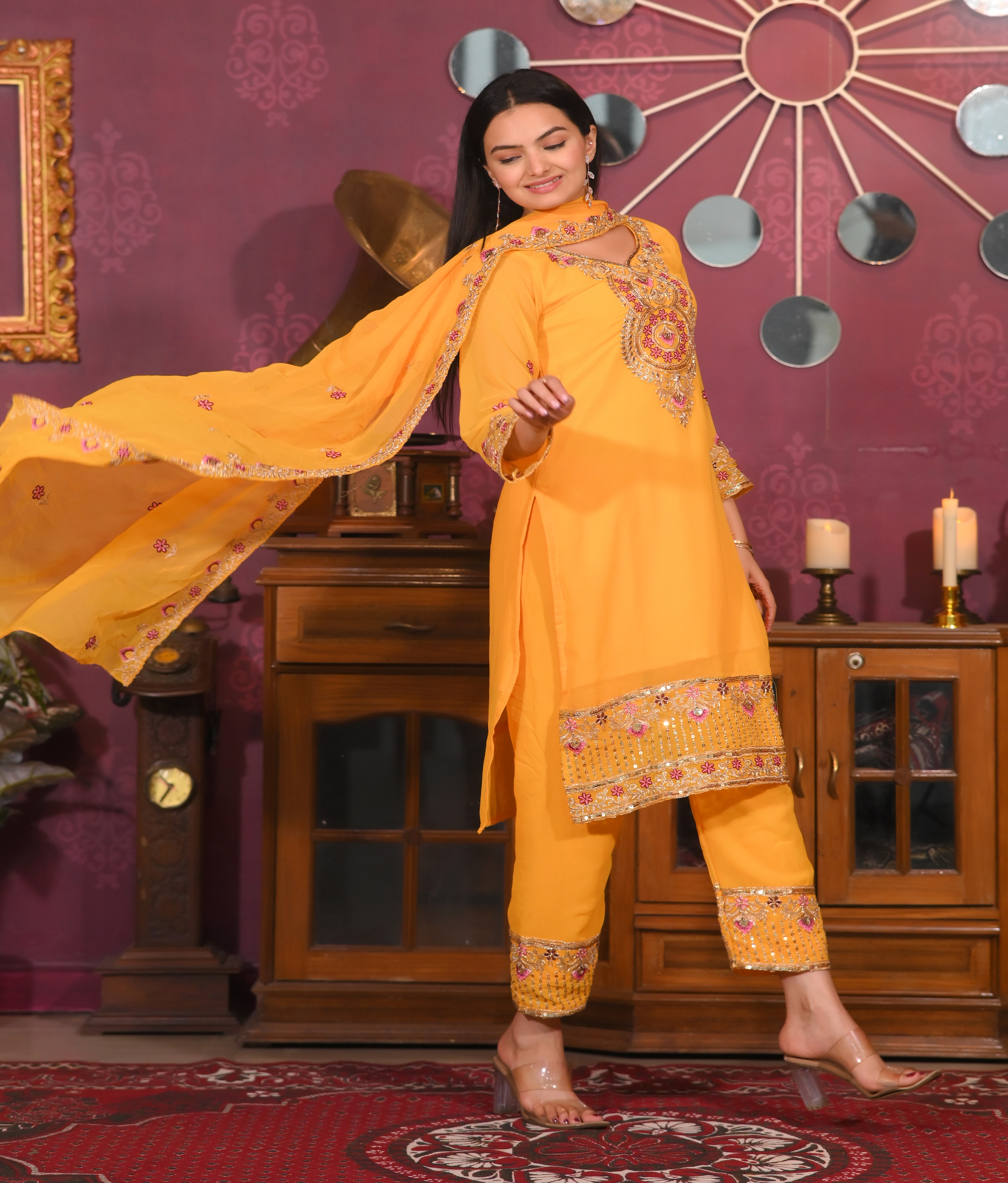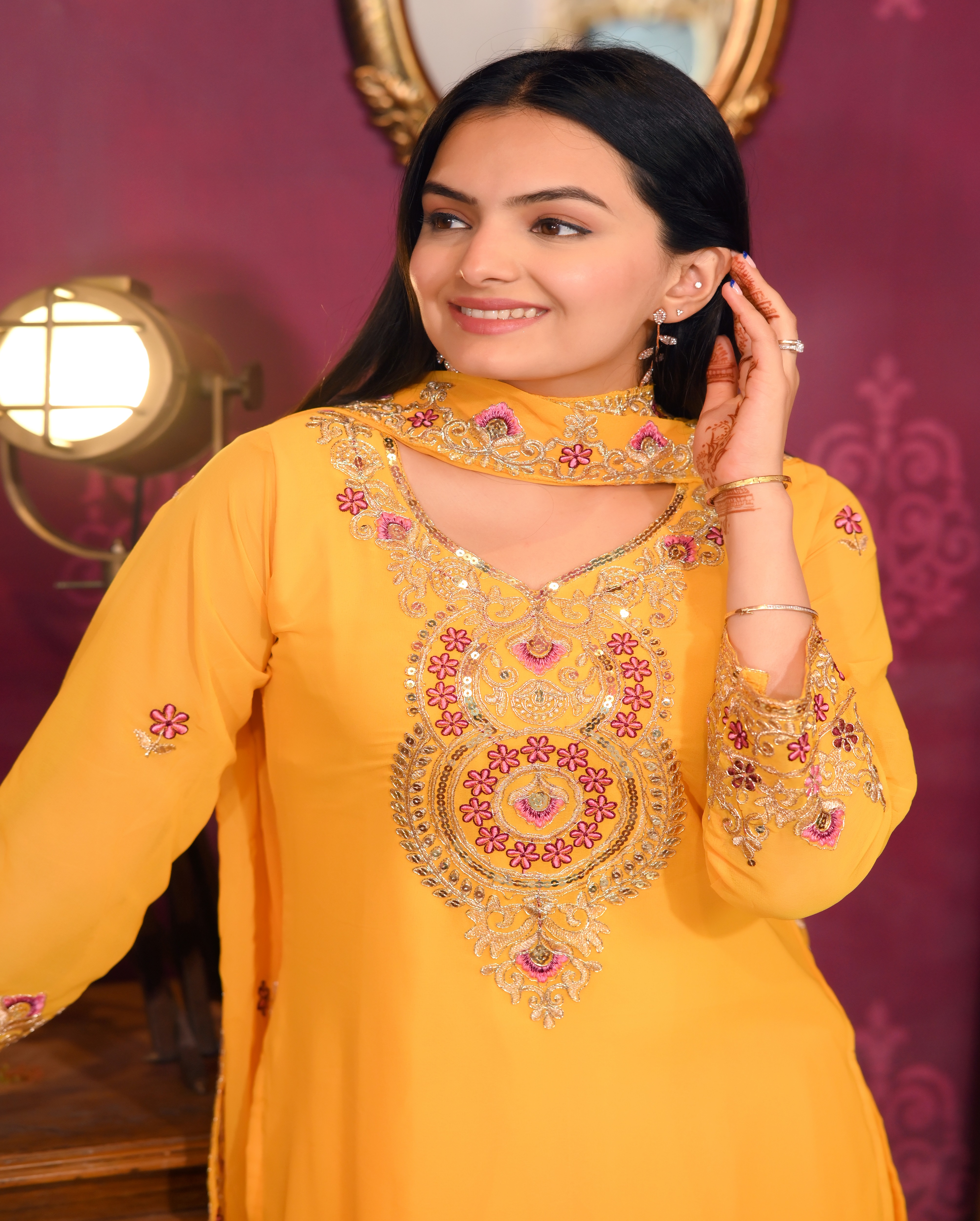 Top, Fabric : Fox Georgette, Inner : Micro, Work : Sequence Embroidery Work, Top length : 46 inch, Stich : S(36), M(38), L(40), XL(42), XXL(44), Pent, Fabric: Fox Georgette, Inner : micro, Stich :- Full Stich With Elastic, Bottom Length: 40 inch, Dupata, Fabric : Fox Georgette, Work. : Sequence Embroidery Work, Length : 2.2 meter.