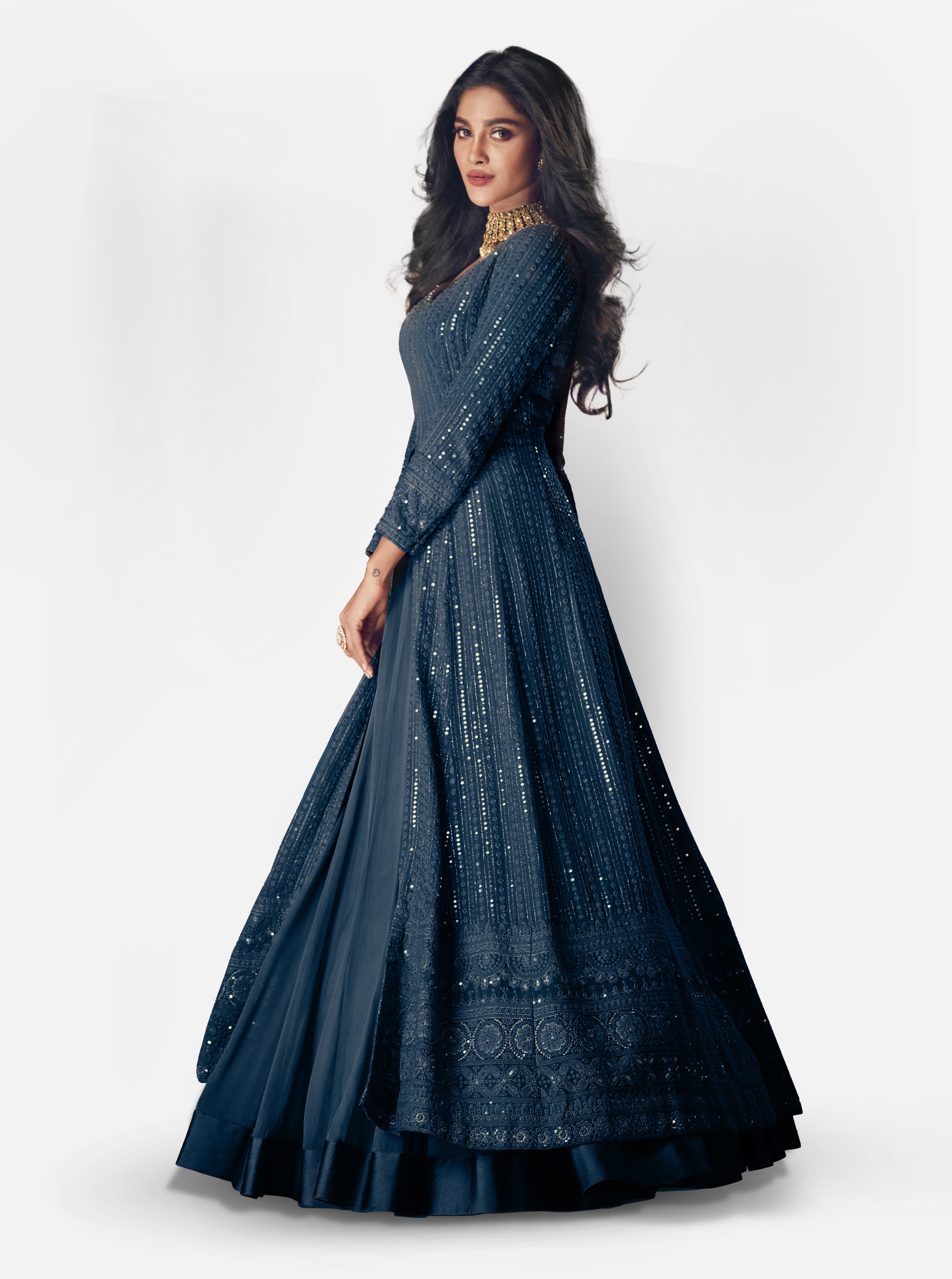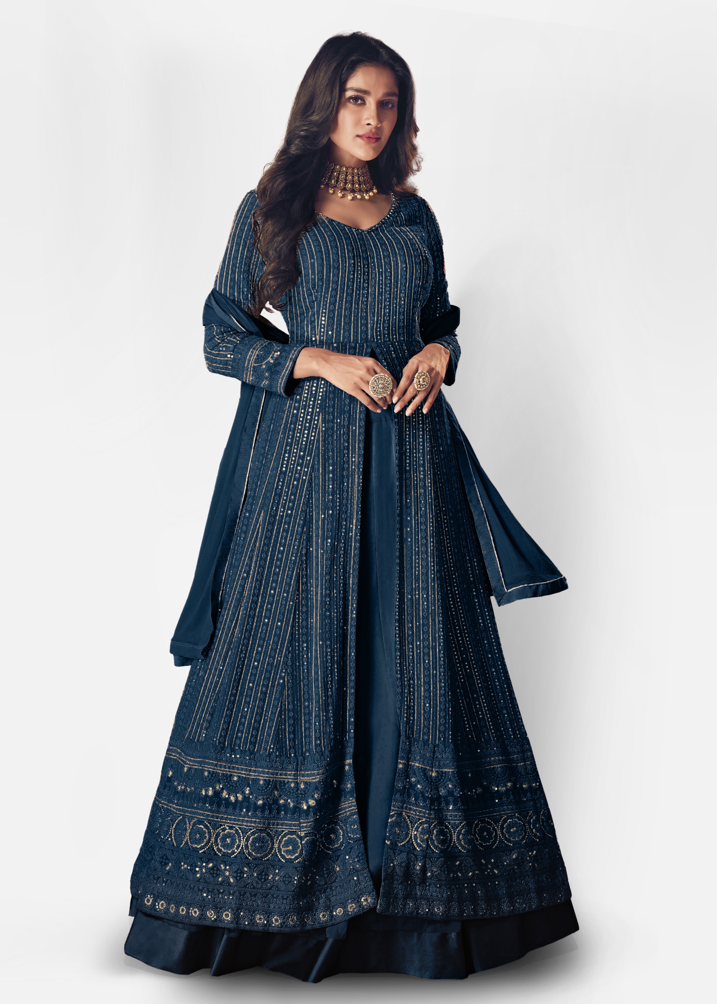 Top fabric :- Faux Georgette, Bottom fabric :- Santoon(2 Mtr), Inner :- Santoon(2 Mtr), Work :- Thread And Sequins Embroidered Work, Duppta fabric :- Nazneen(2.2mtr).