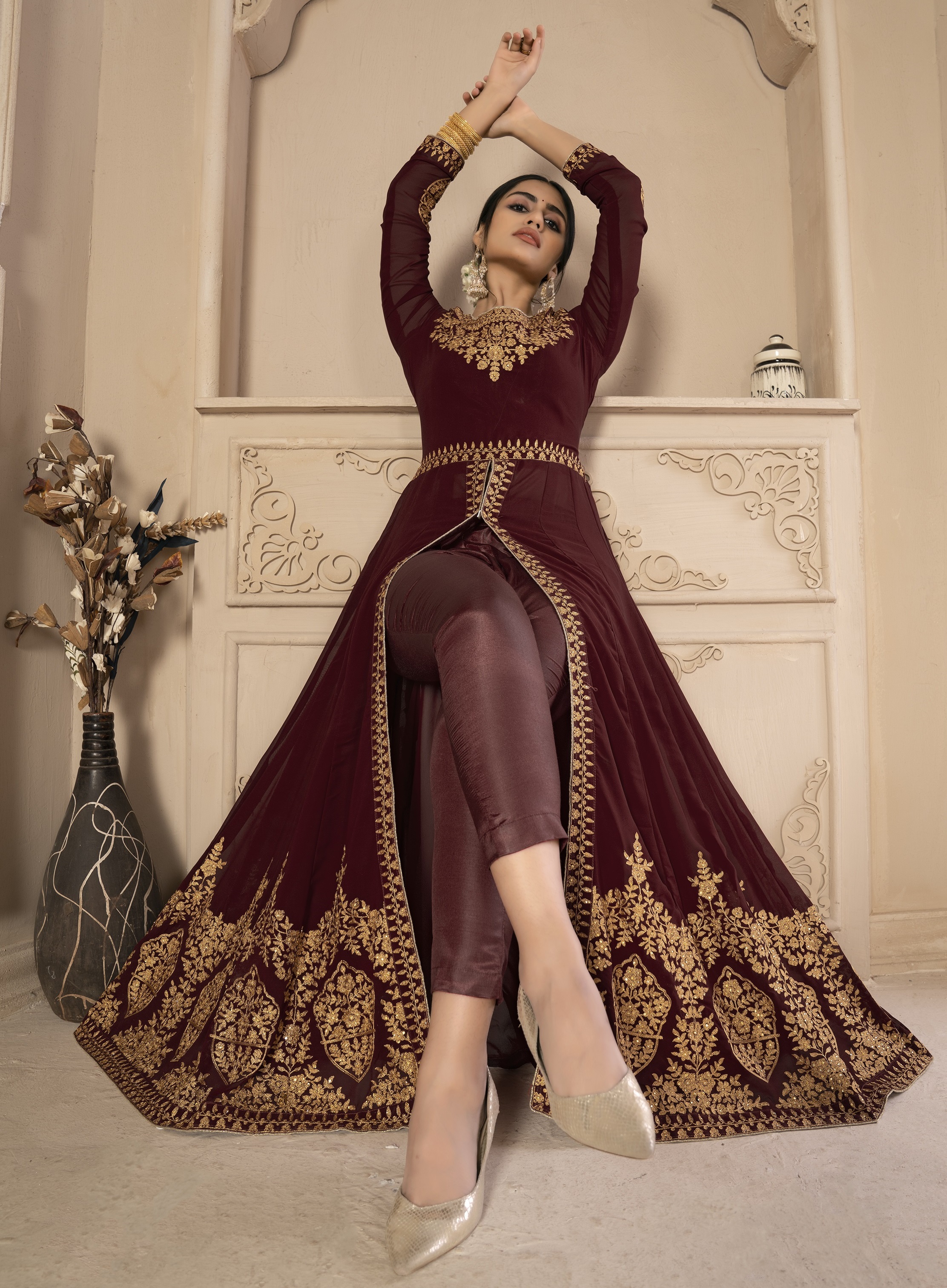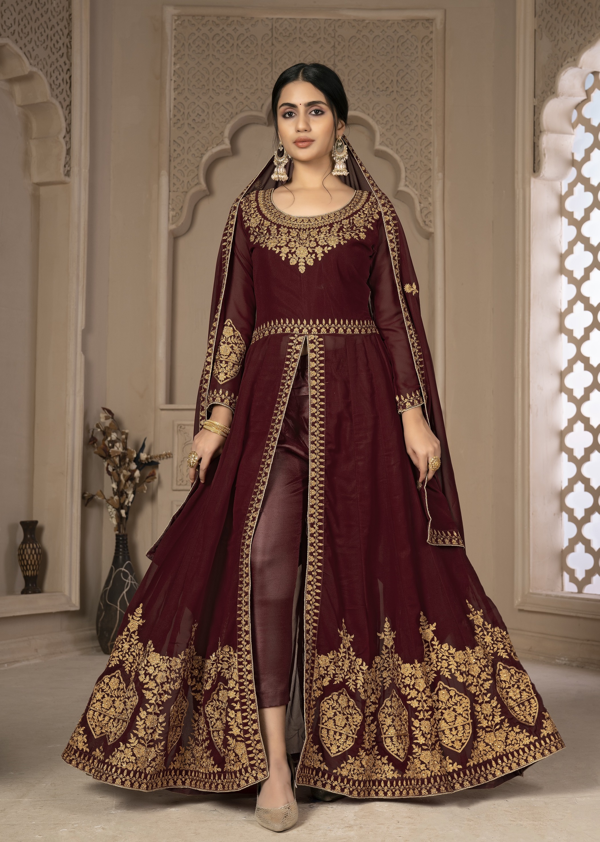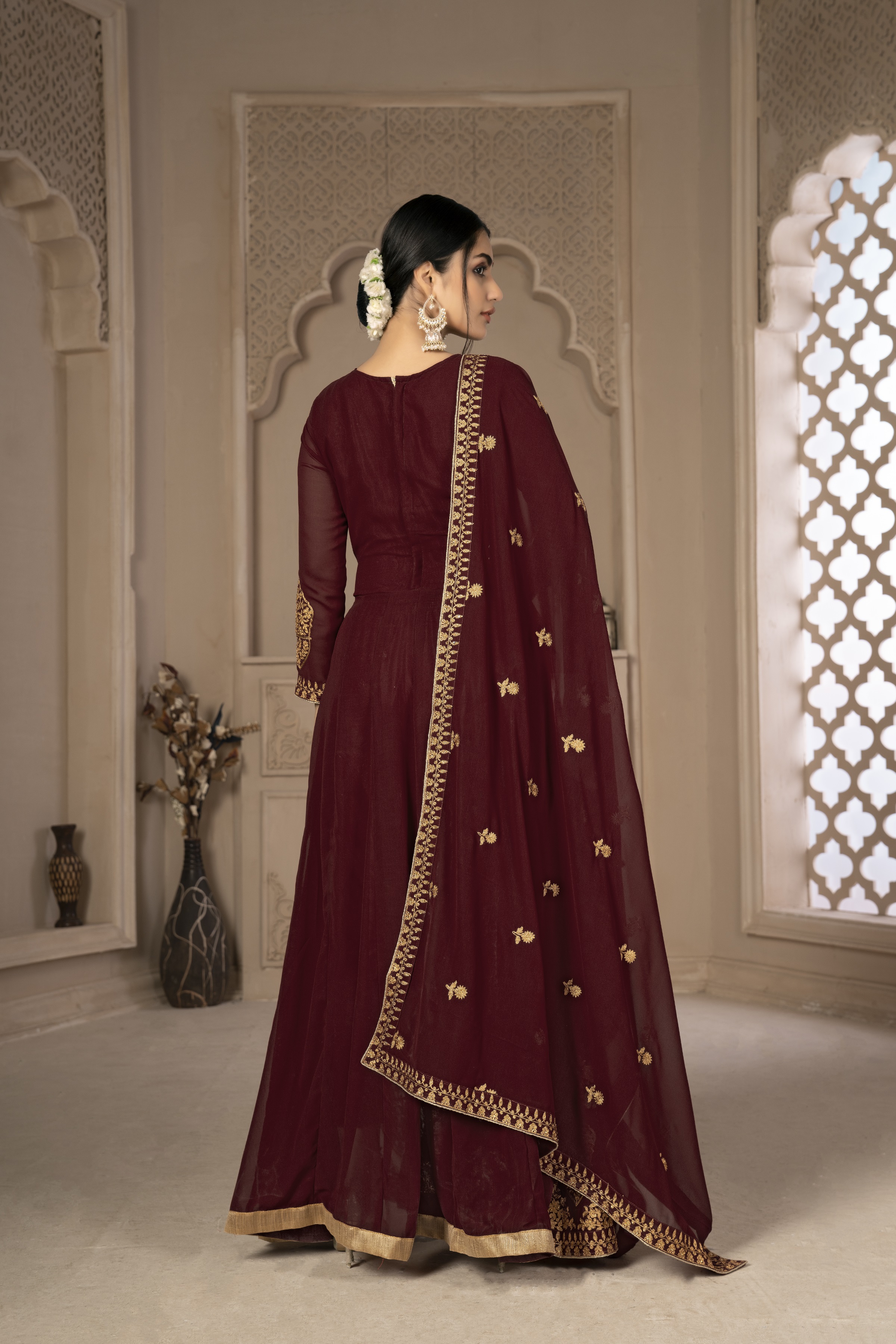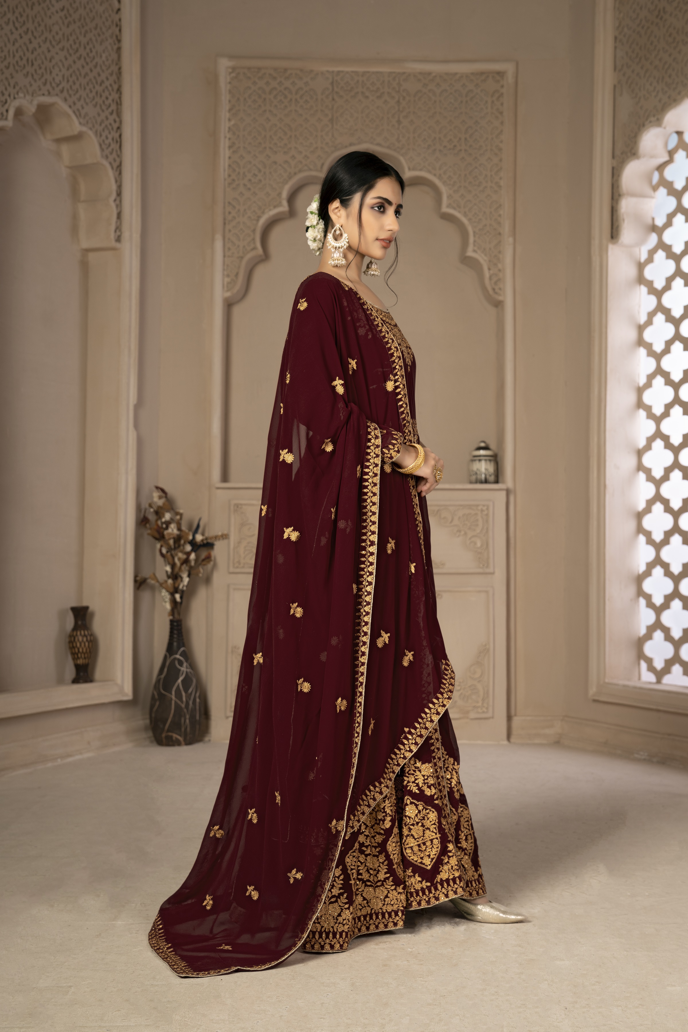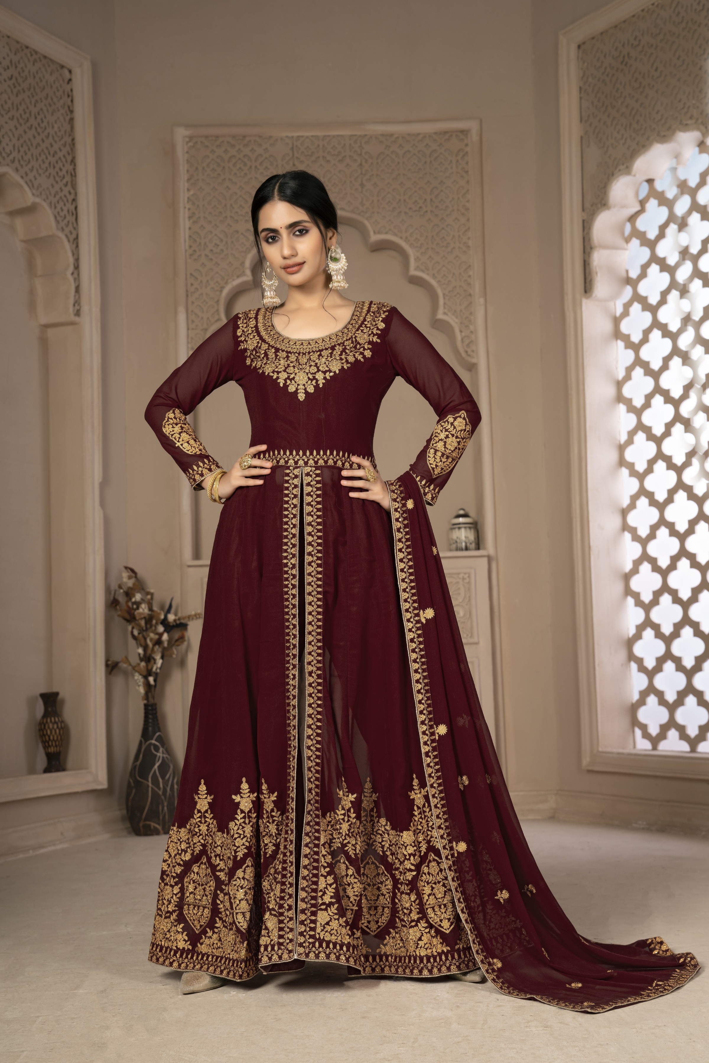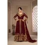 Designer Ethnic Suit Set with Dupatta Faux Georgette Fabric Zari Embroidered With Diamond Work for Women – Maroon Color