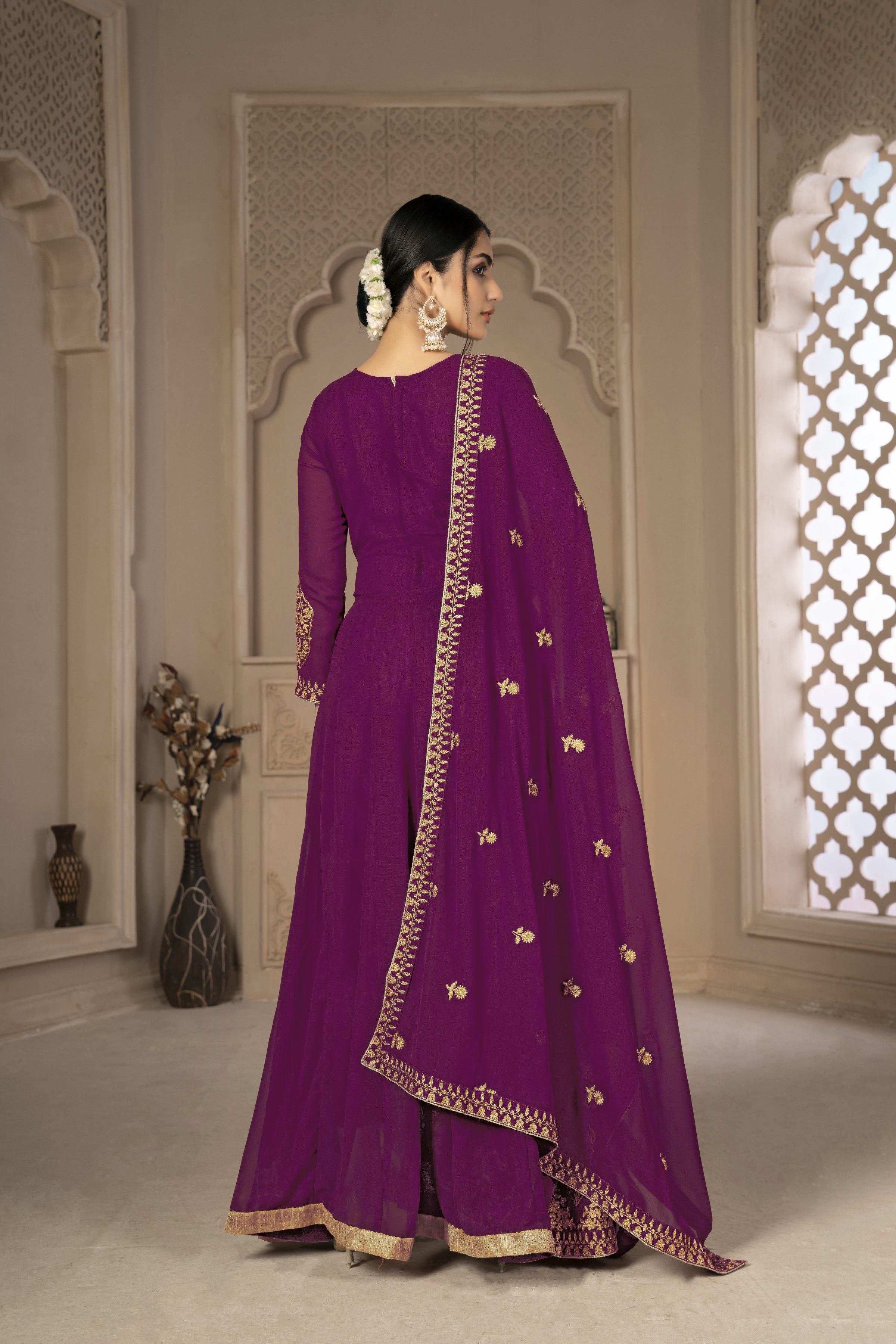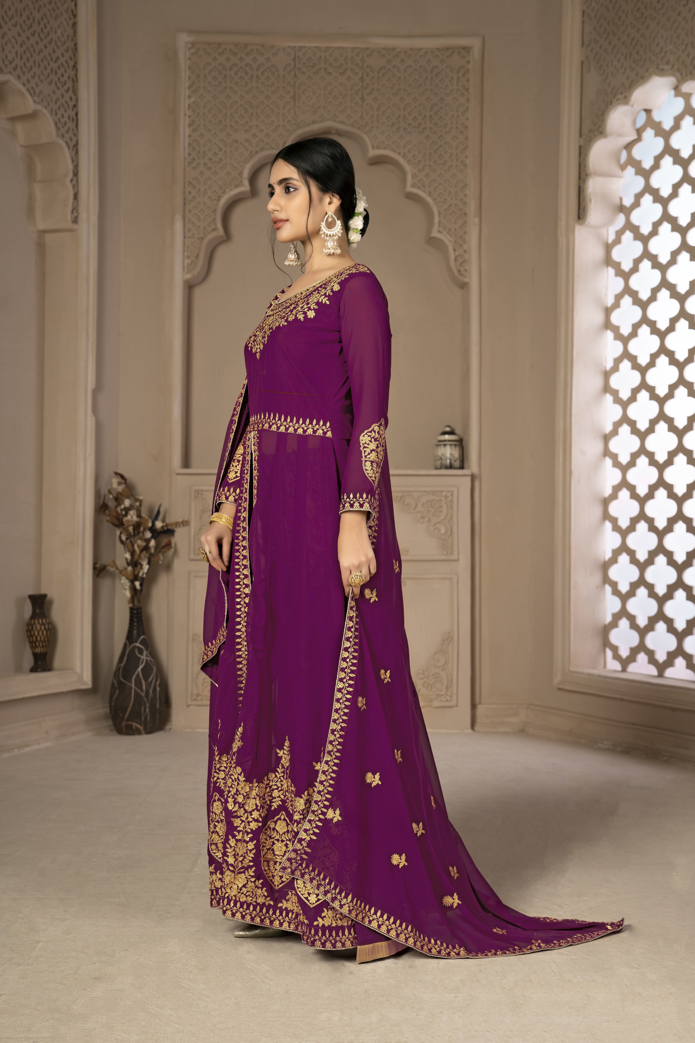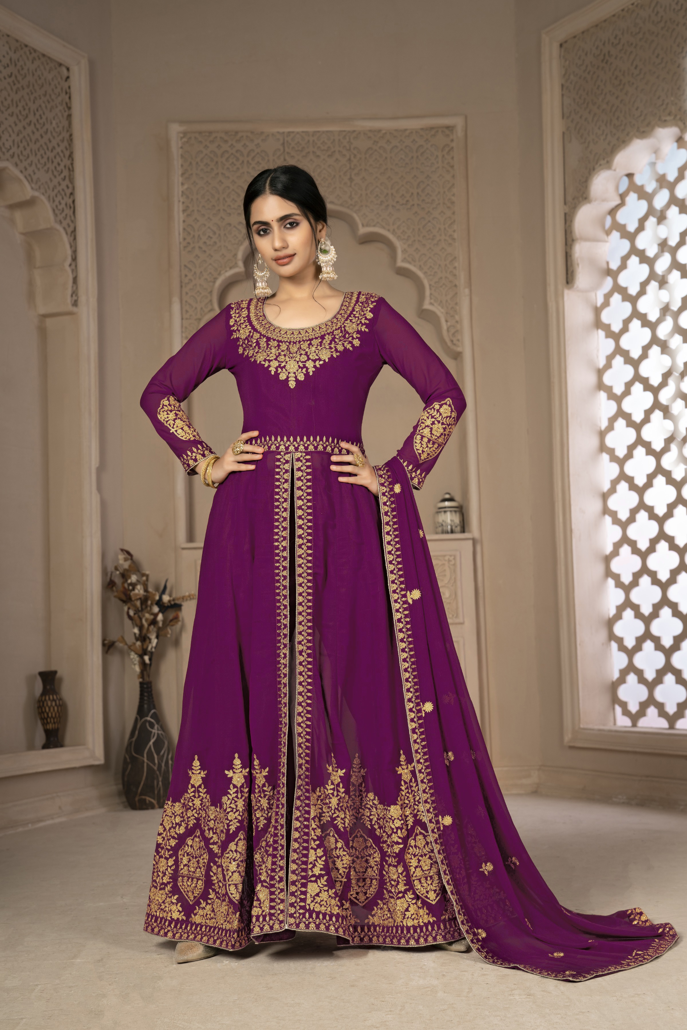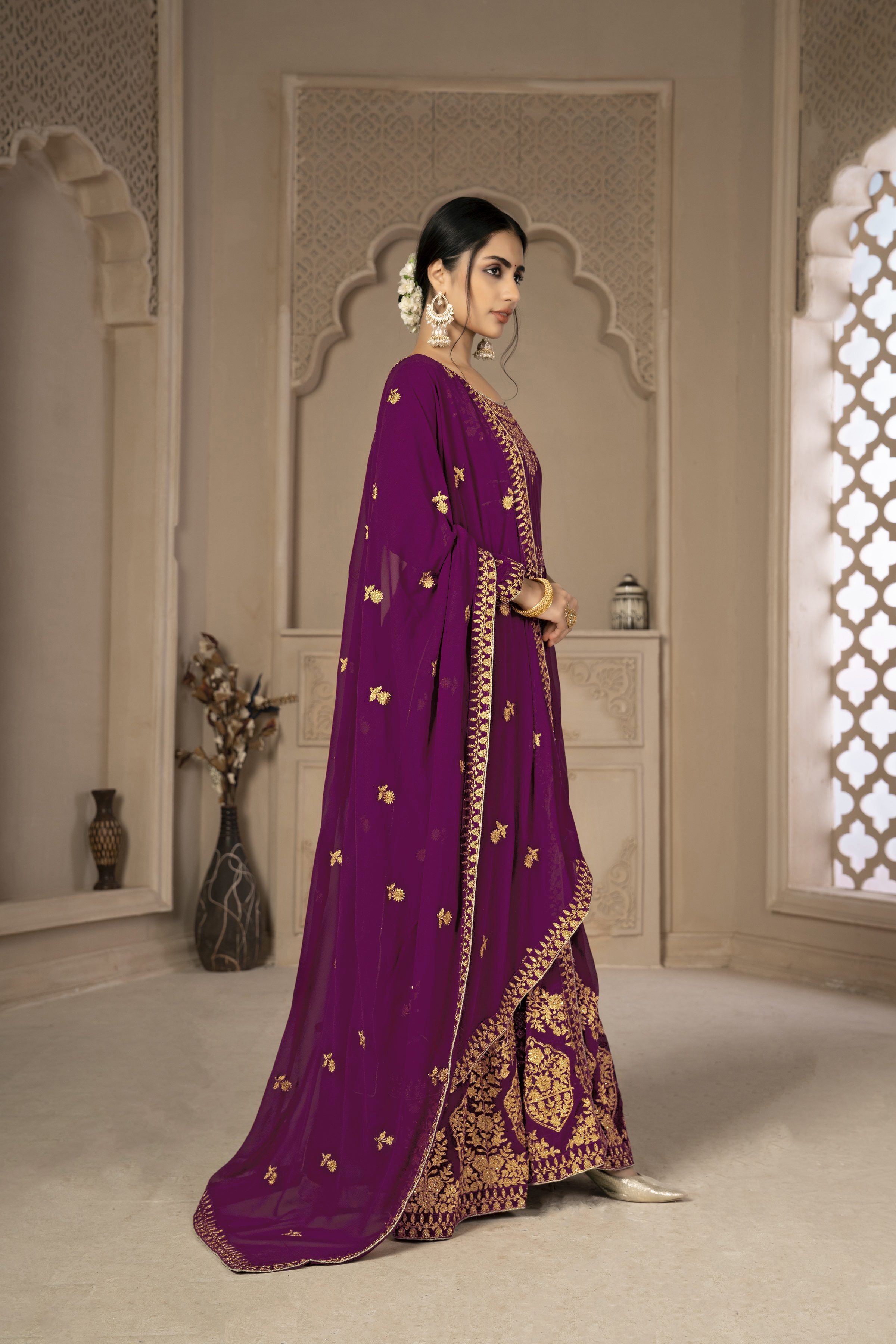 Designer Ethnic Suit Set with Dupatta Faux Georgette Fabric Zari Embroidered With Diamond Work for Women – Purple Color