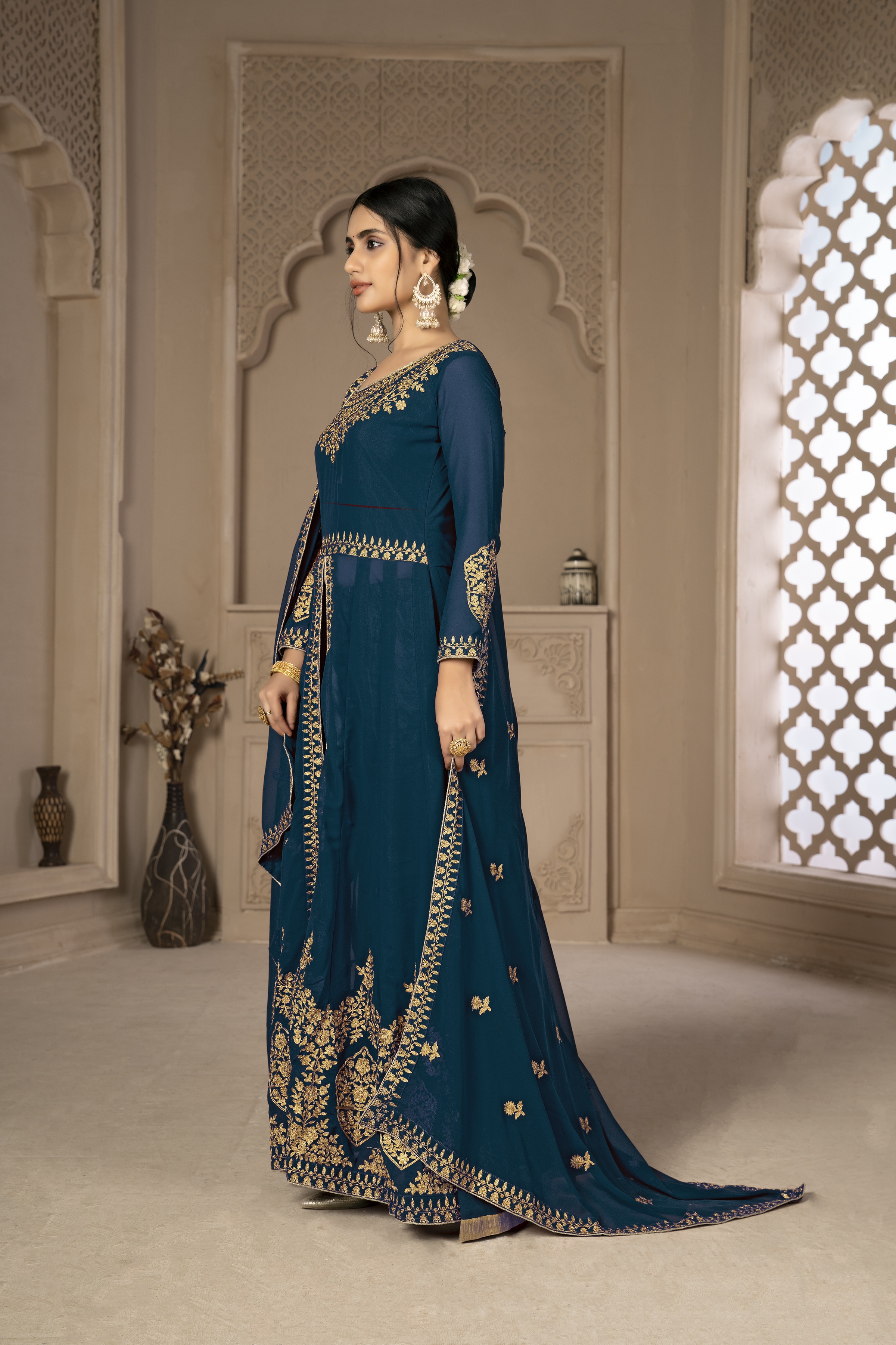 Designer Ethnic Suit Set with Dupatta Faux Georgette Fabric Zari Embroidered With Diamond Work for Women – Rama Color