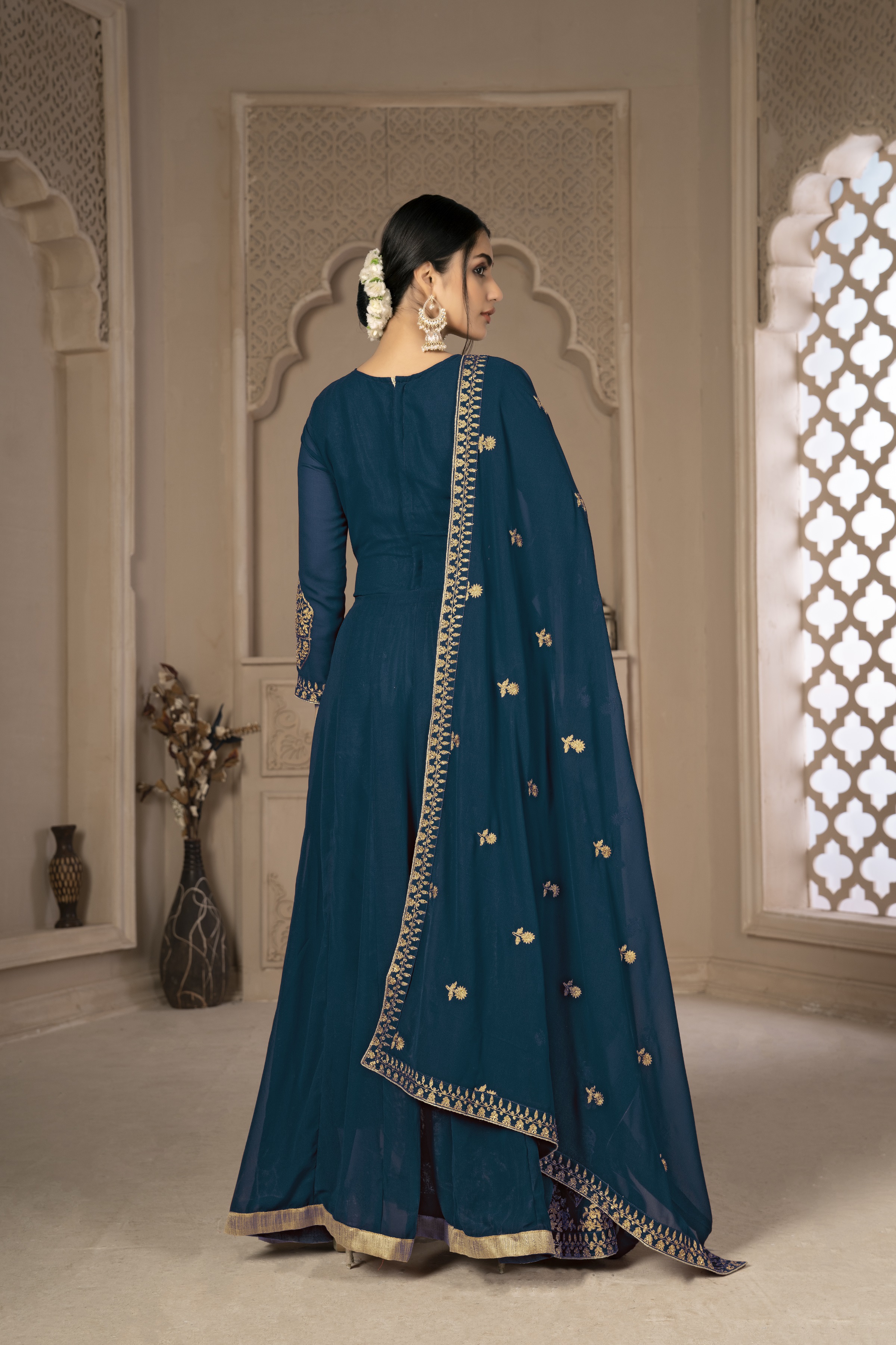 Top fabric :- Faux Georgette, Bottom fabric :- Santoon(2 Mtr), Inner :- Santoon(2 Mtr), Work :- Thread And Sequins Embroidered Work, Duppta fabric :- Faux Georgette(2.2mtr).