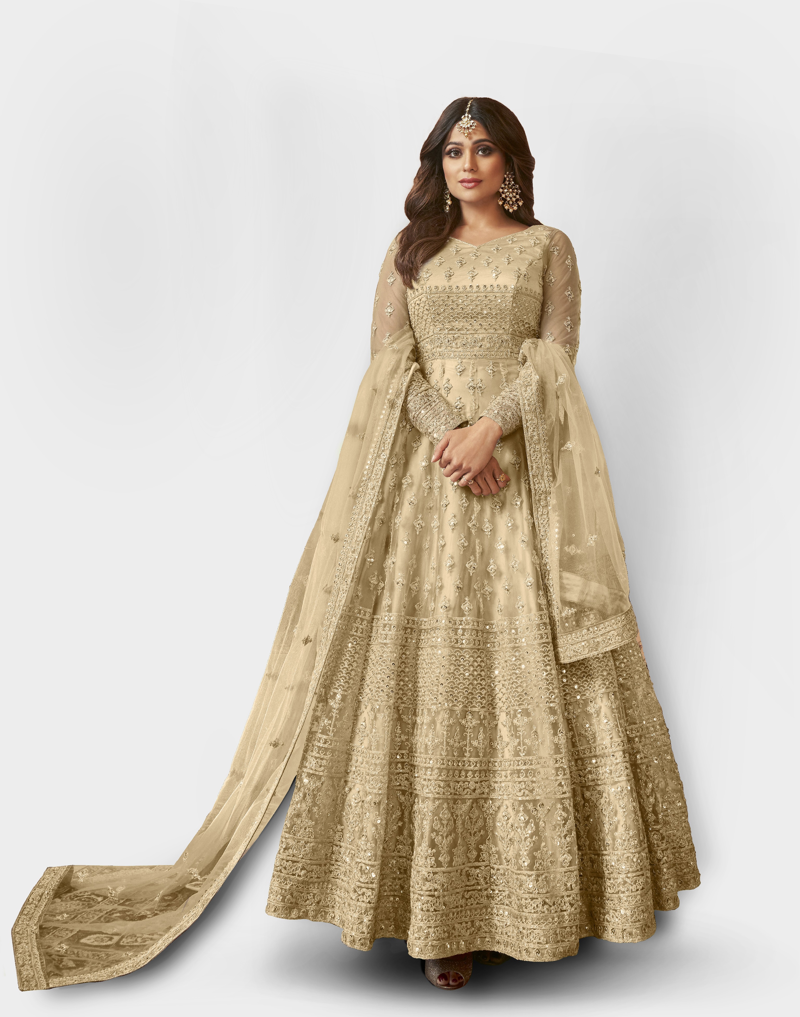 Designer Ethnic Suit Set with Dupatta Net Fabric Dori And Sequins Embroidered Wrok for Women – Cream Color
