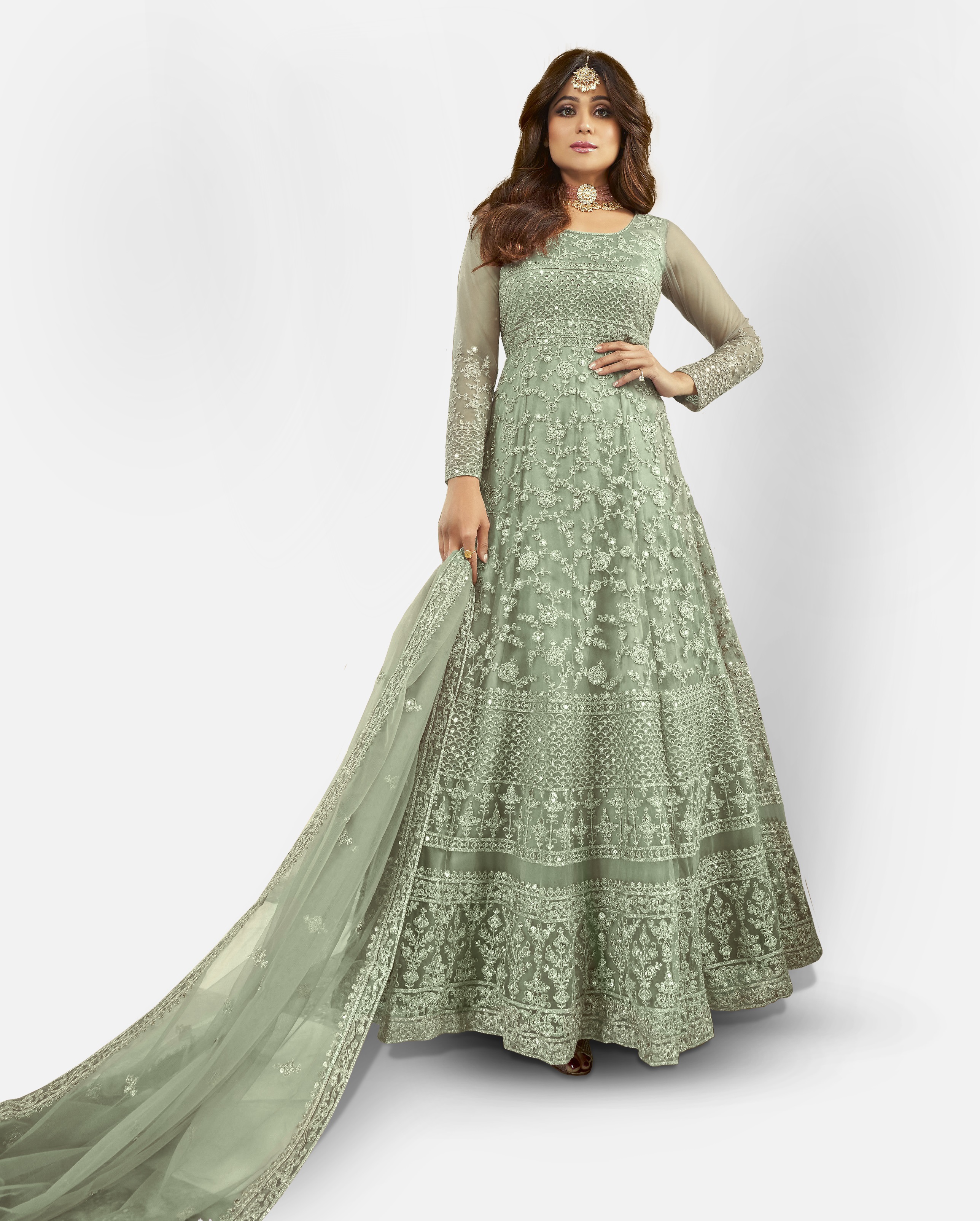 Designer Ethnic Suit Set with Dupatta Net Fabric Dori And Sequins Embroidered Wrok for Women – Green Color