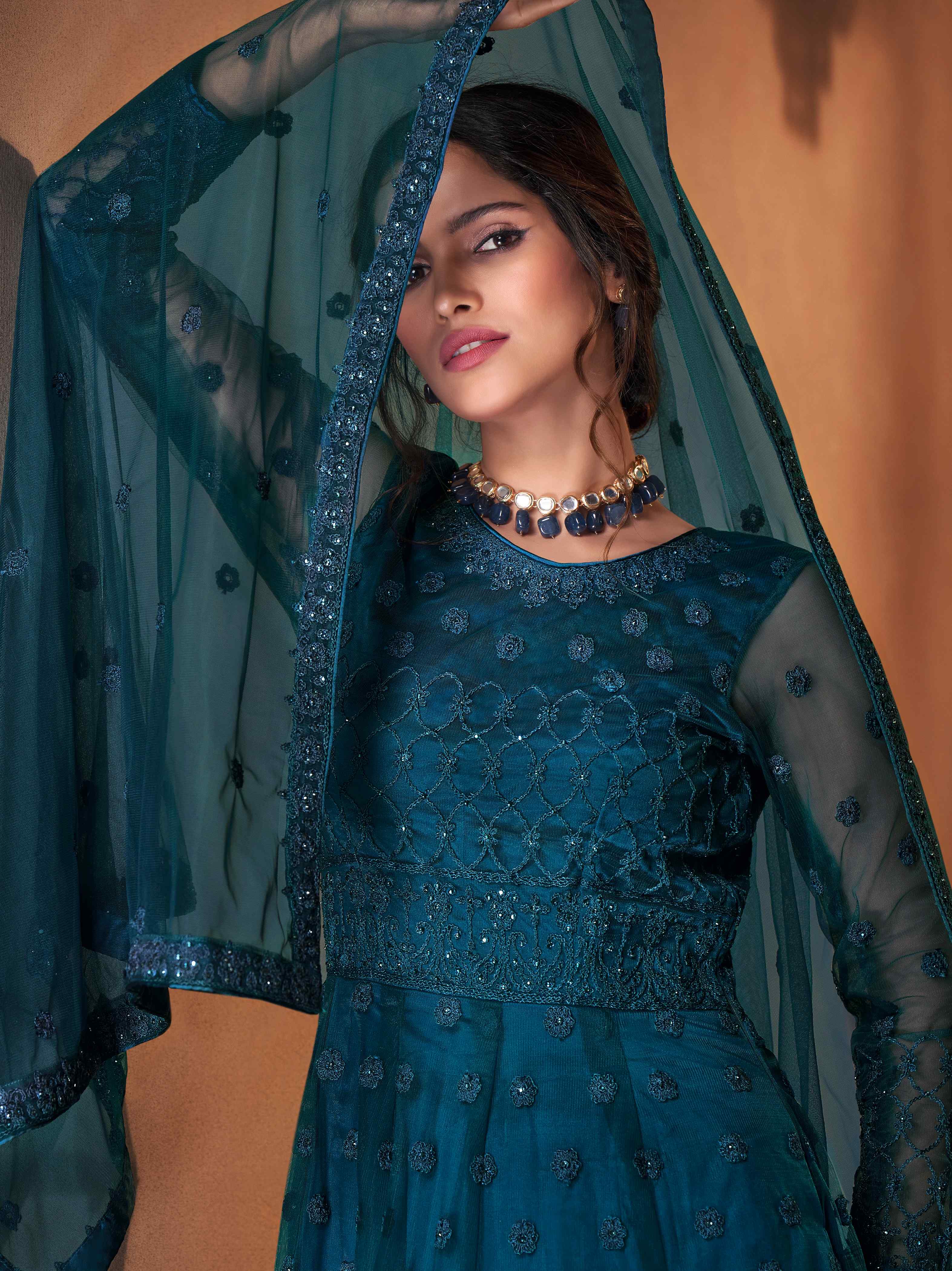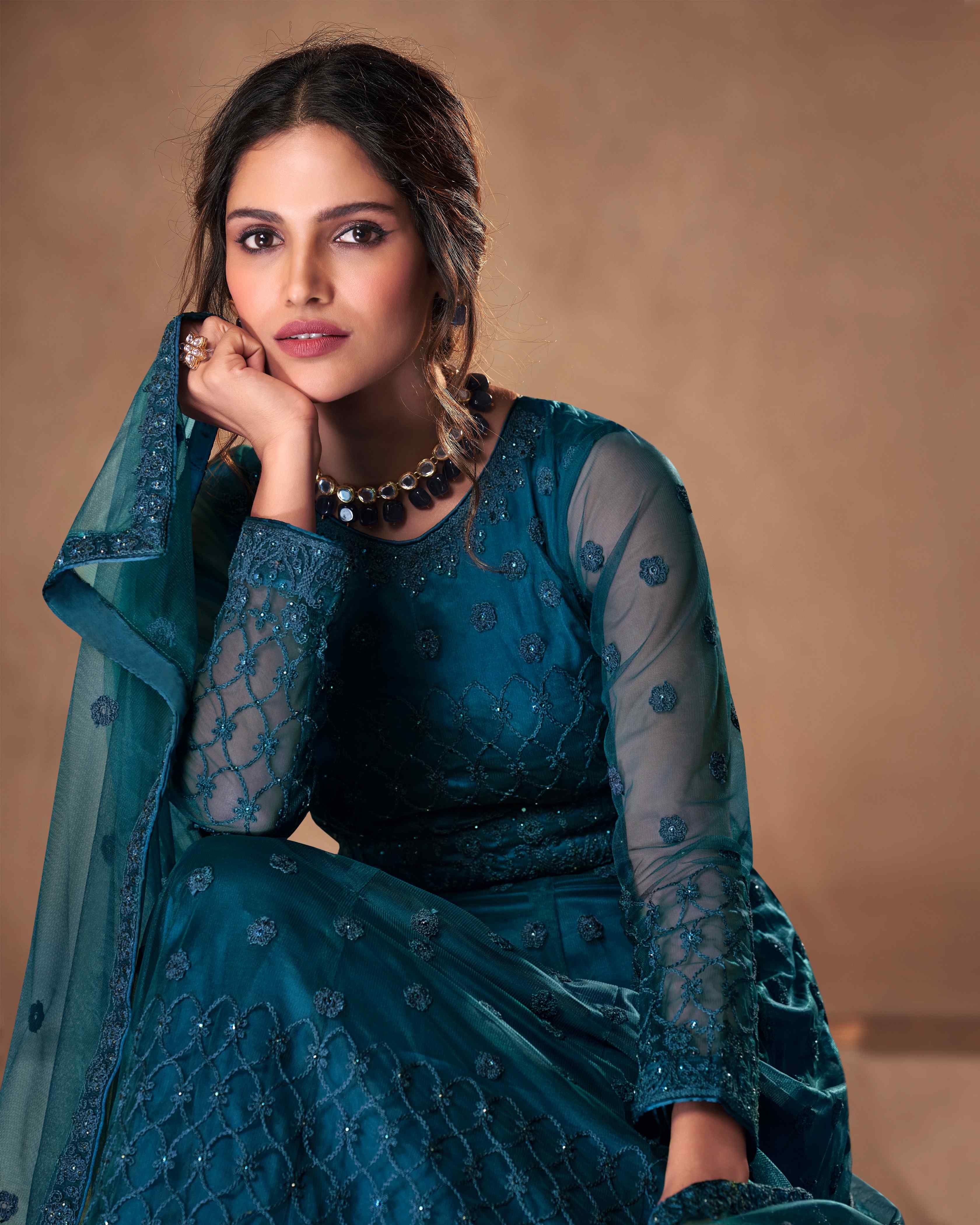 Designer Ethnic Suit Set with Dupatta Net Fabric Dori Embroidered With Diamond Work for Women – Rama Color