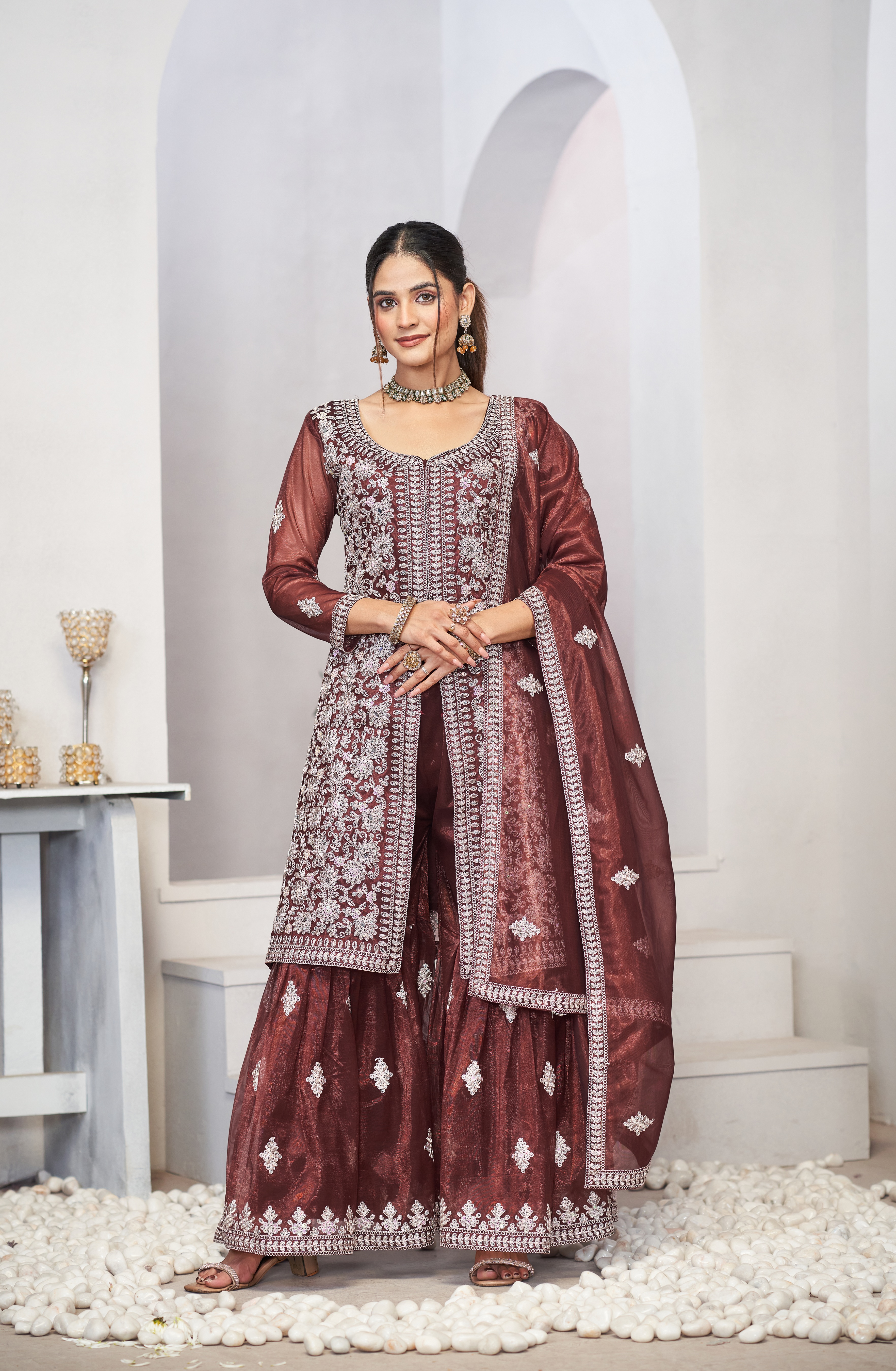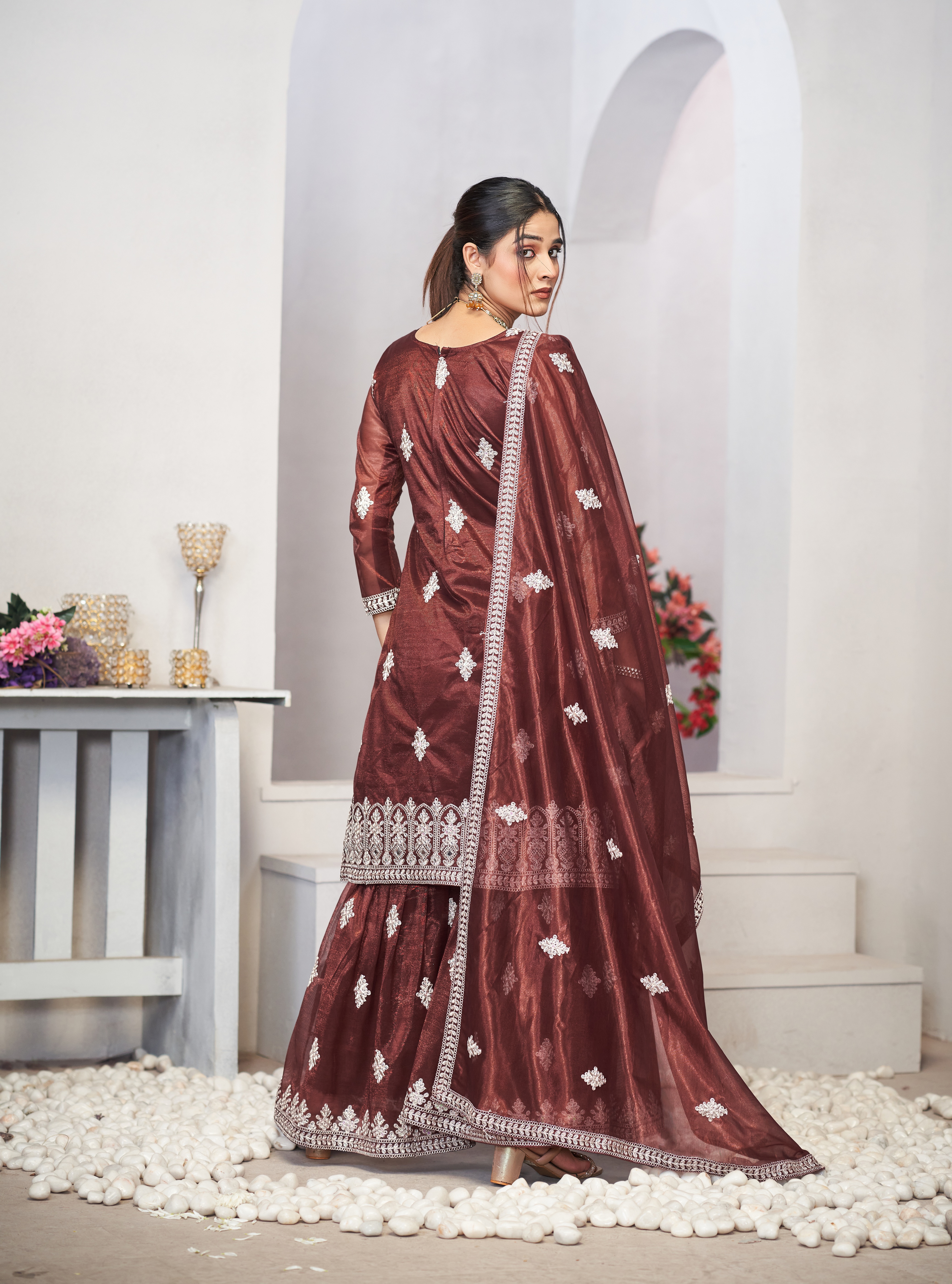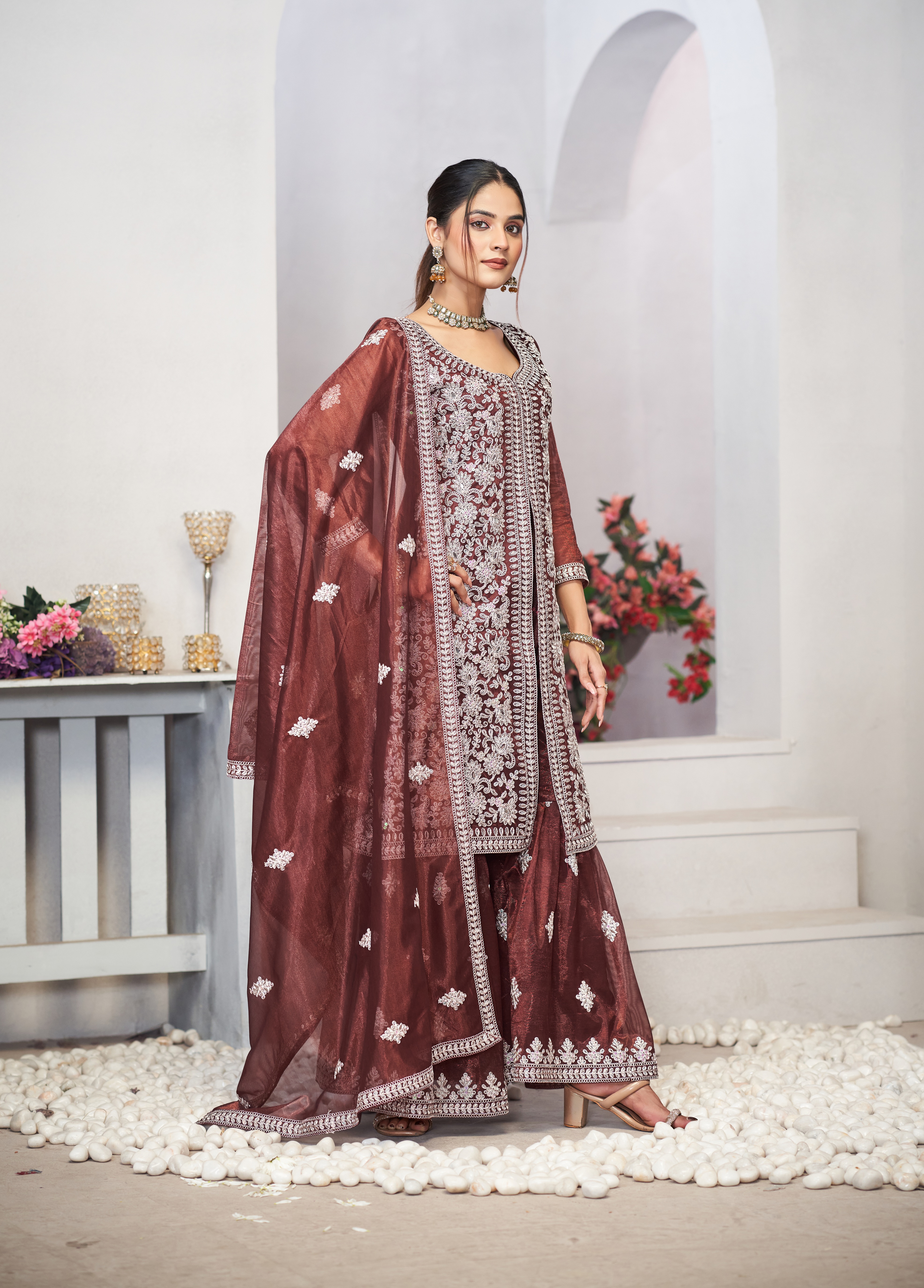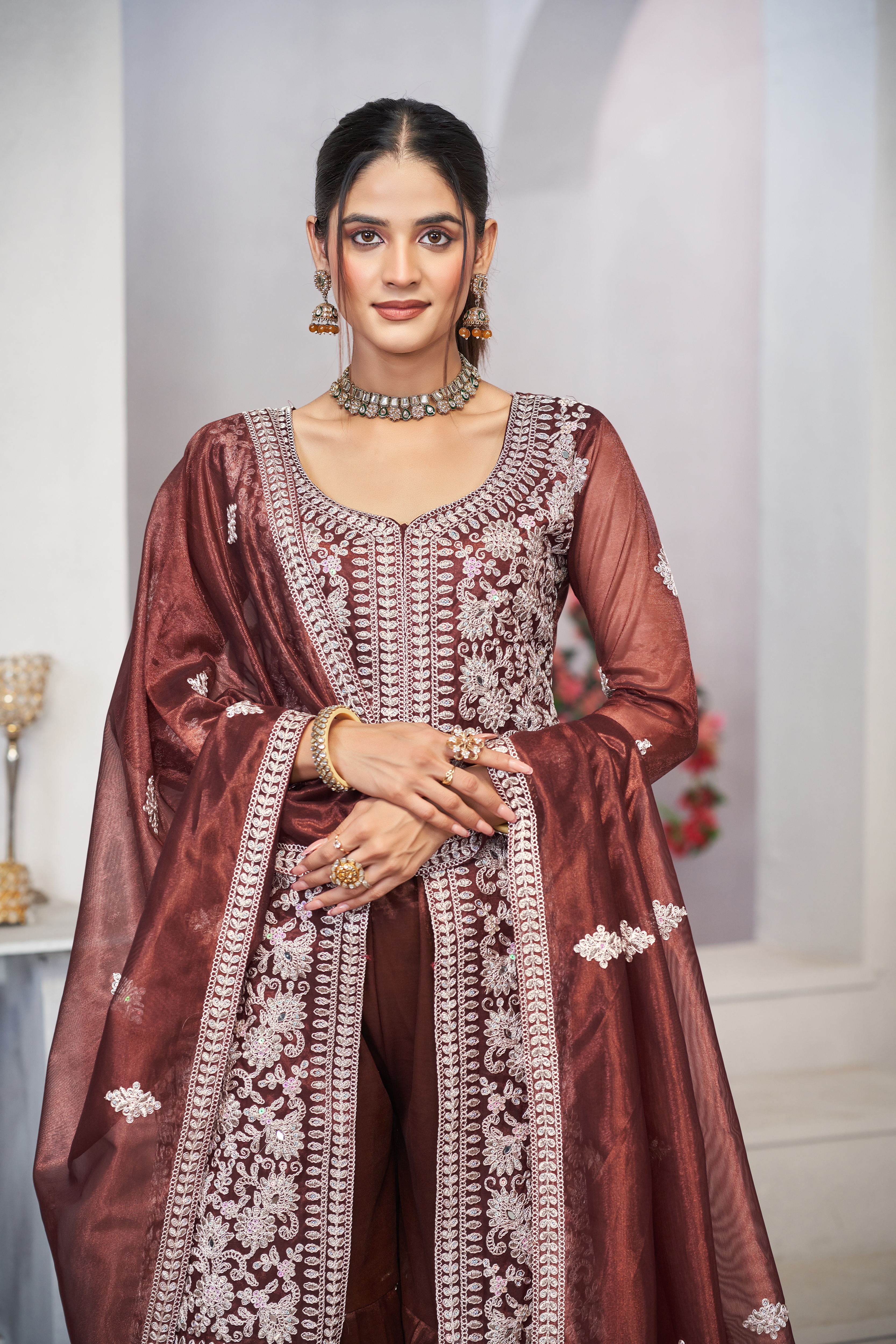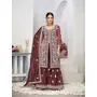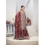 HomeFashionKurtas & Kurta SetsDesigner Ethnic Suit Set with Dupatta Twill Net (Semi Stitche Upto 44' Inch Bust) Fabric Zari Embroidered With Sequins & Real Mirror Work for Women – Brown Color