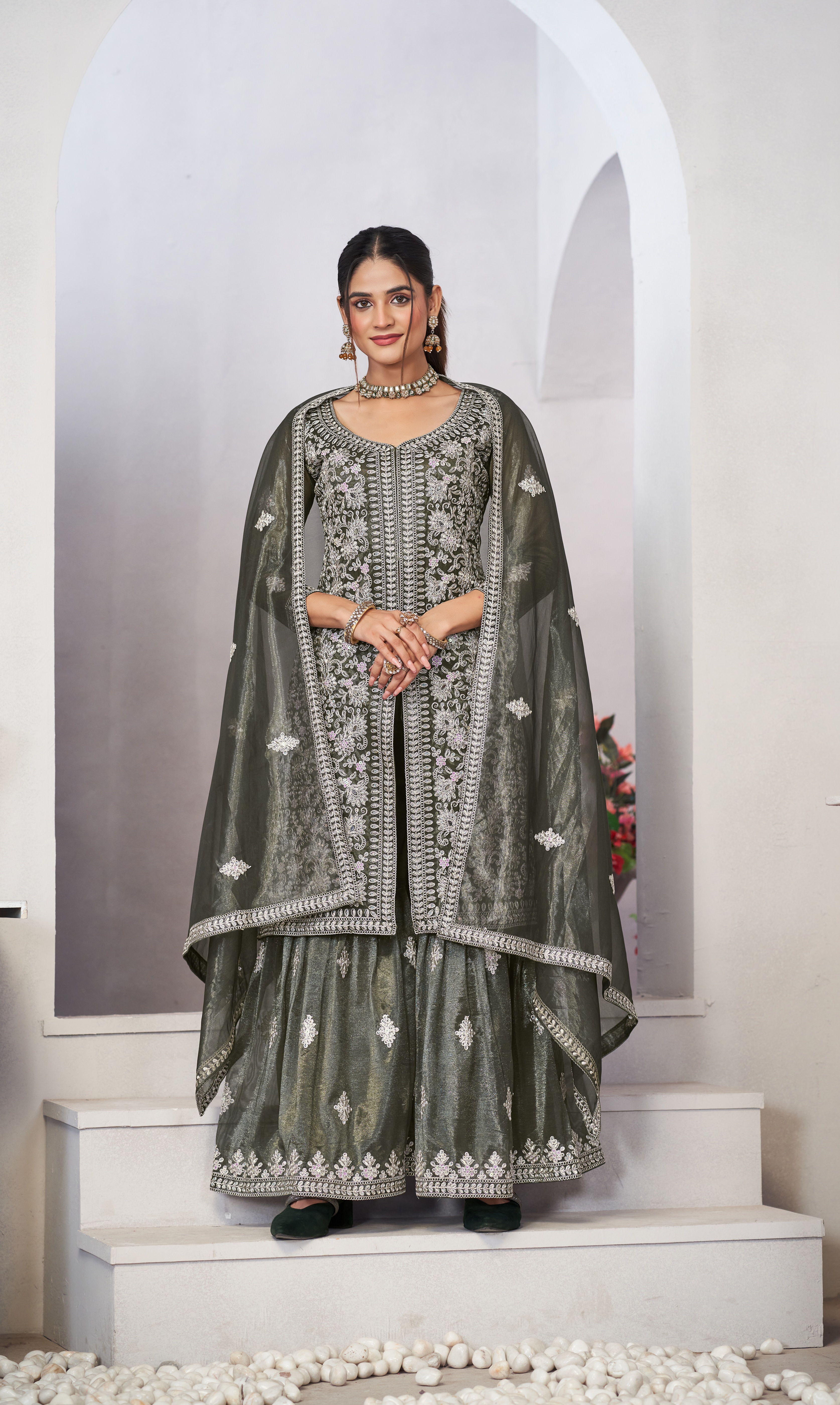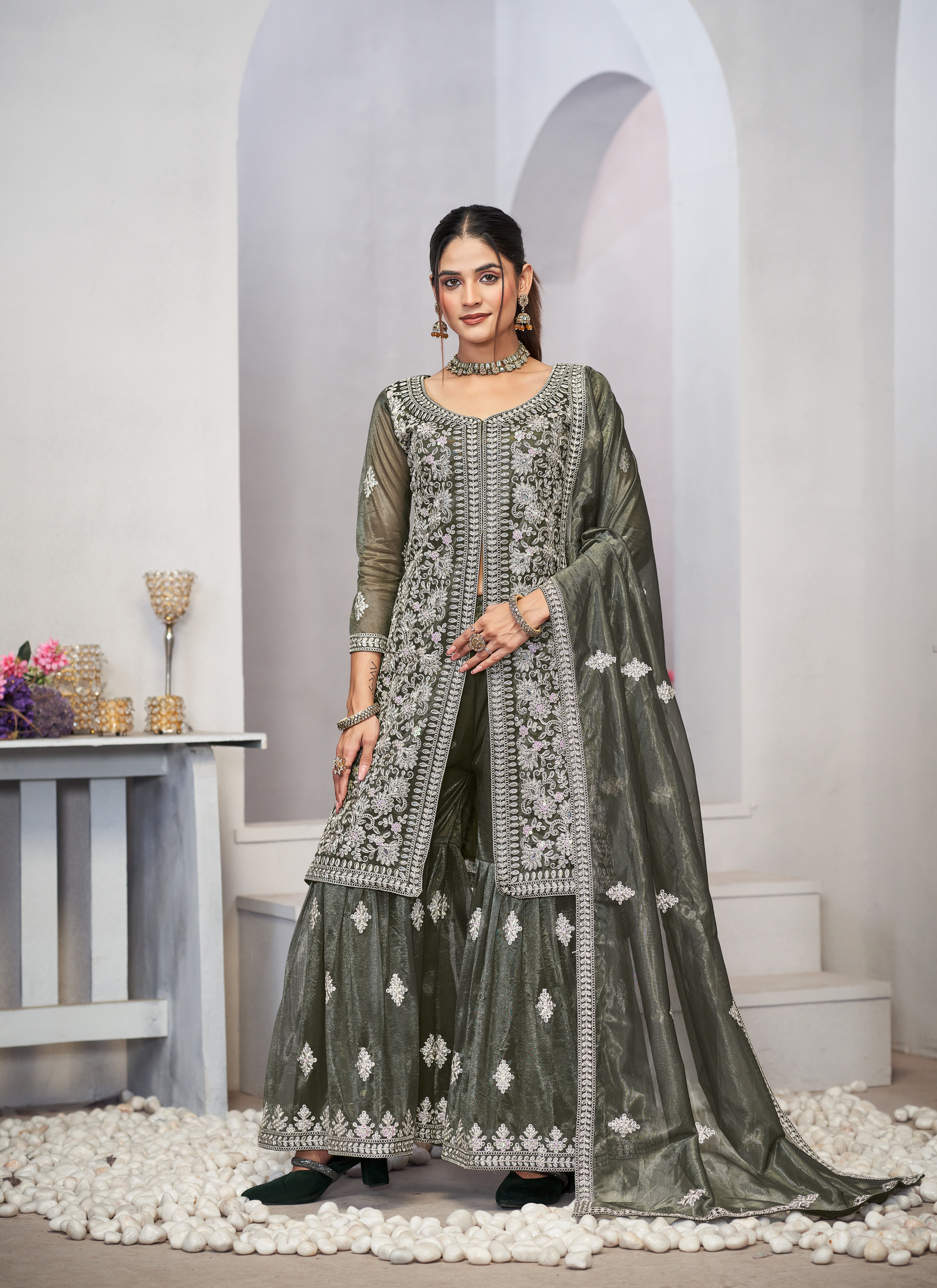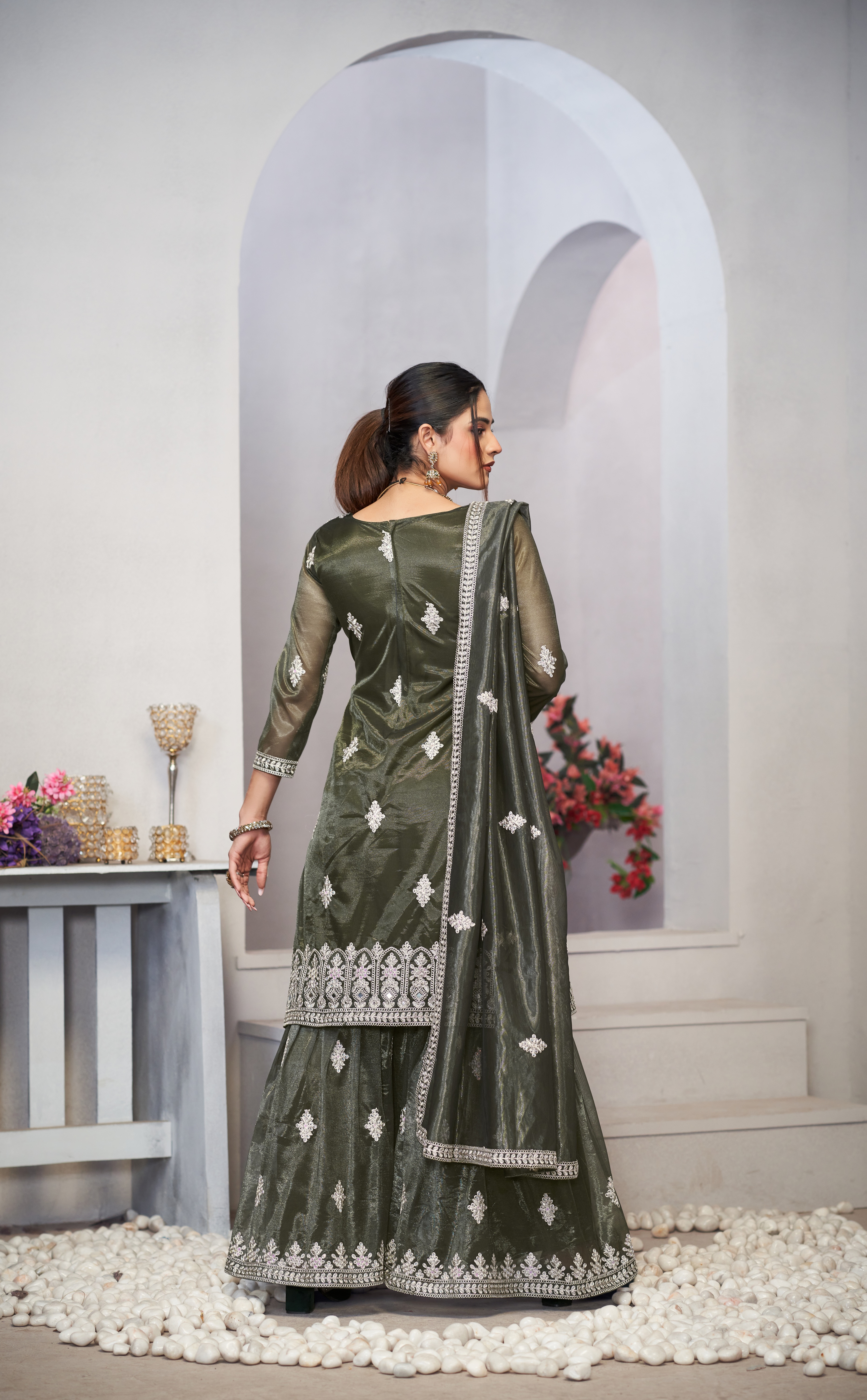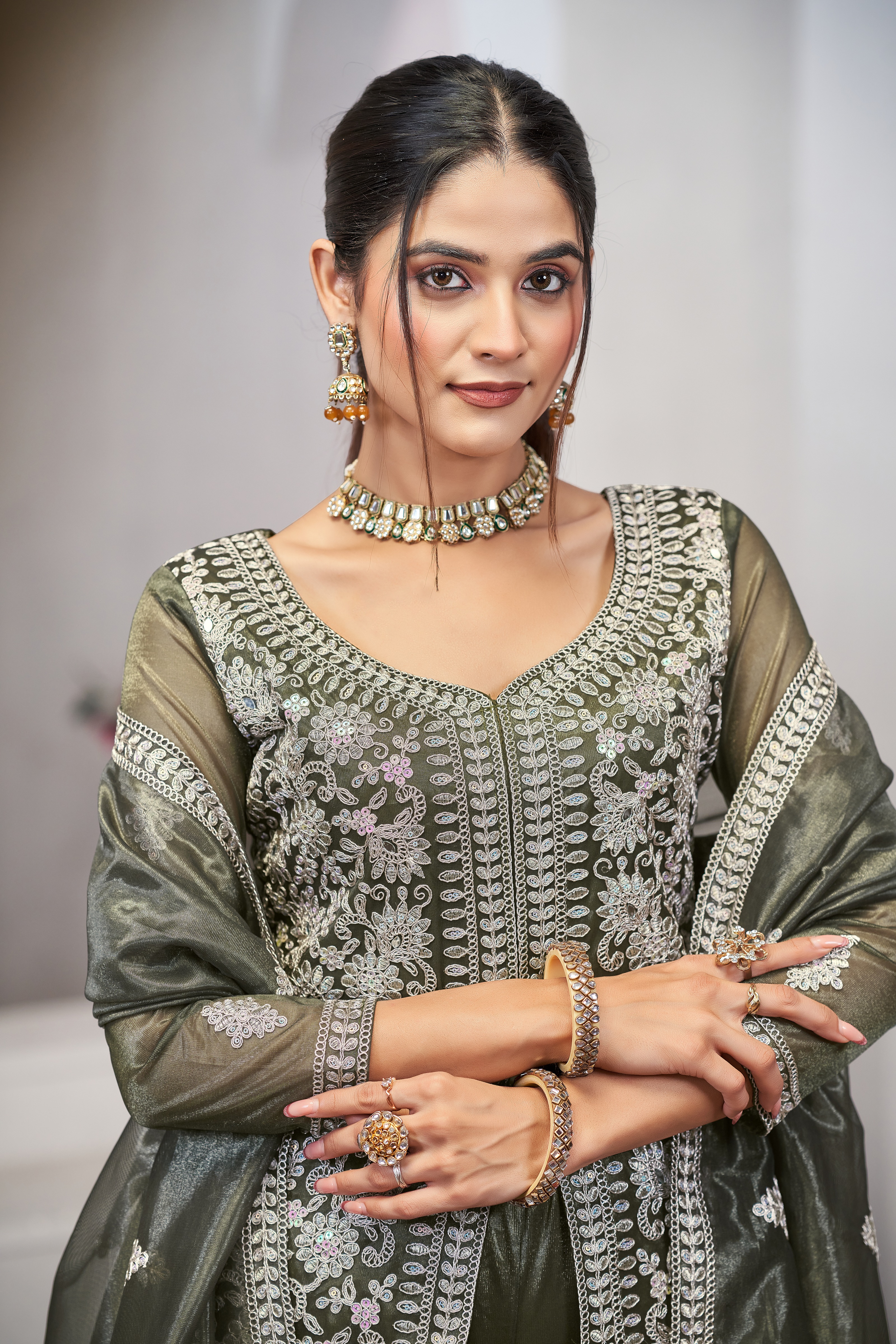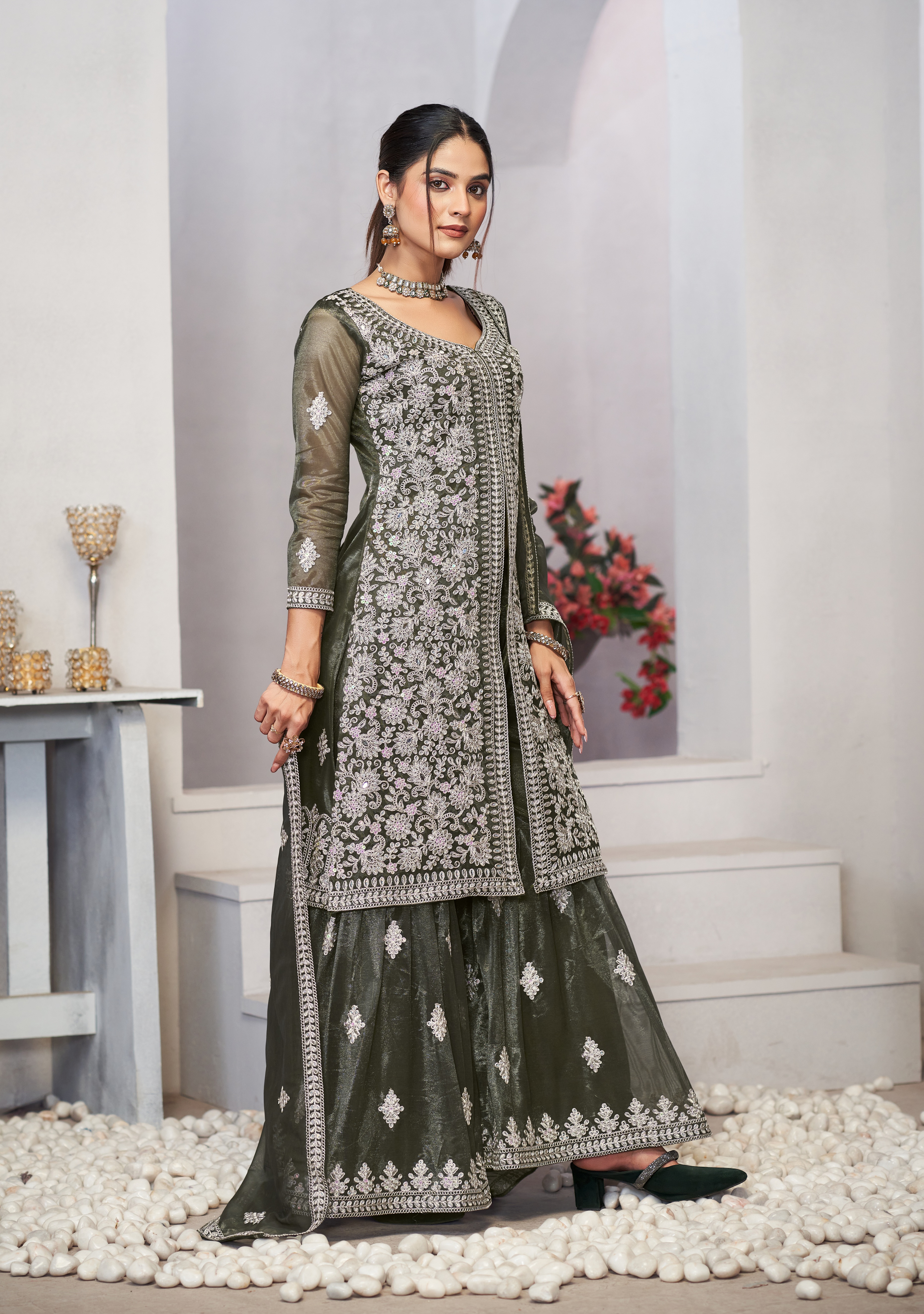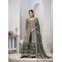 HomeFashionKurtas & Kurta SetsDesigner Ethnic Suit Set with Dupatta Twill Net (Semi Stitche Upto 44' Inch Bust) Fabric Zari Embroidered With Sequins & Real Mirror Work for Women – Olivegreen Color