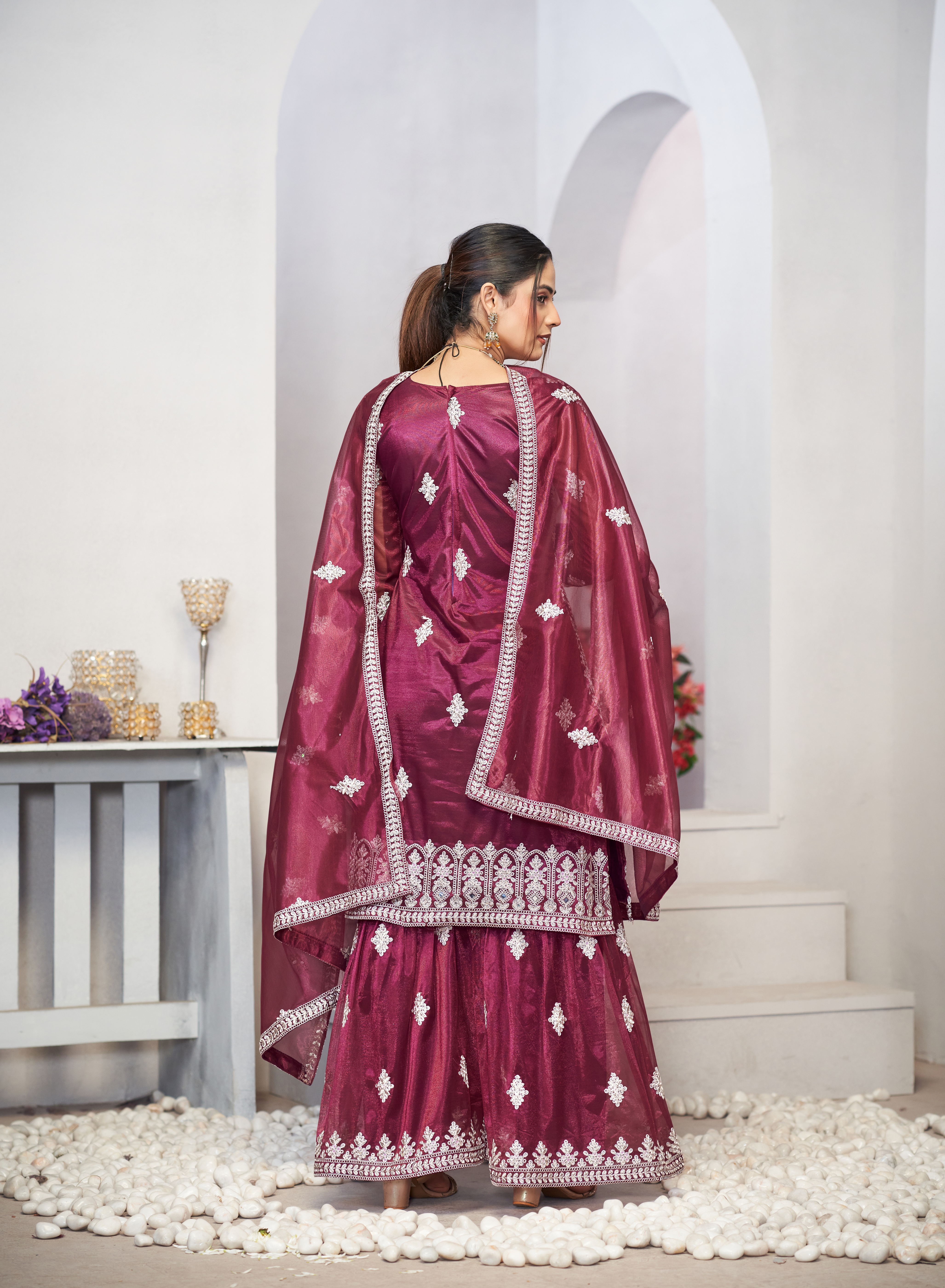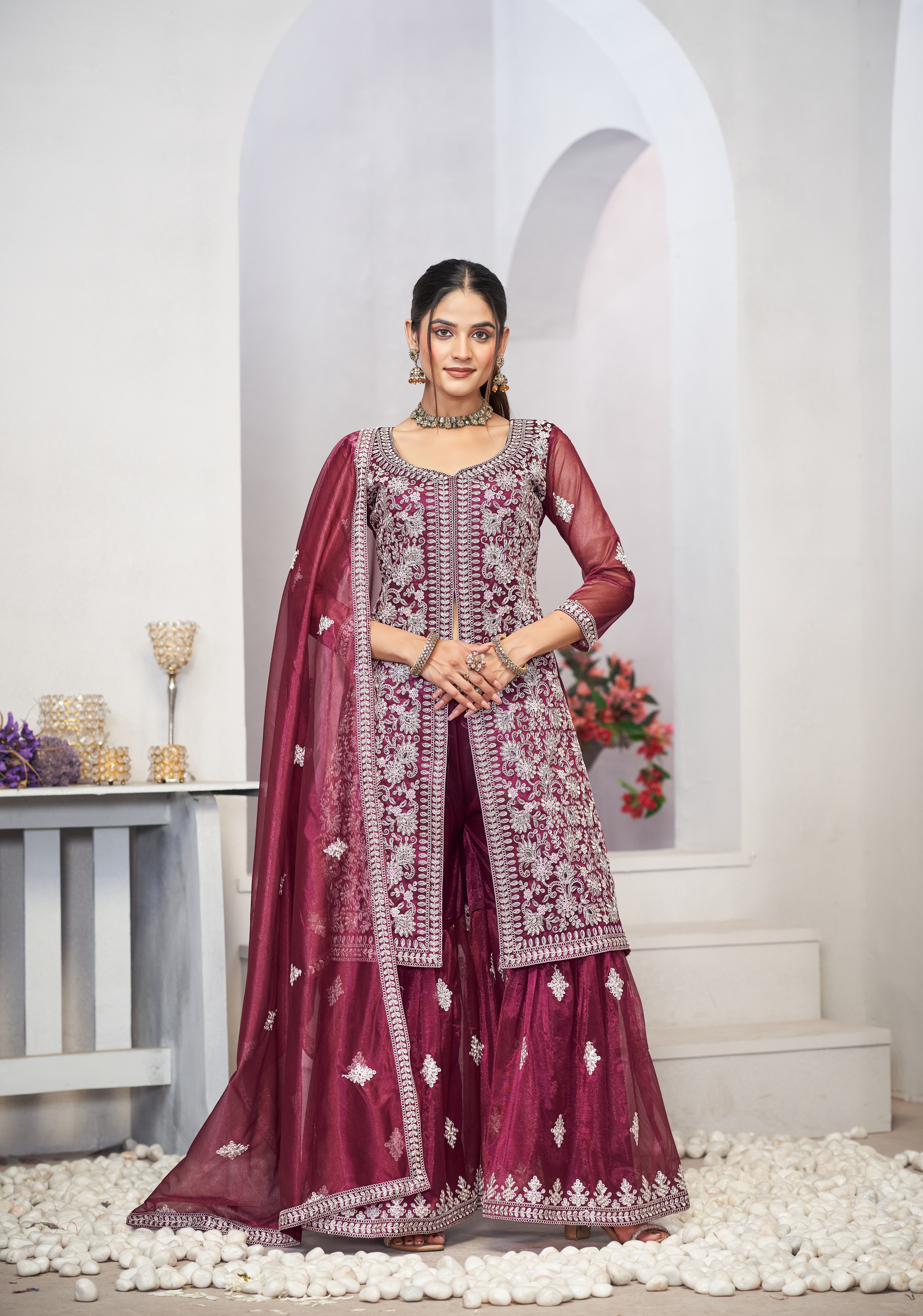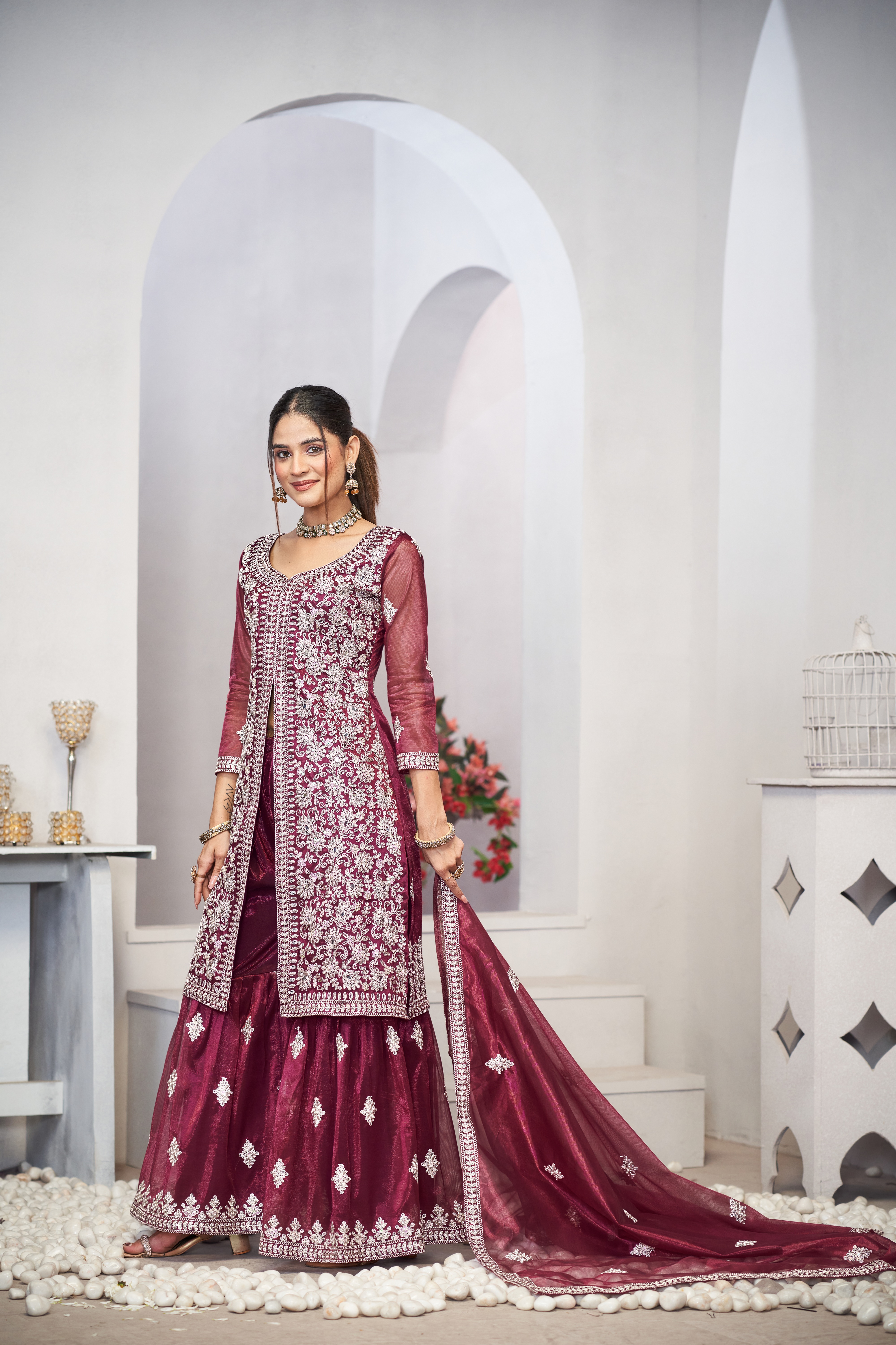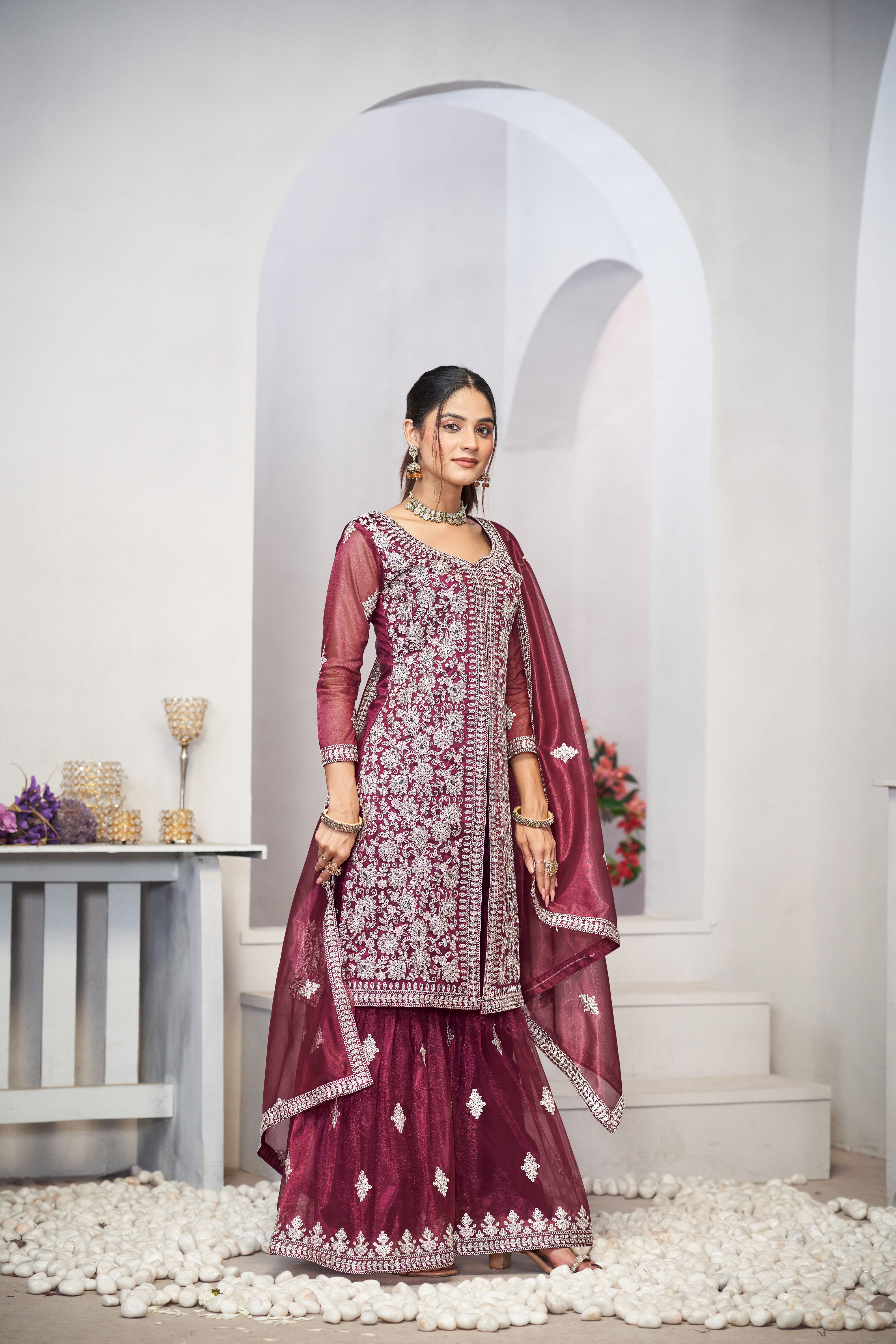 HomeFashionKurtas & Kurta SetsDesigner Ethnic Suit Set with Dupatta Twill Net (Semi Stitche Upto 44' Inch Bust) Fabric Zari Embroidered With Sequins & Real Mirror Work for Women – Purple Color