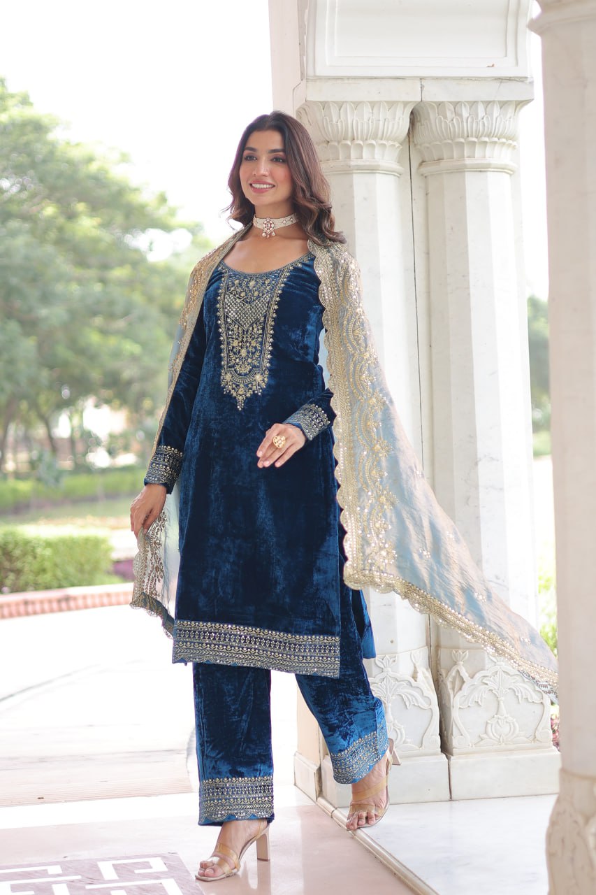 TOP :- FABRICS WORK :- Velvet with Rich Sequins Zari Embroidered workSIZE :- M(38), L(40), XL(42), XXL(44)LENGTH :- 40 INCHLINING :- Cotton (Full Inner Top To Bottom)SLEEVES :- Full SleevesNECK TYPE :- Round NeckSTITCHING TYPE :- Standard Stitching PANT:- FABRICS Work :- Velvet With Rich Sequins Zari embroidered work LENGTH :- 40-42 Inch WAIST :- 36- 40 Inch (Adjustable According to Size) LINING(Inner) :- Cotton (full Inner) STITCHING:- Elastic Waist Standard StitchingDUPATTA :-FABRIC WORK :- Fendy with Rich Sequins Zari Embroidered Cut-workLENGTH :- 2.3 MTR.