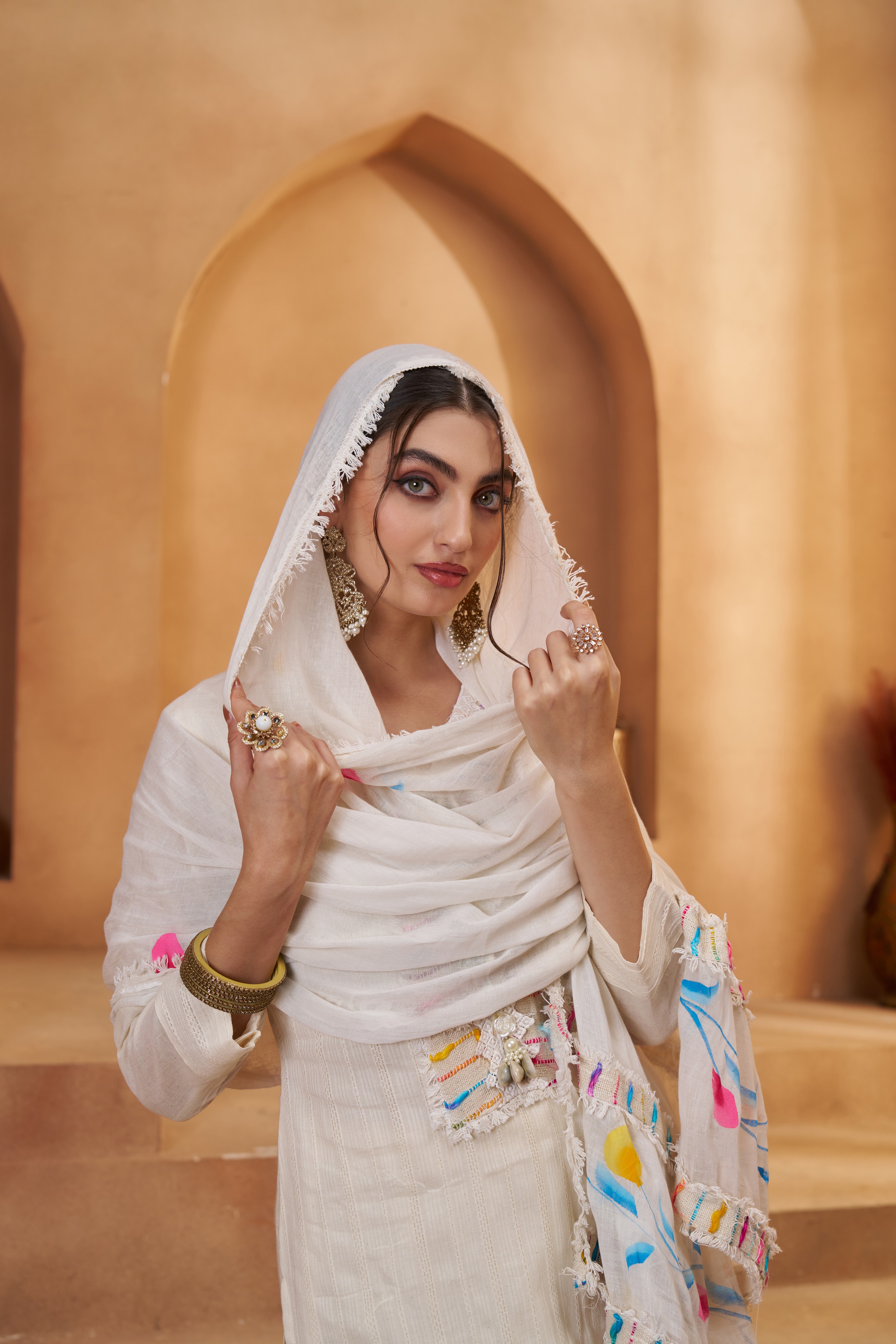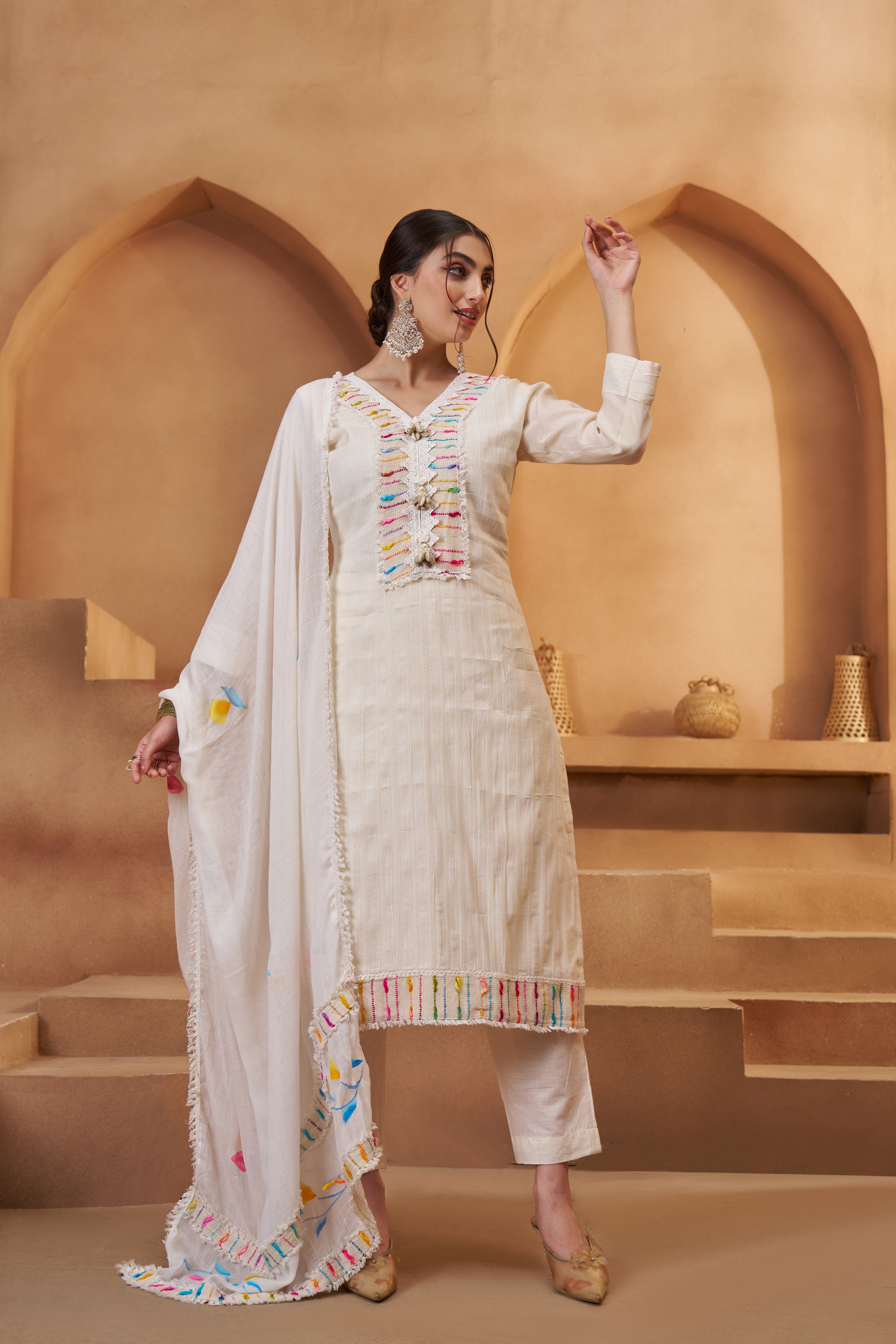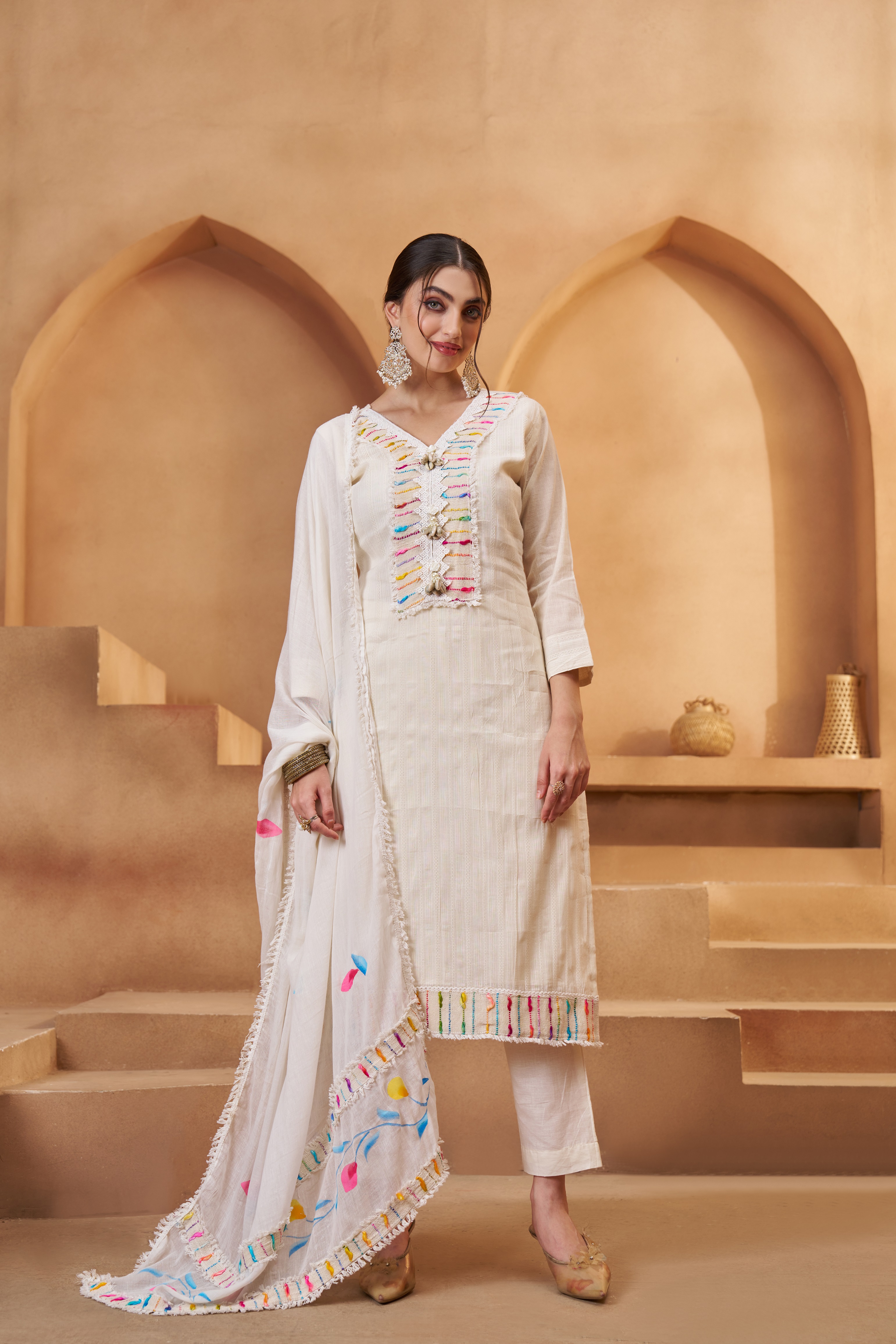Suit Fabric :- Bombay Cotton Suit Colour :- Off WhiteSuit Size :- 46 InchSuit Height :- 46 InchDupatta Fabric :- Bombay CottonDupatta Size :- 2.25 meterBottom Fabric :- Bombay Cotton Bottom Size :- 2.50 meterWork Description :- Thread work Embroidery with Brush Hand Print and Readymade Fancy Lace.