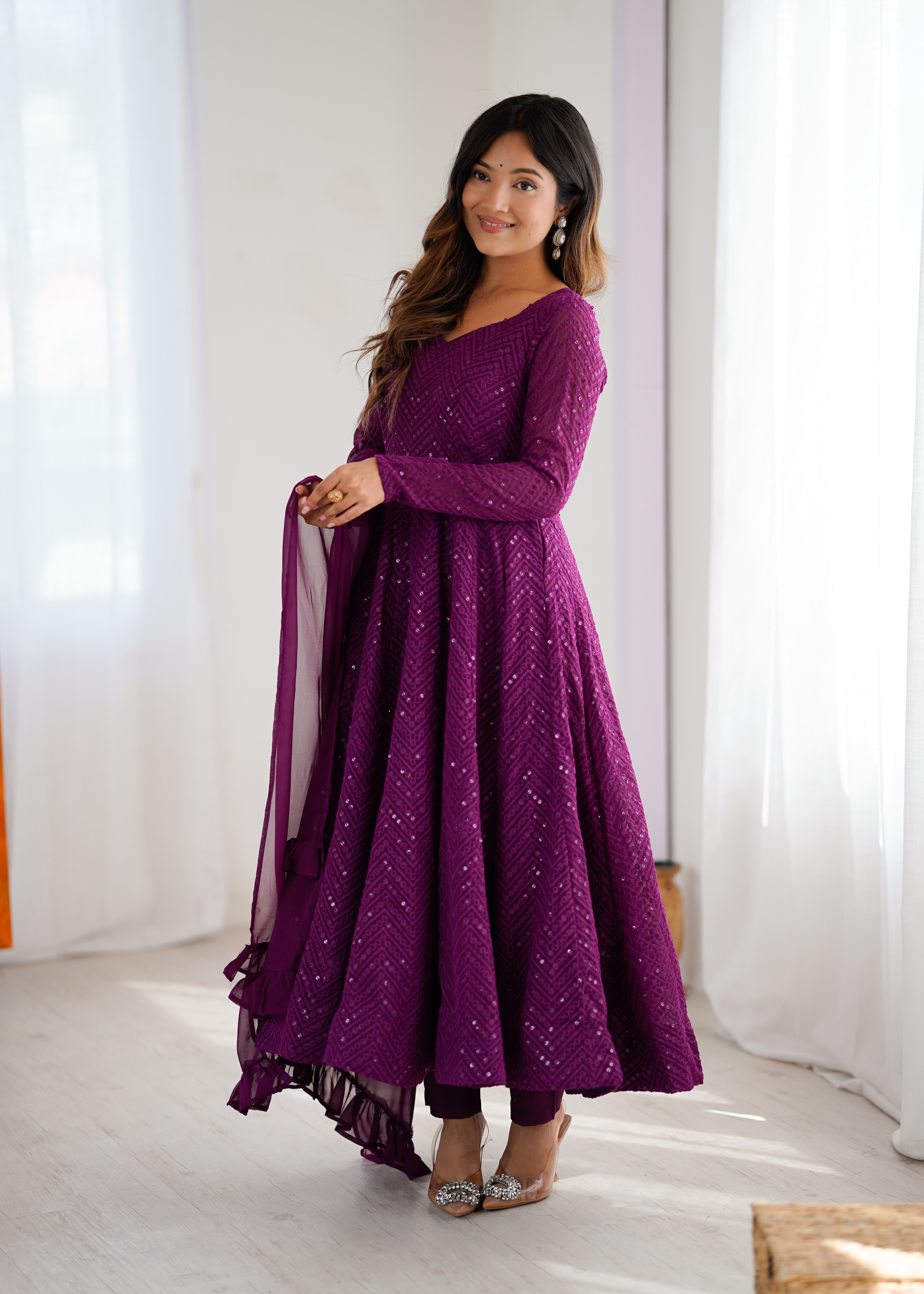 ANARKALI FABRIC: HEAVY PURE SOFT FOX GEORGETTE LUKHNOWI SEQUENCE WORK, FULL LENGTH SLEEVES, PADDED, ZIPPER ATTACHED COMPLETEGOWN FLAIR: 4 MTR APPORX FLAIR WITH KALI CUT ATTACHED COMPLETE WITH CANVAS PATTAANARKALI INNER: PURE MICRO COTTON WITH CANVAS PATTA ATTACHED DUPATTA WORK: 2.2 MTR PURE SOFT FOX GEORGETTE DUPPTA RUFFLE STYLE ANARKALI LENGTH:48 49 INCH APPORX PENT:MICRO COTTON SILK FREE SIZE FULLY STTICHED SIZE:S(36) M(38) L(40) XL(42) And XXL(44) Fully stitched ready to wear.