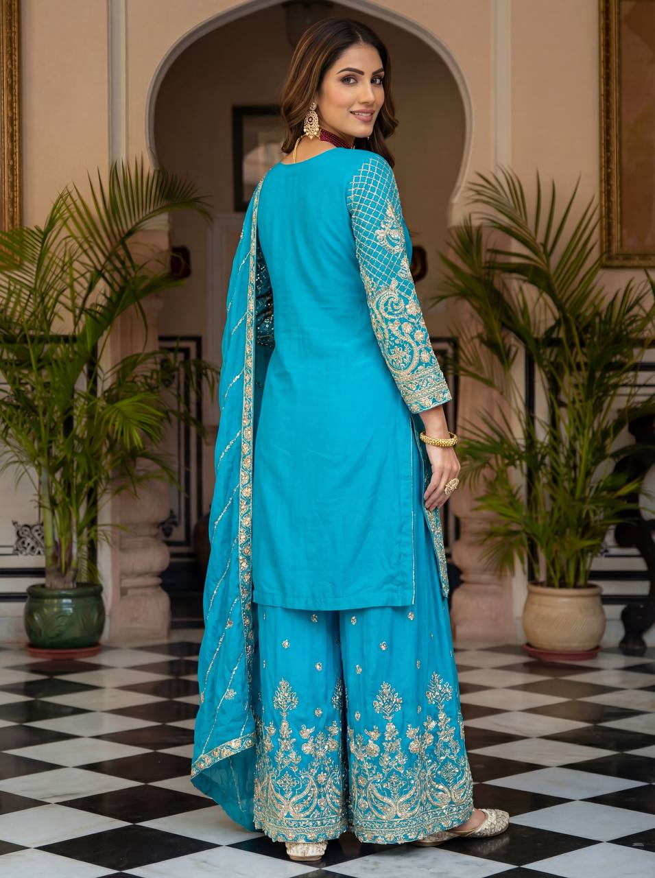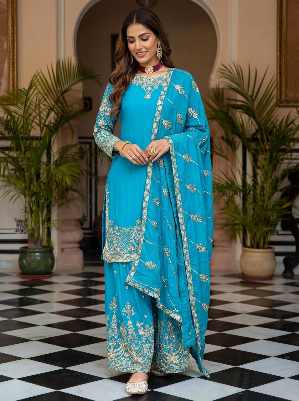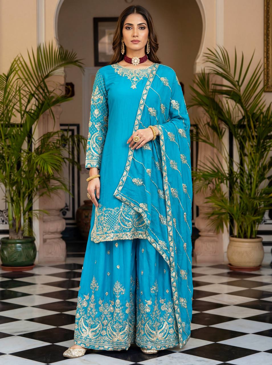 Elevate your festive style with these stunning embroidered sharara suits a perfect blend of grace, tradition, and modern charm. Whether its a wedding, festive gathering, or celebration, these rich hues of designed to make you shine.