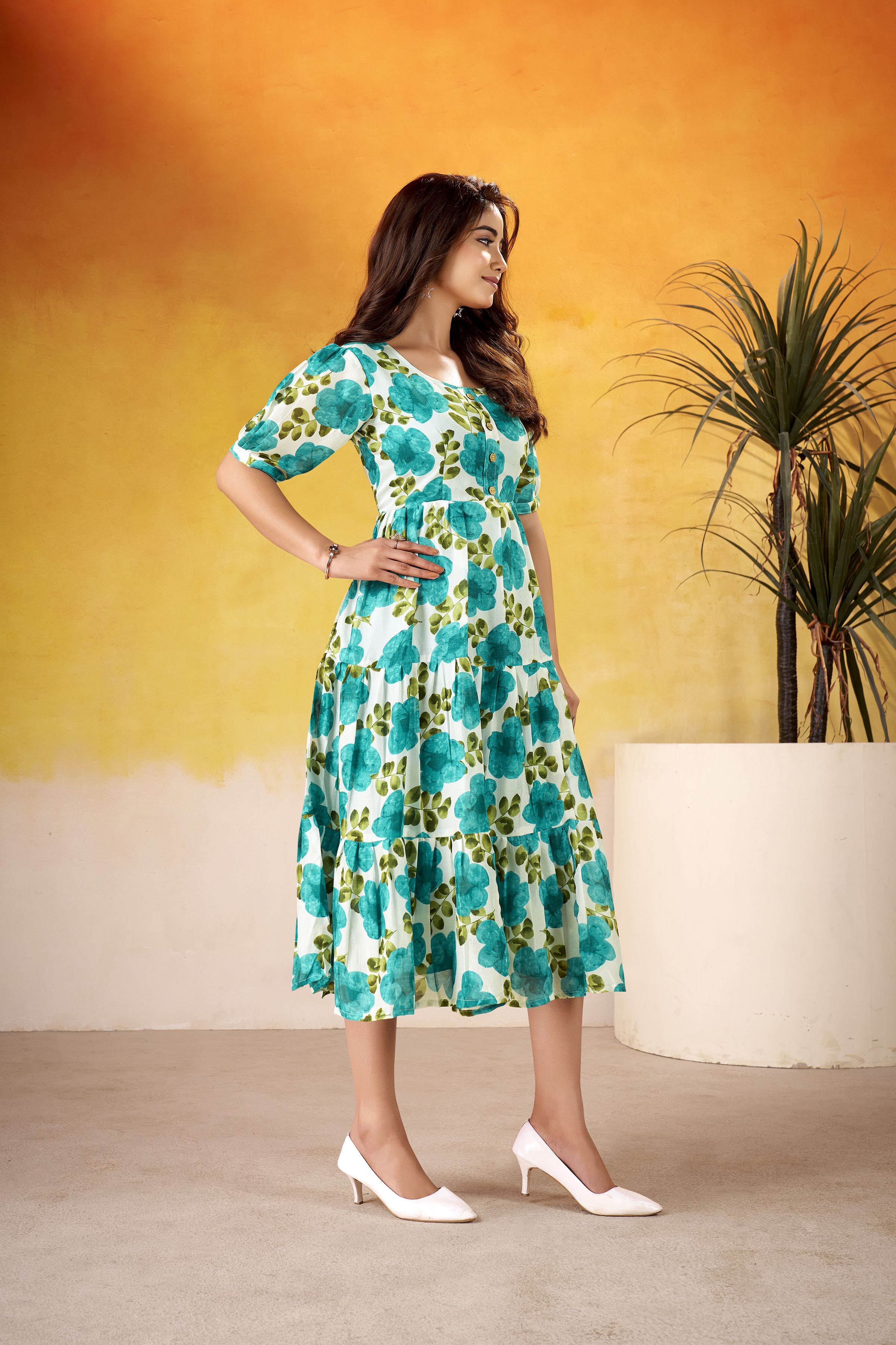Firozi Color Vichitra Silk Fabric Designer Floral Printed Girlie Partywear Kurti