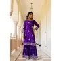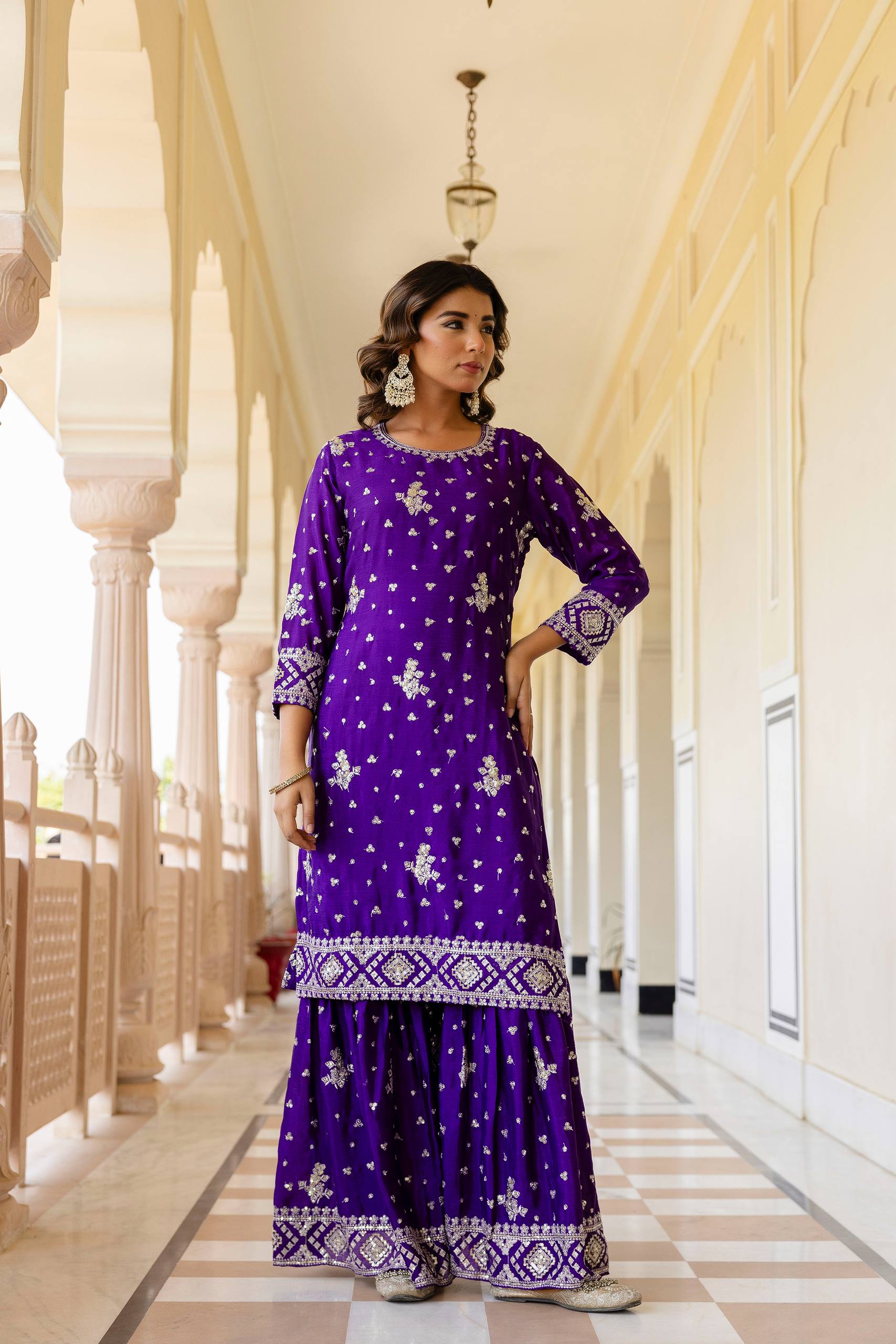 Elevate your festive style with these stunning embroidered sharara suits a perfect blend of grace, tradition, and modern charm. Whether its a wedding, festive gathering, or celebration, these rich hues of purple,maroon,skyblue,yellow are designed to make you shine.