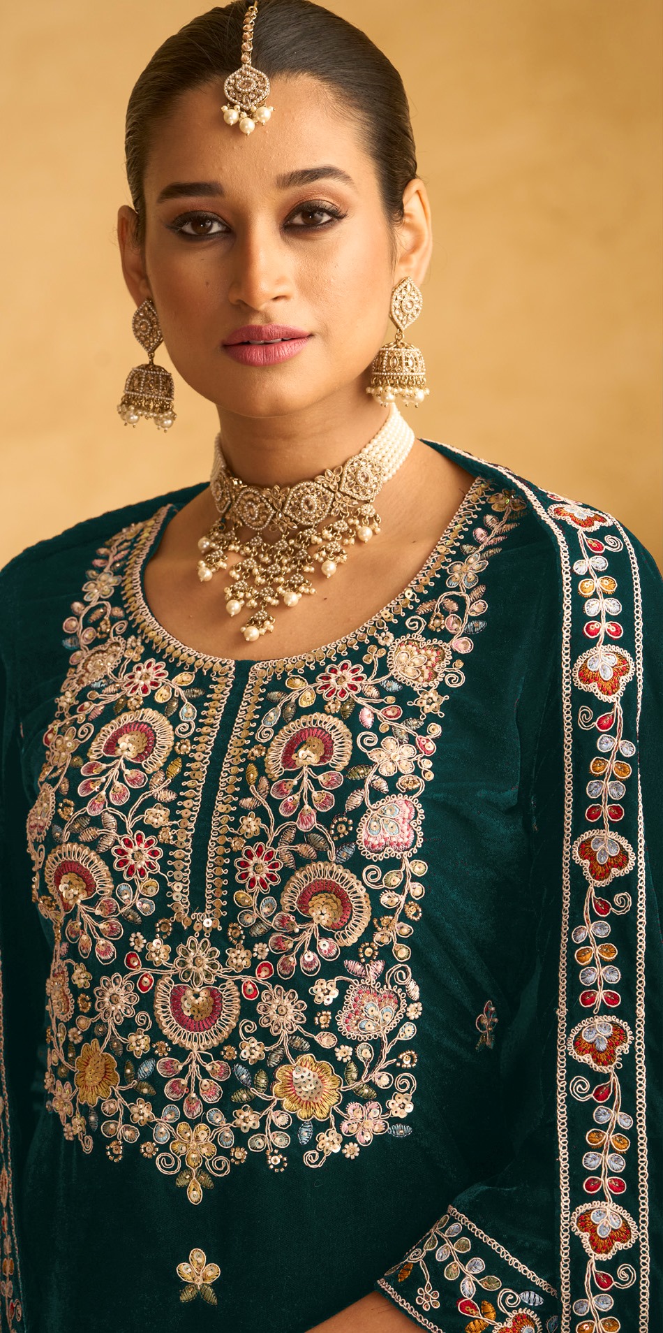 Green Color Beautiful Wedding Wear Velvet Fabric Semi Stitched Palazzo Dress