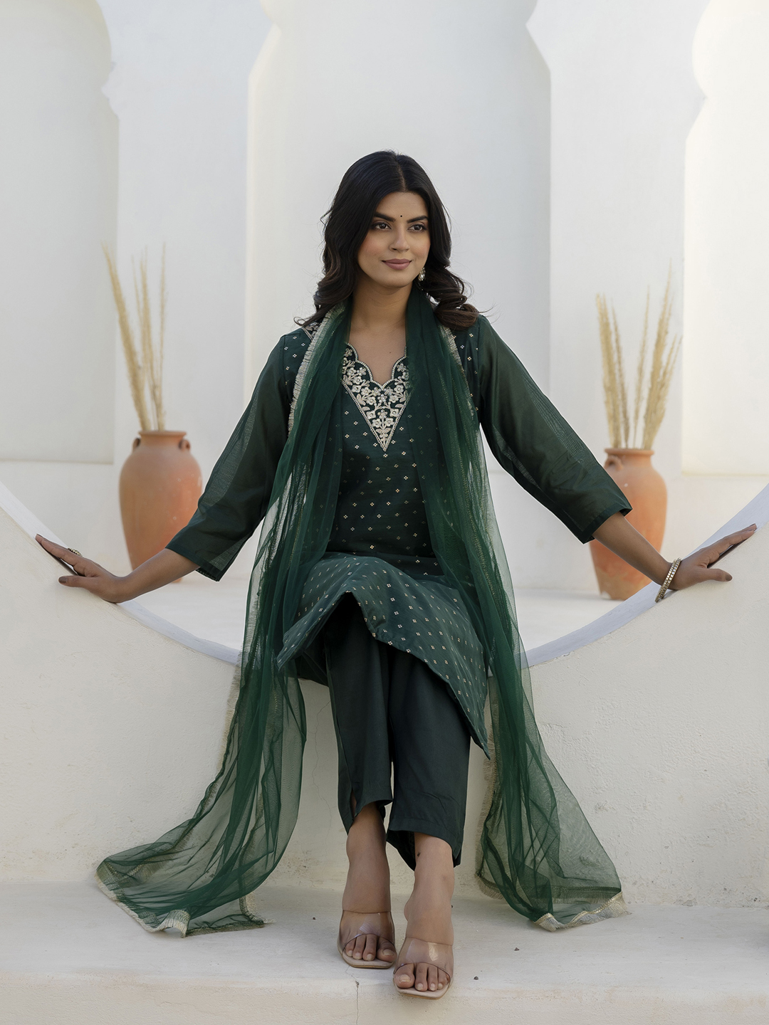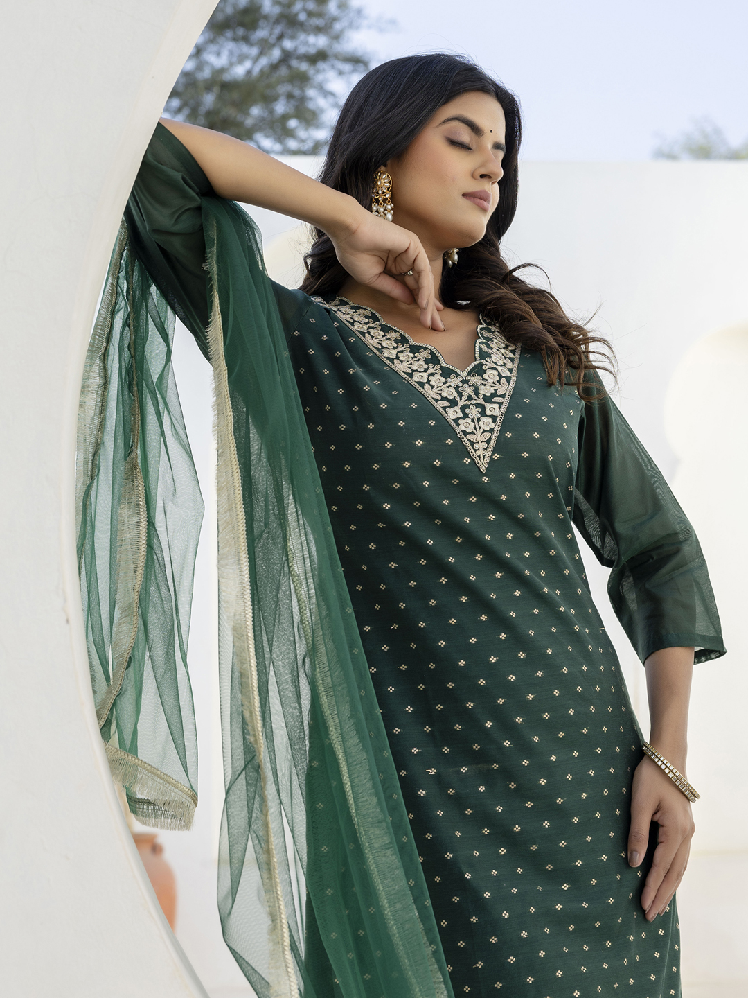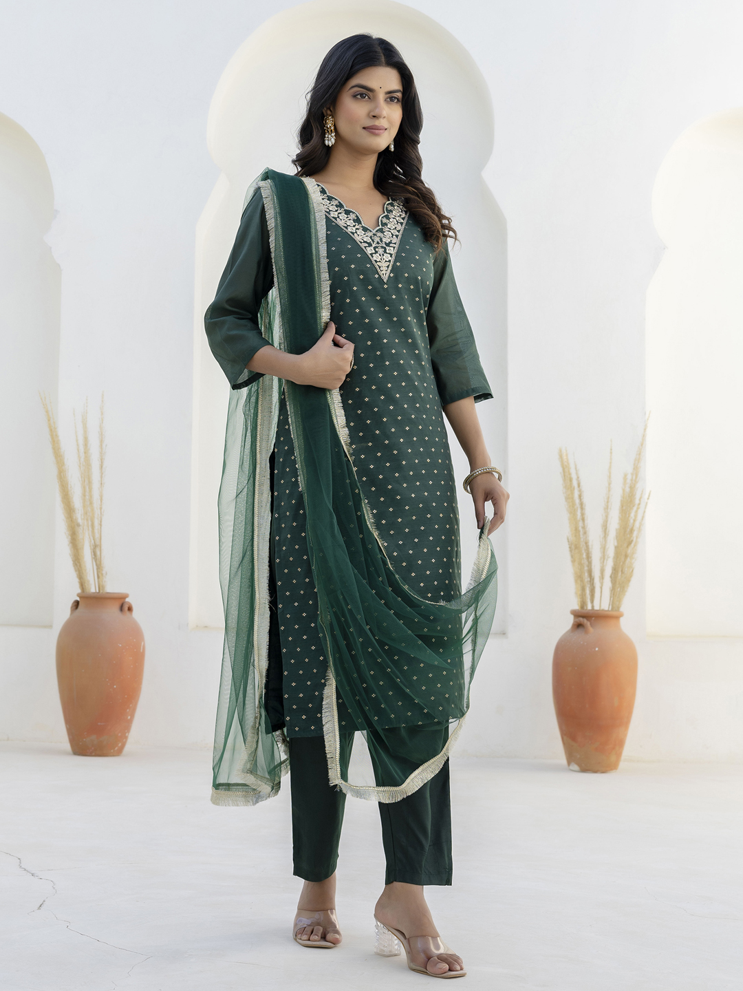 Green Color Chanderi Silk Fabric Beautiful Festive Wear Readymade Kurta Set