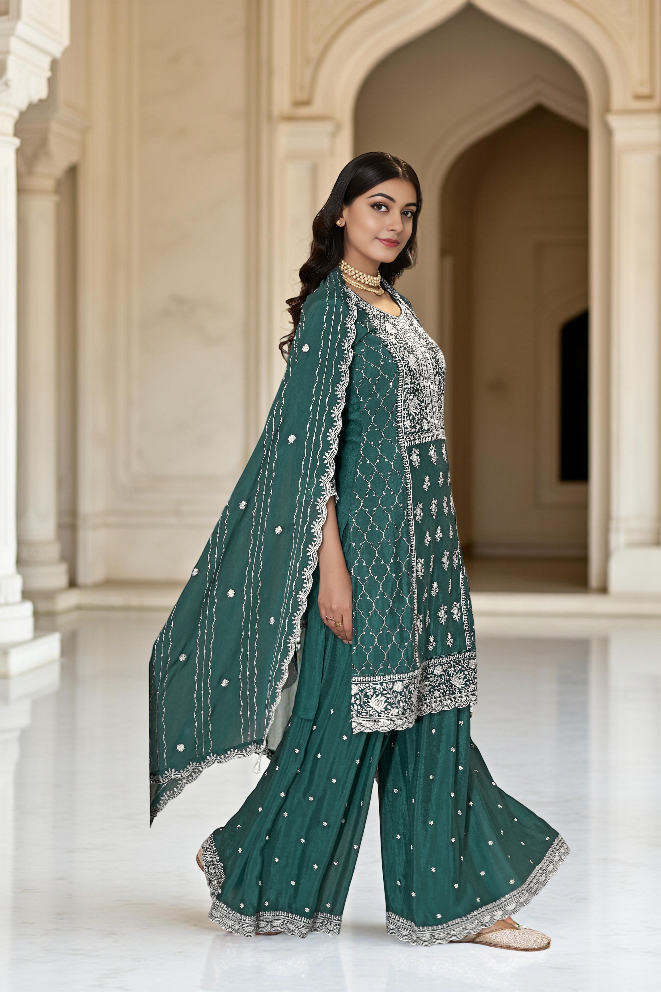 Green Color Heavy Embroidery Work Chinon Fabric Ethnic Indian Palazzo Suit