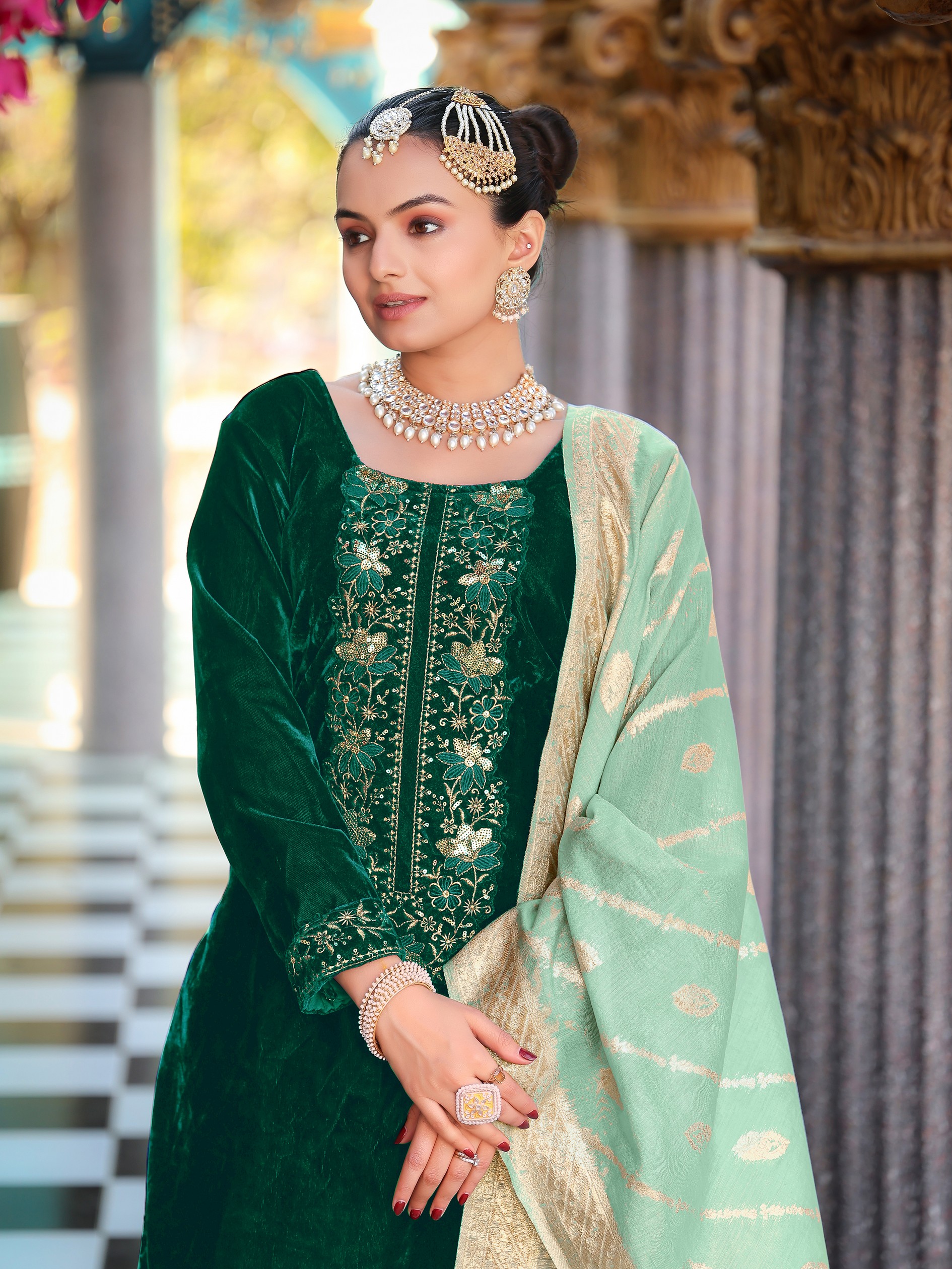 Green Color Velvet Fabric Heavy Wedding Ceremonial Salwar Kameez