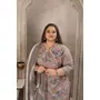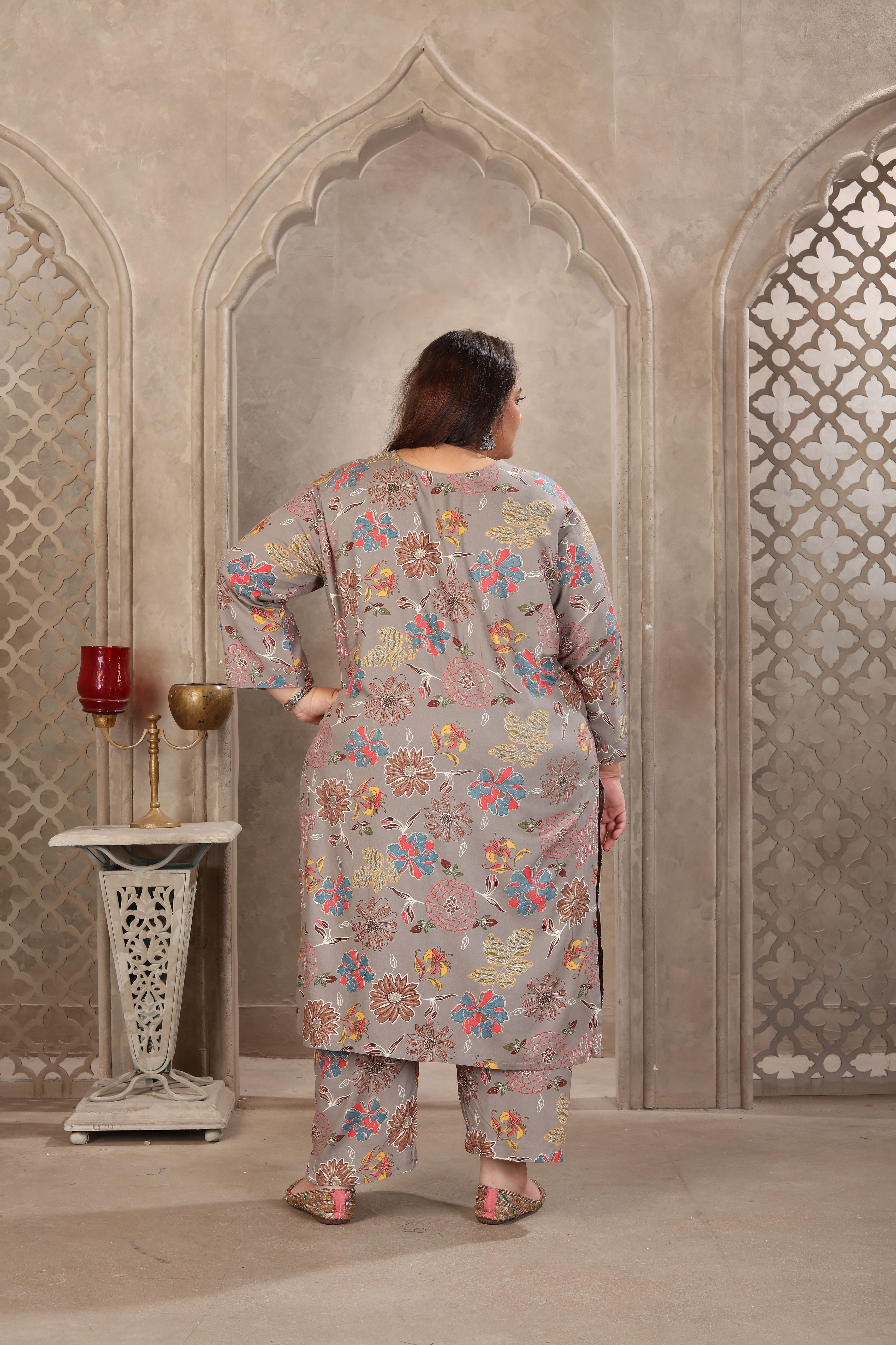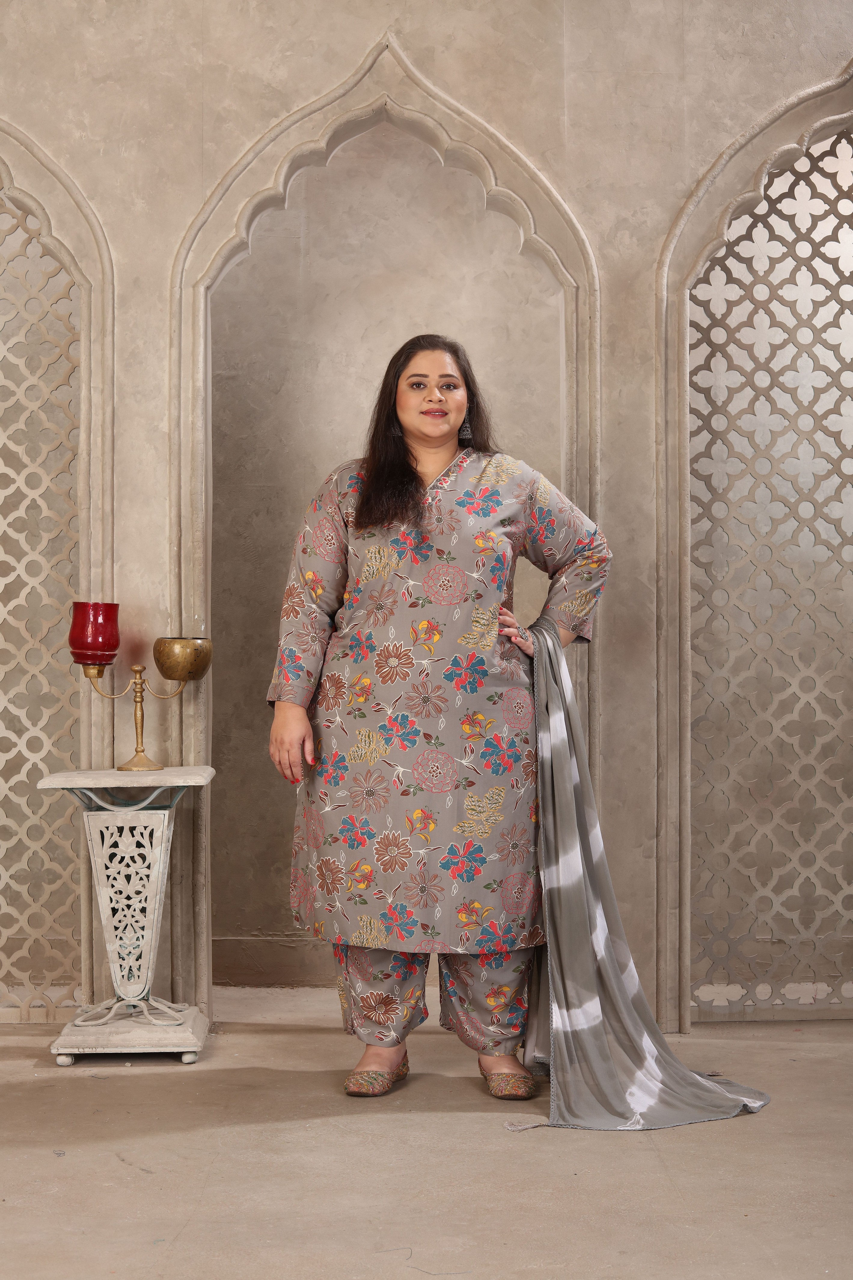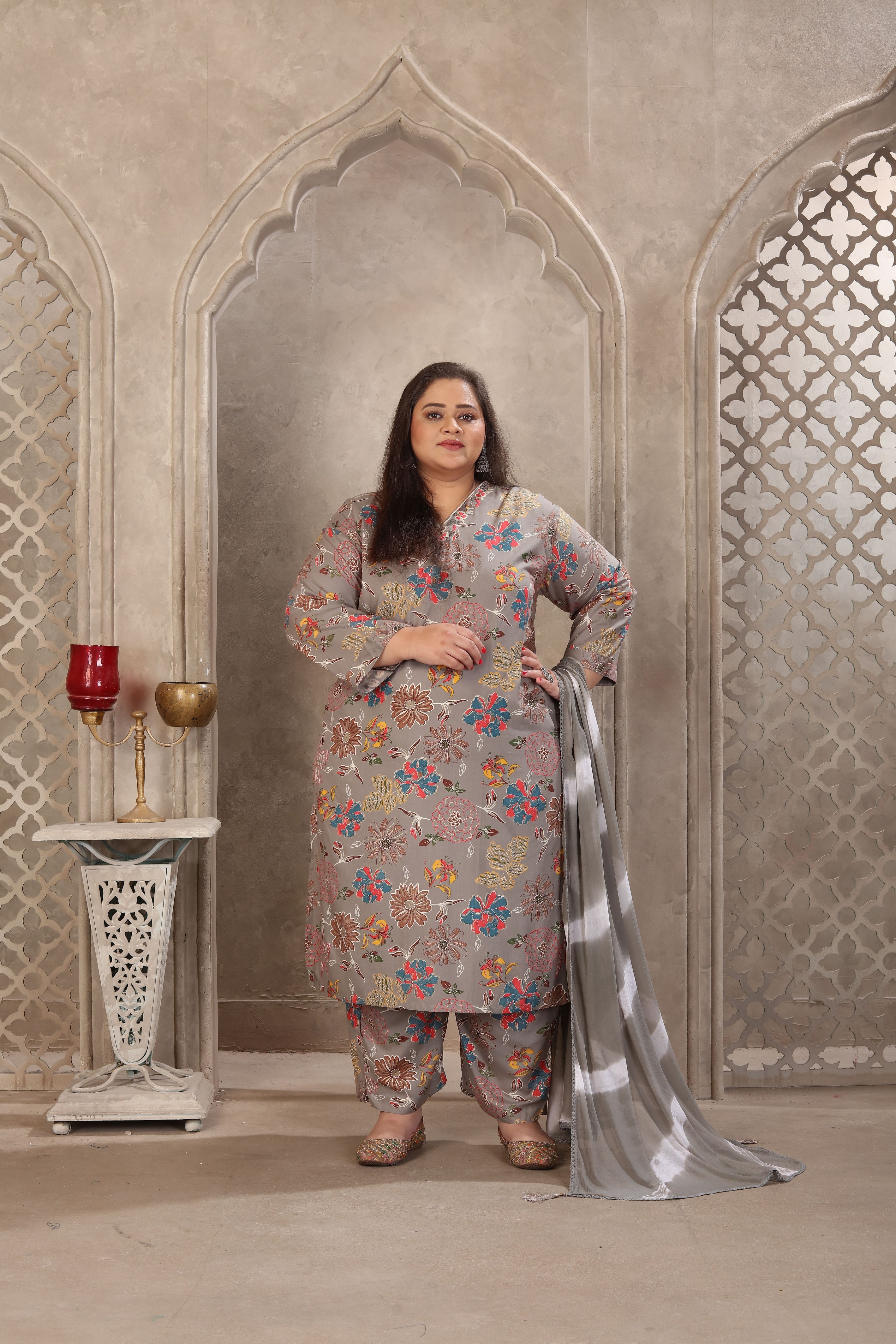 Grey Color Rayon Fabric Prited Plus Size Kurta Set With Dupatta