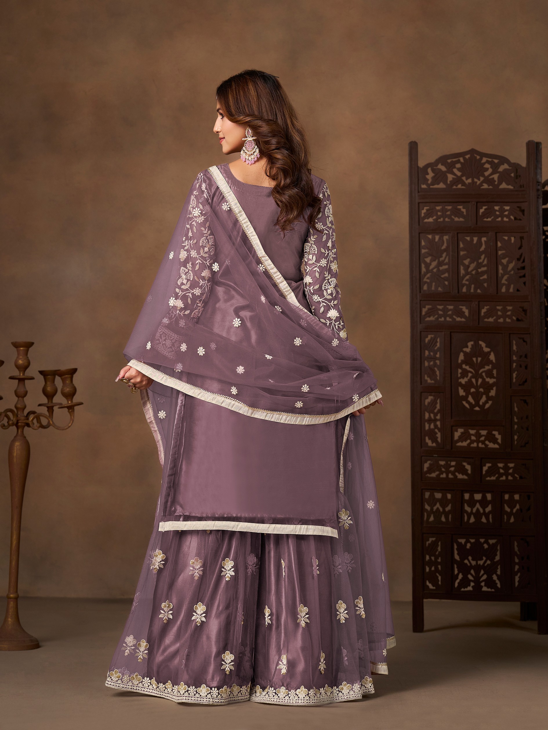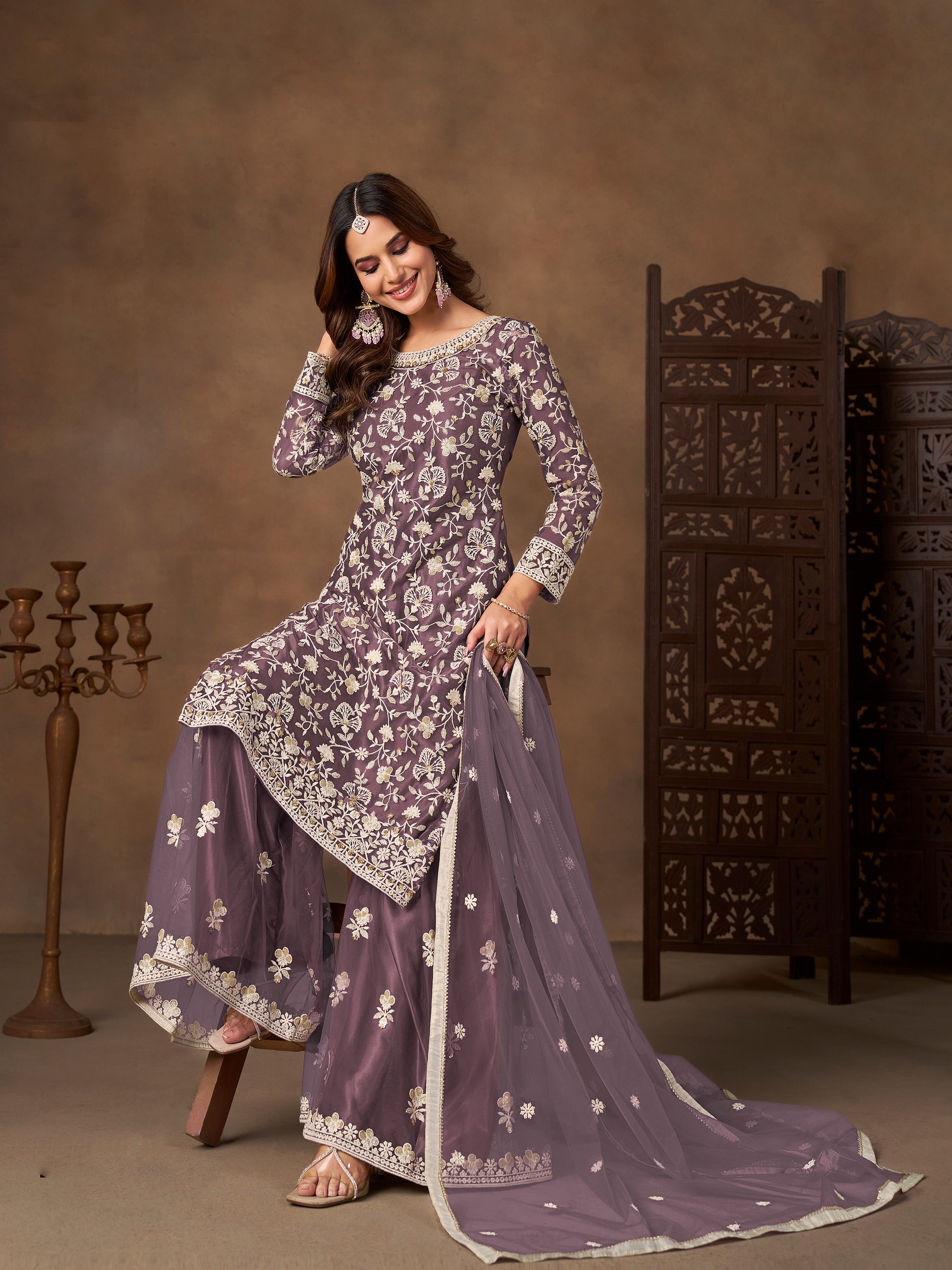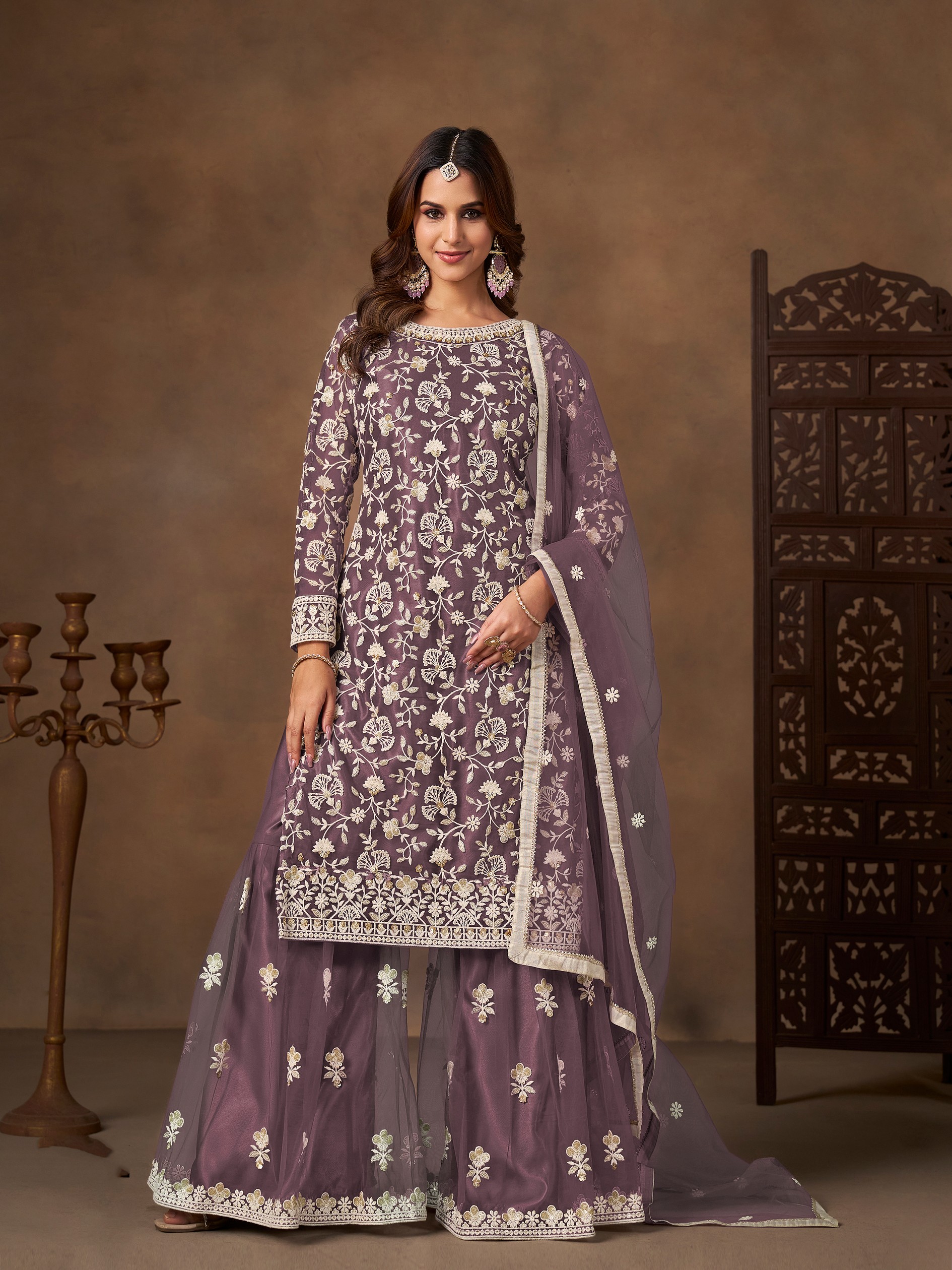 Lavender Color Elegant Net Fabric Designer Embroidered Palazzo Suit