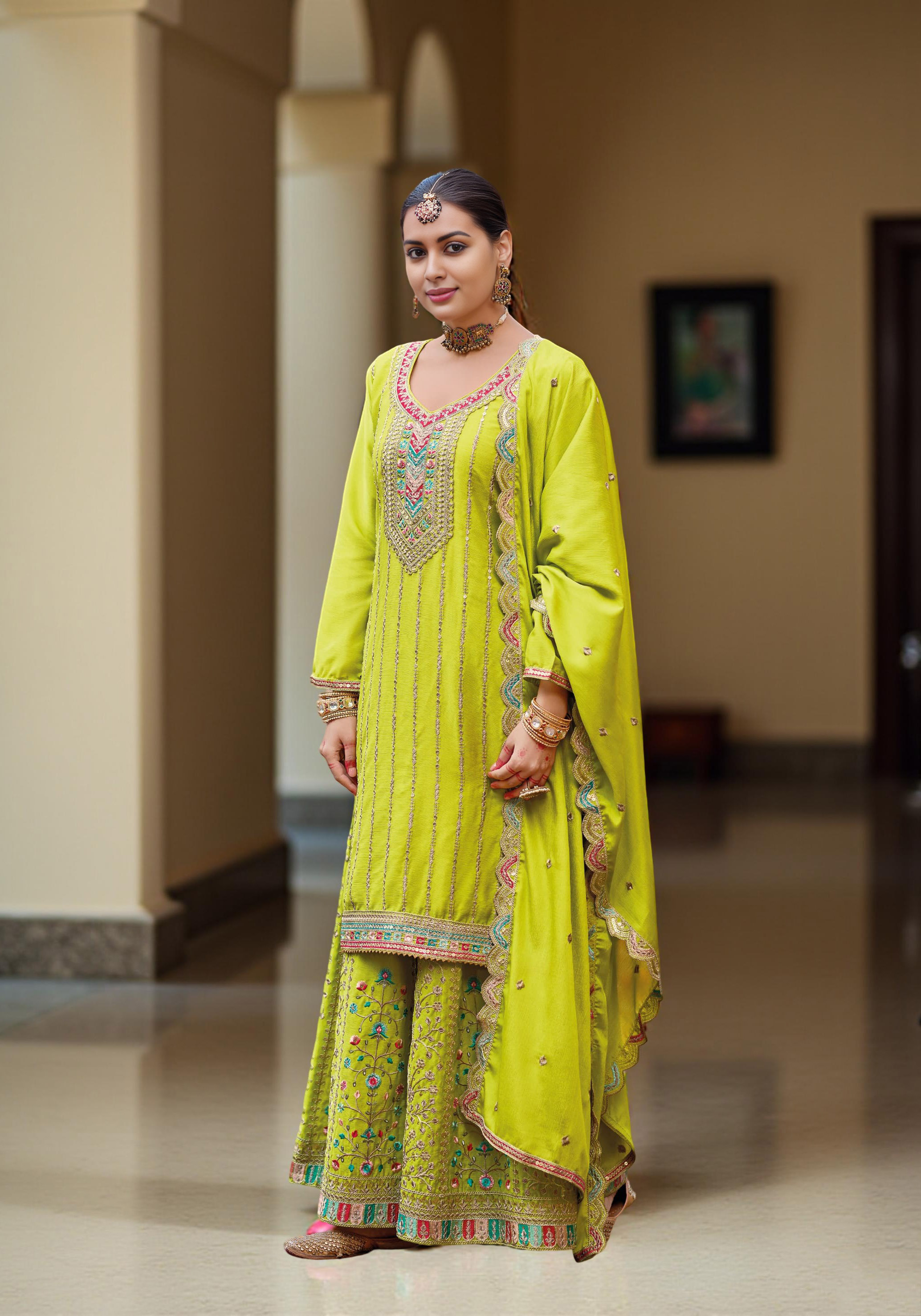 Lemon Color Chinon Fabric Designer Embroidery Work Graceful Palazzo Dress