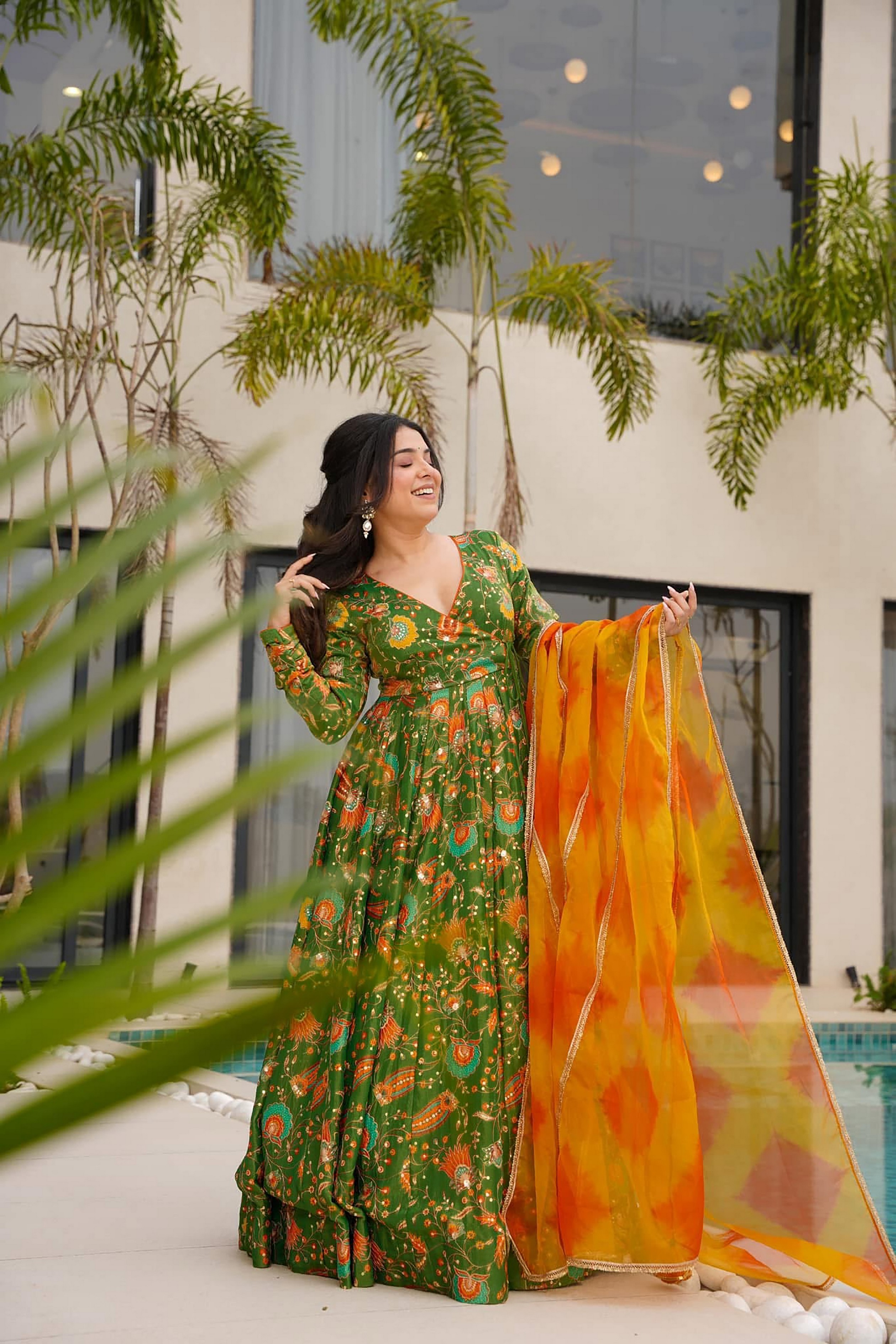 Mahendi Color Ceremonial Wear Stylish Girlie Gown With Dupatta For Ethnic Looks