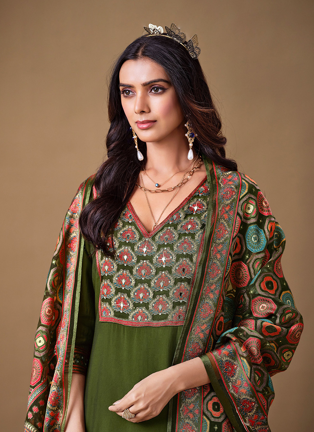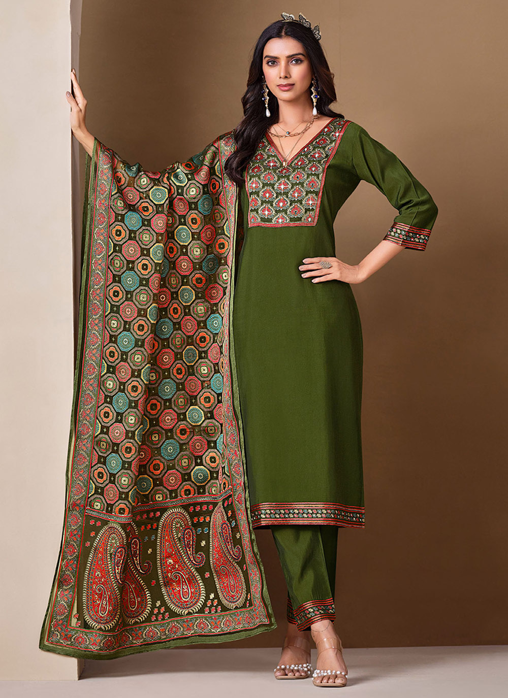 Mahendi Color Roman Silk Fabric Bollywood Style Ceremonial Wear Salwar Kameez