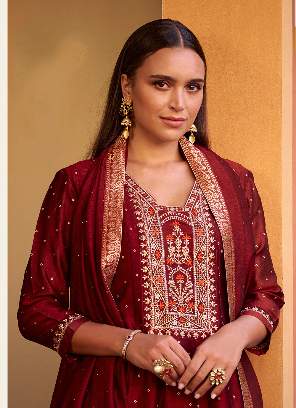Maroon Color Vichitra Silk Fabric Heavy Embroidered Readymade Suit