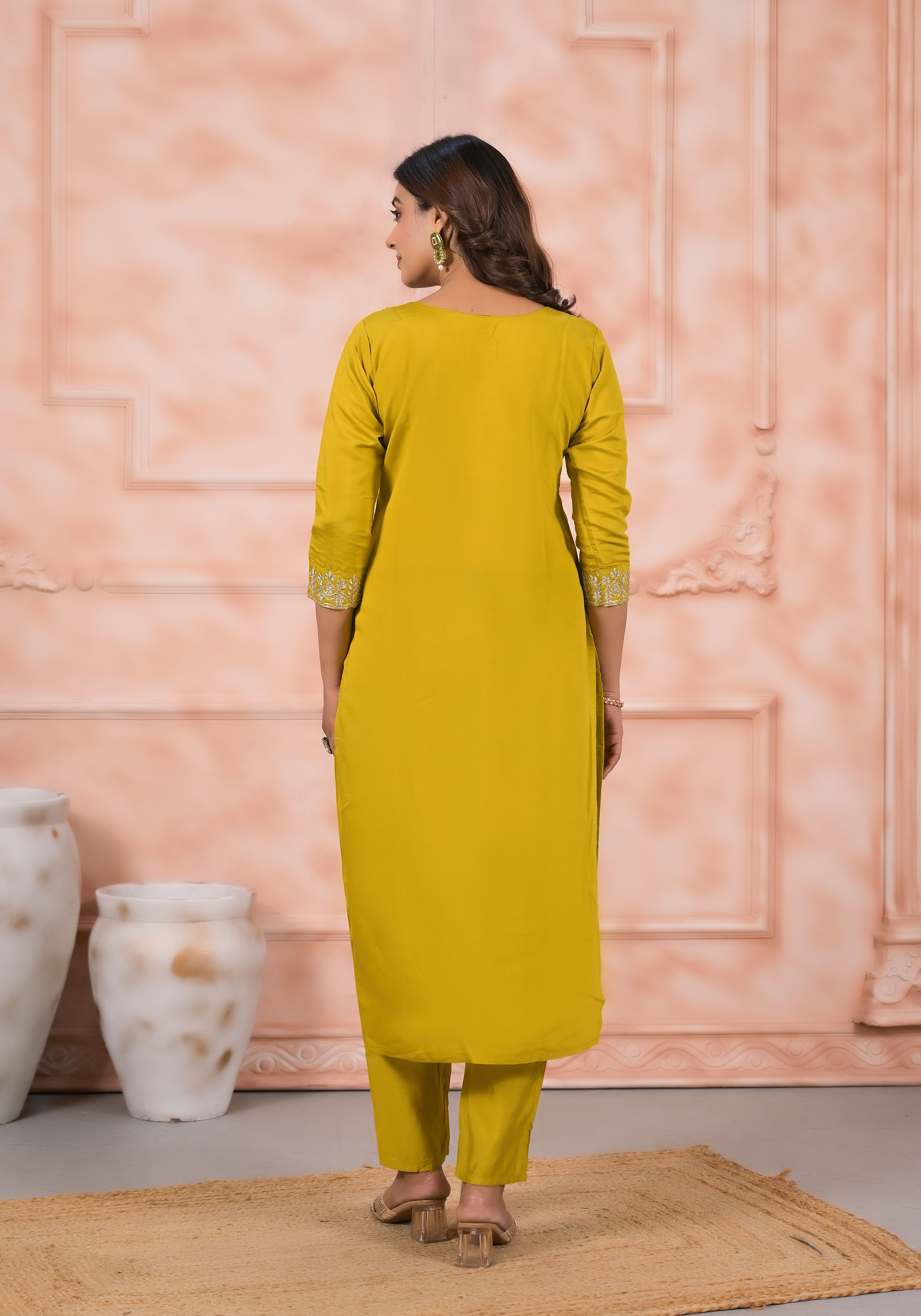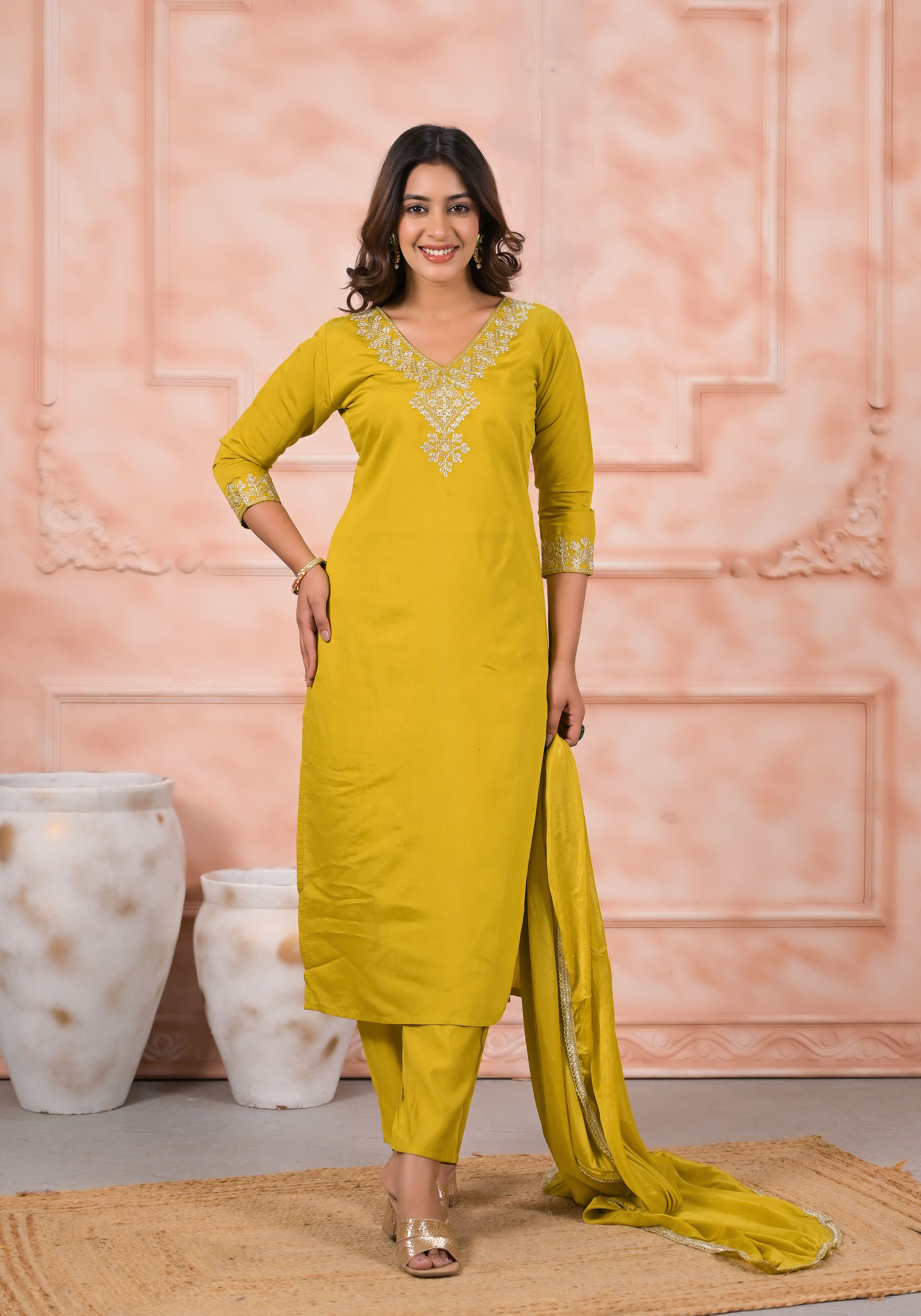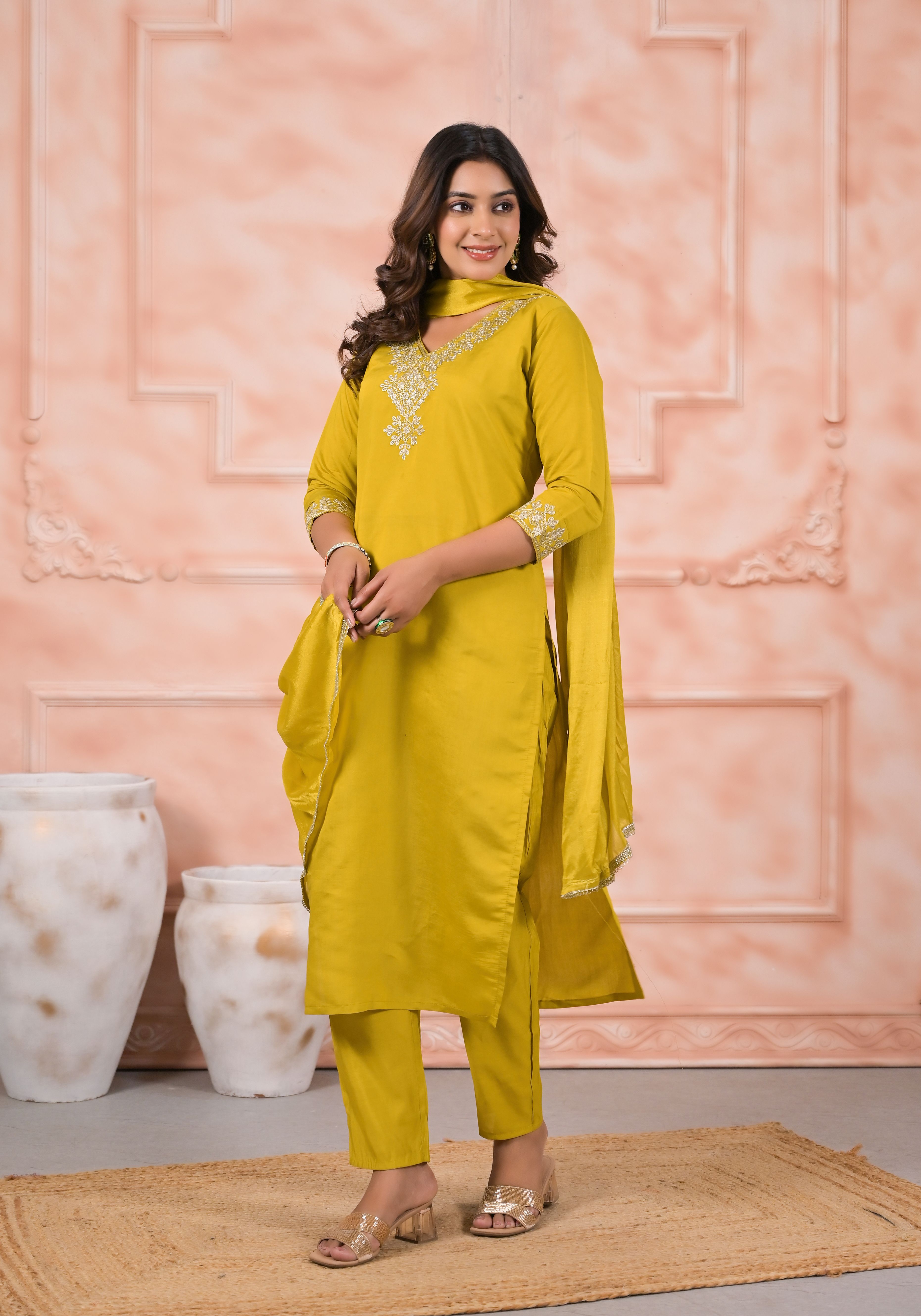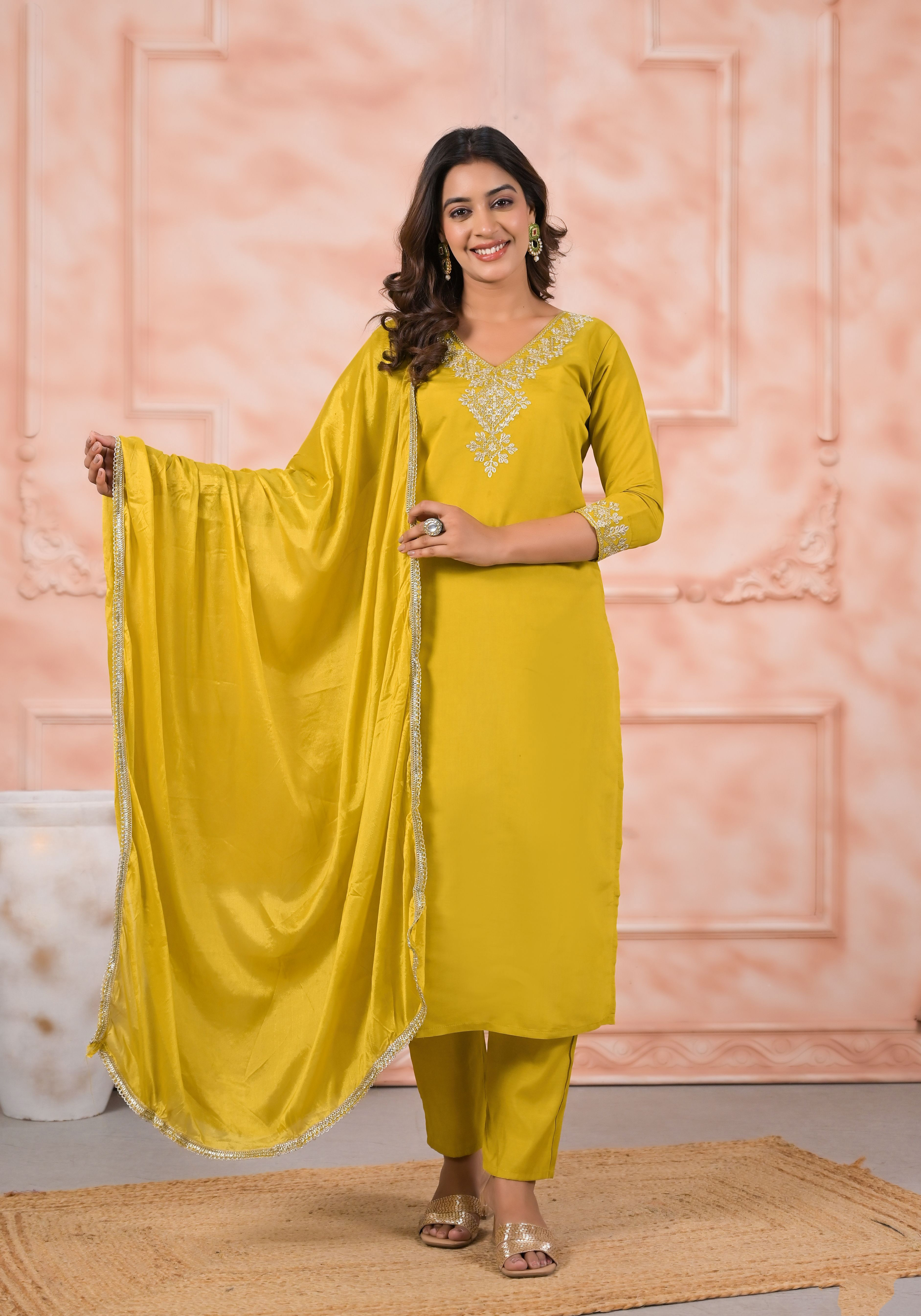 Mustard Color Chanderi Fabric Designer Embroidery Work Ceremonial Kurta Set With Dupatta
