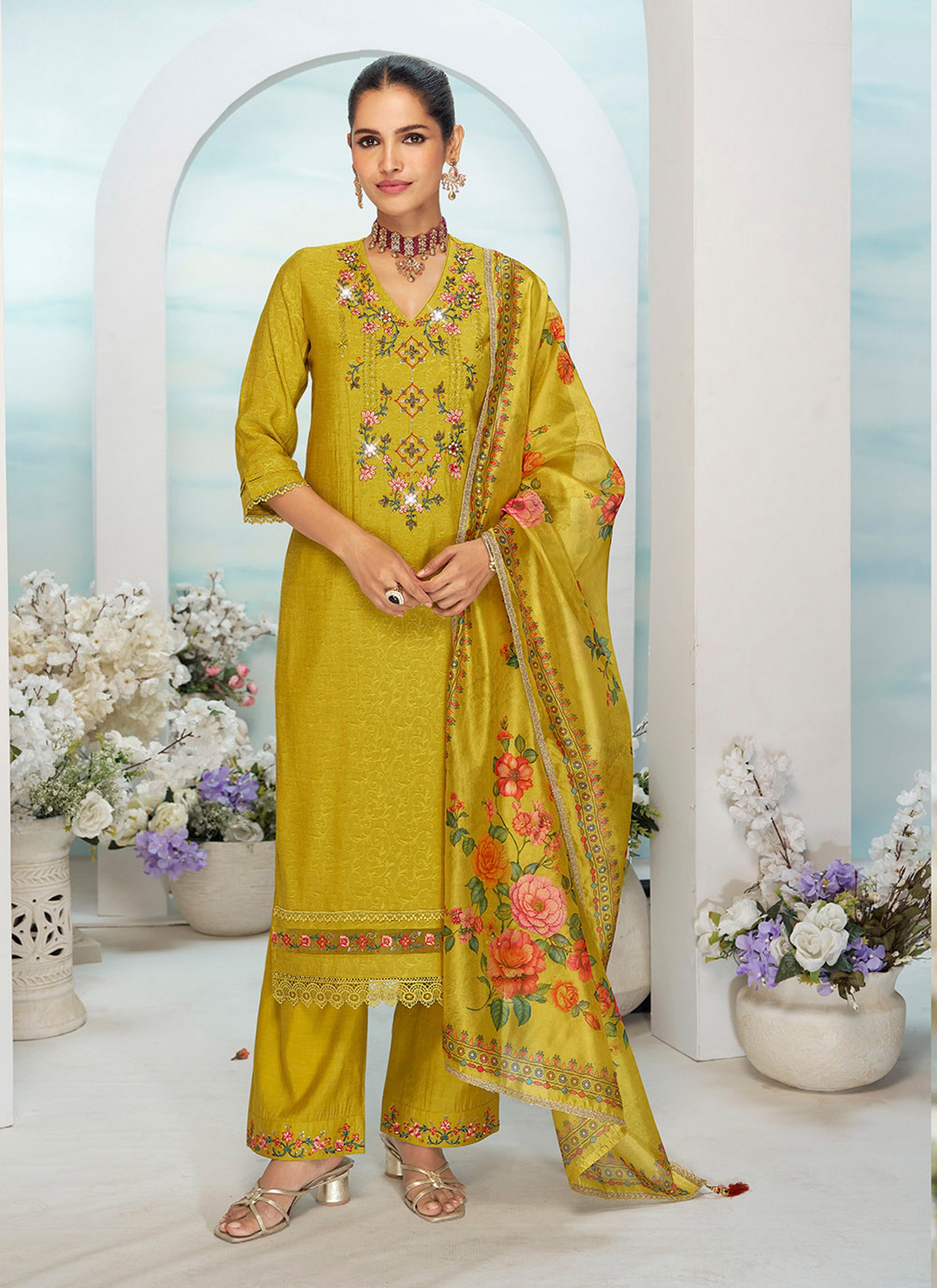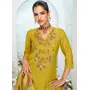 Mustard Color Ethnic And Beautiful Viscose Silk Fabric Designer Embroidered Suit