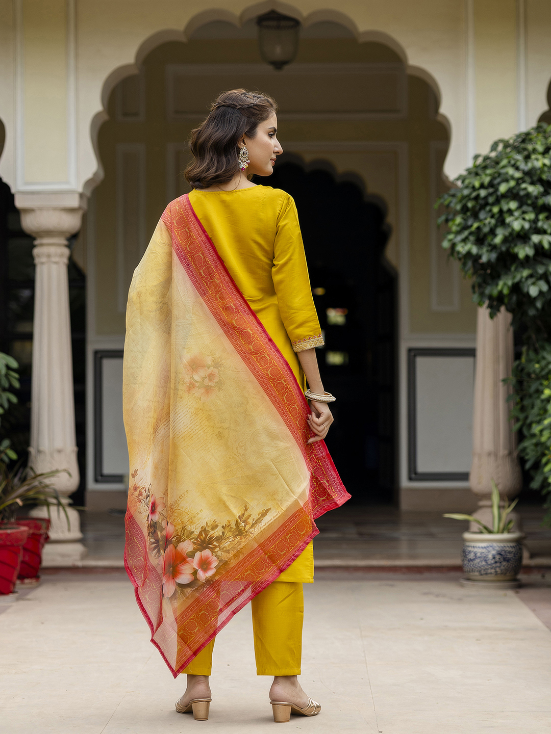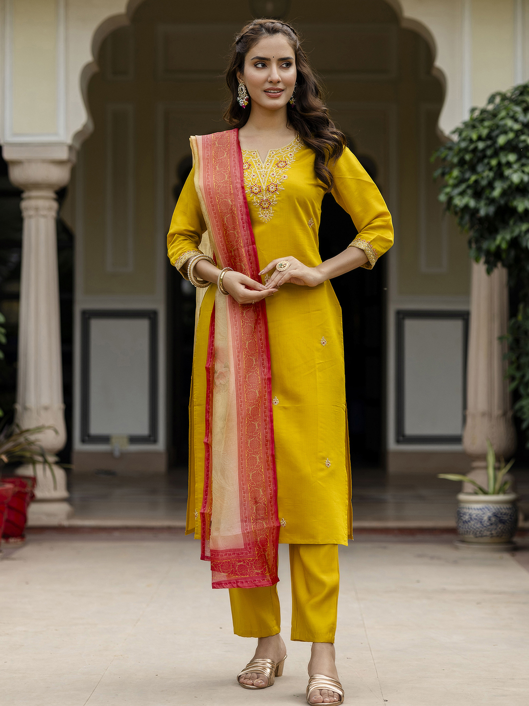 Mustard Color Rayon Fabric Designer Embroidered Readymade Kurta Set With Dupatta
