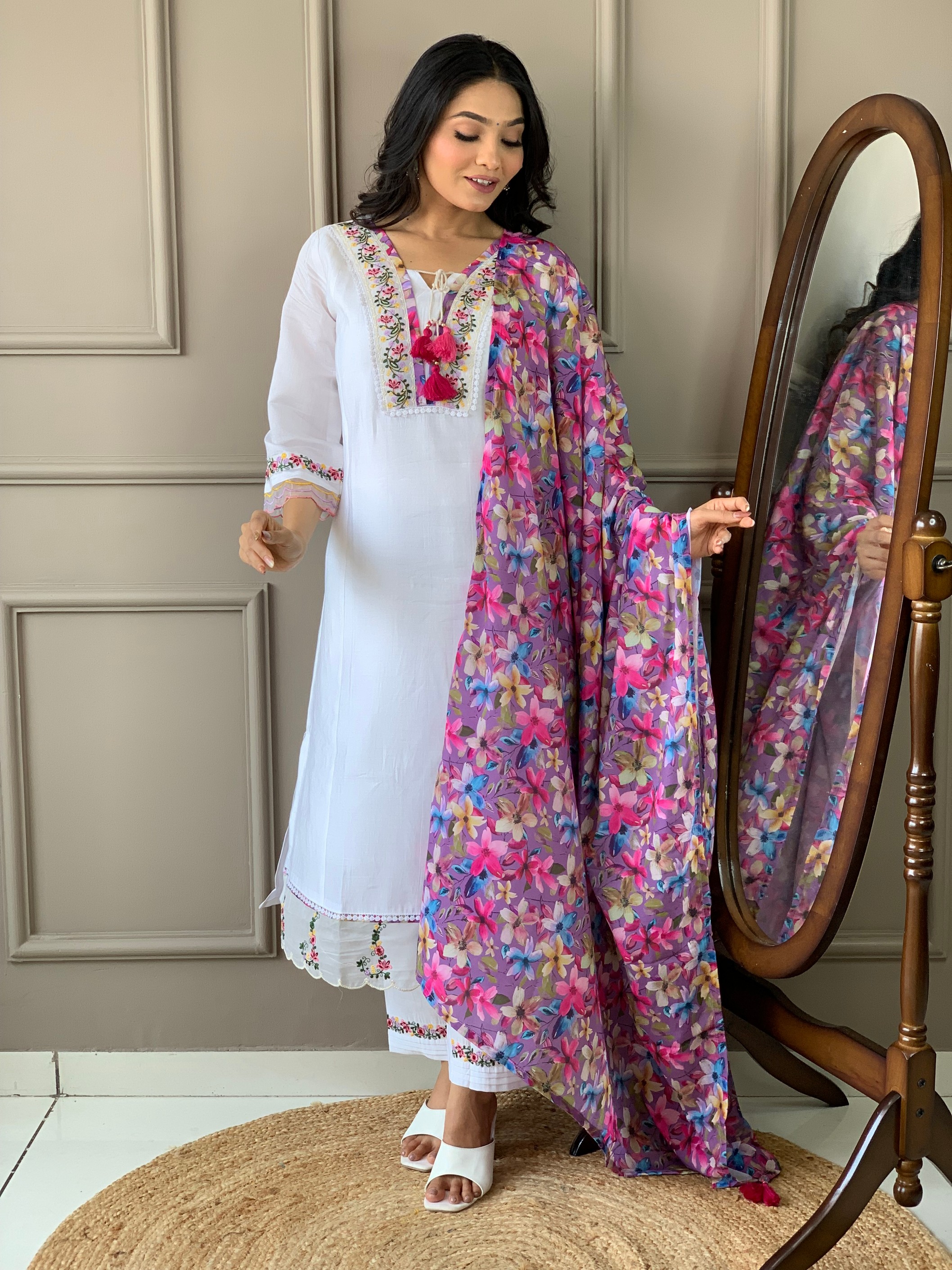 Off White Color Chanderi Fabric Ceremonial Wear Embroidery Work With Printed Kurta Set