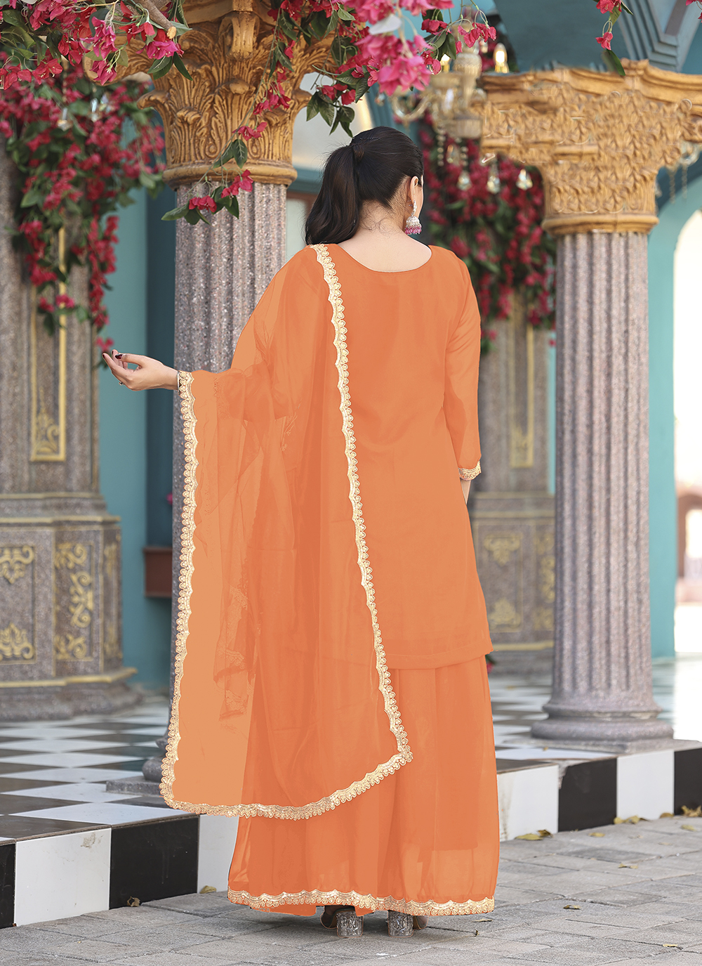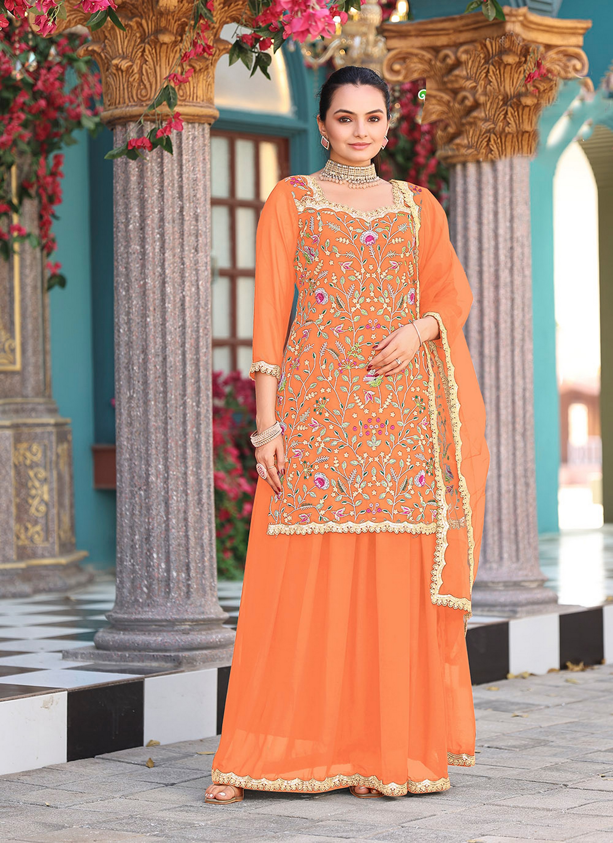 Orange Color Graceful Heavy Embroidered Palazzo Dress For Wedding Looks