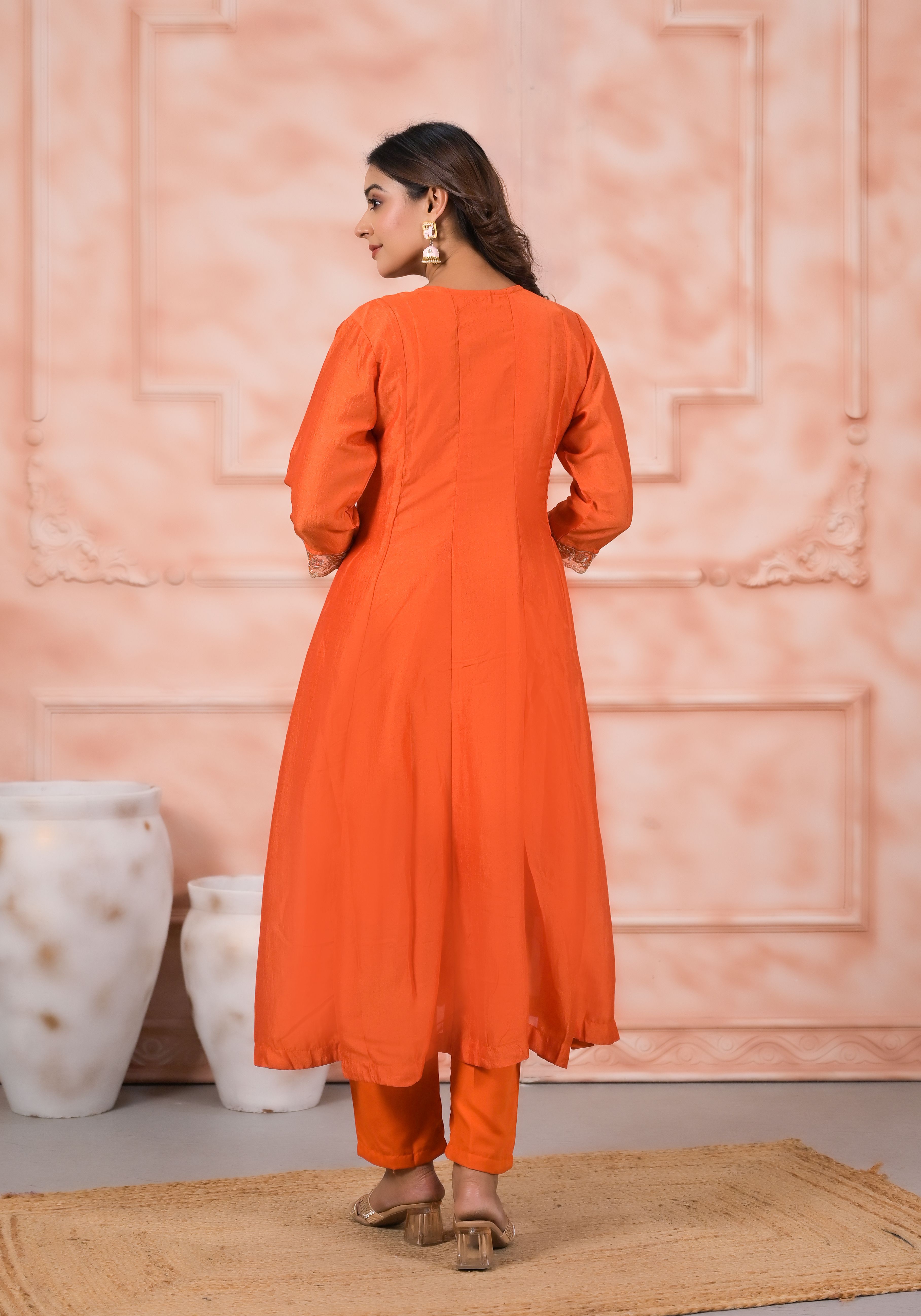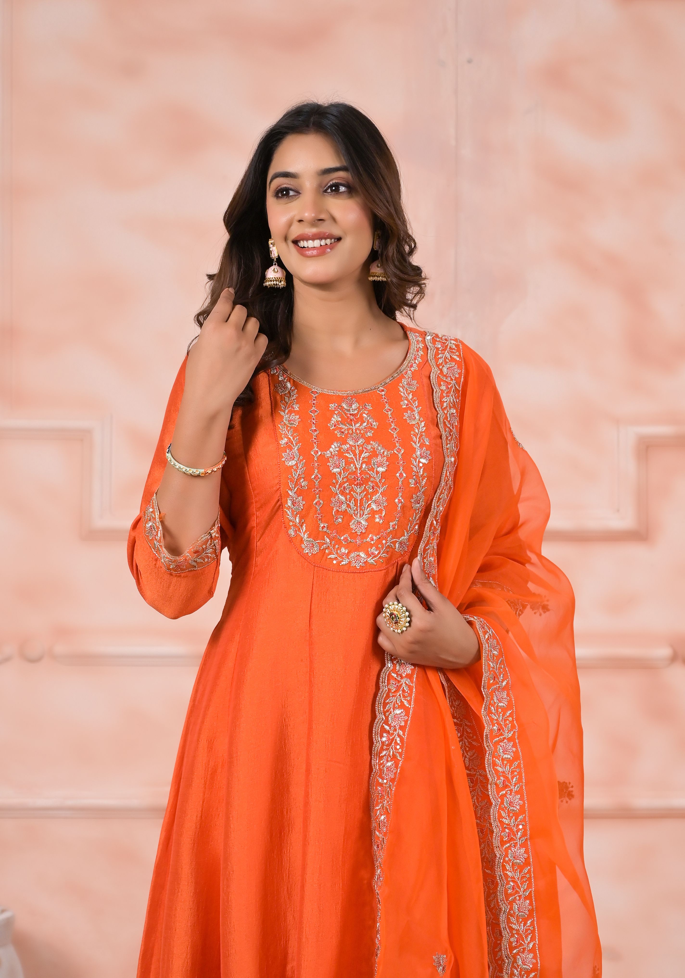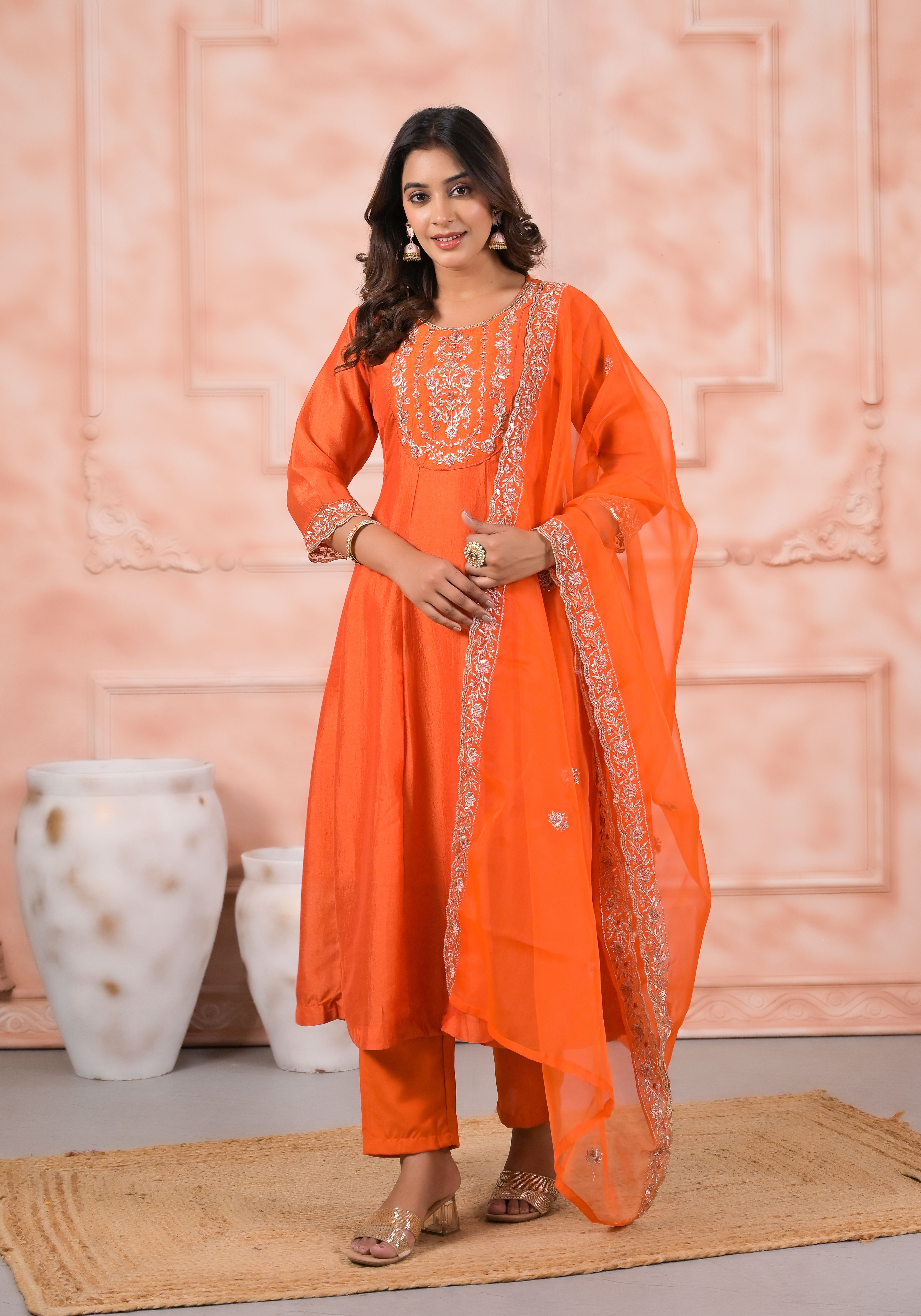 Orange Color Silk Fabric Designer Embroidery Work Ceremonial Kurta Set With Dupatta