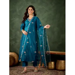 Teal Blue Color Silk Blend Designer...