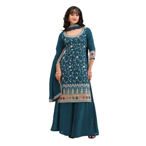 Teal Premium Embroidered Chinon Semi...