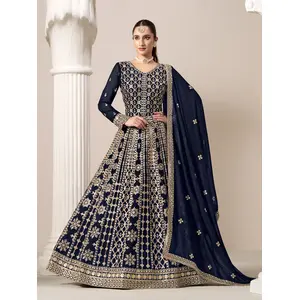 Navy Blue Embroidered Faux Georgette...
