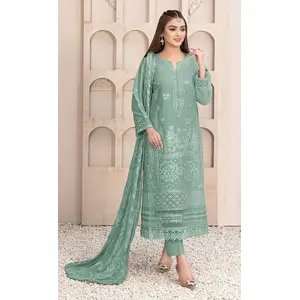 Green Embroidered Faux Georgette Semi...