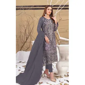 Grey Embroidered Faux Georgette Semi...