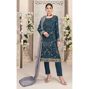 Teal Embroidered Faux Georgette Semi...