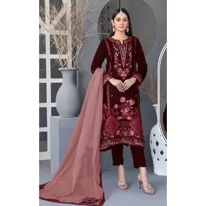 Maroon Velvet Semi Stitched Suit with...