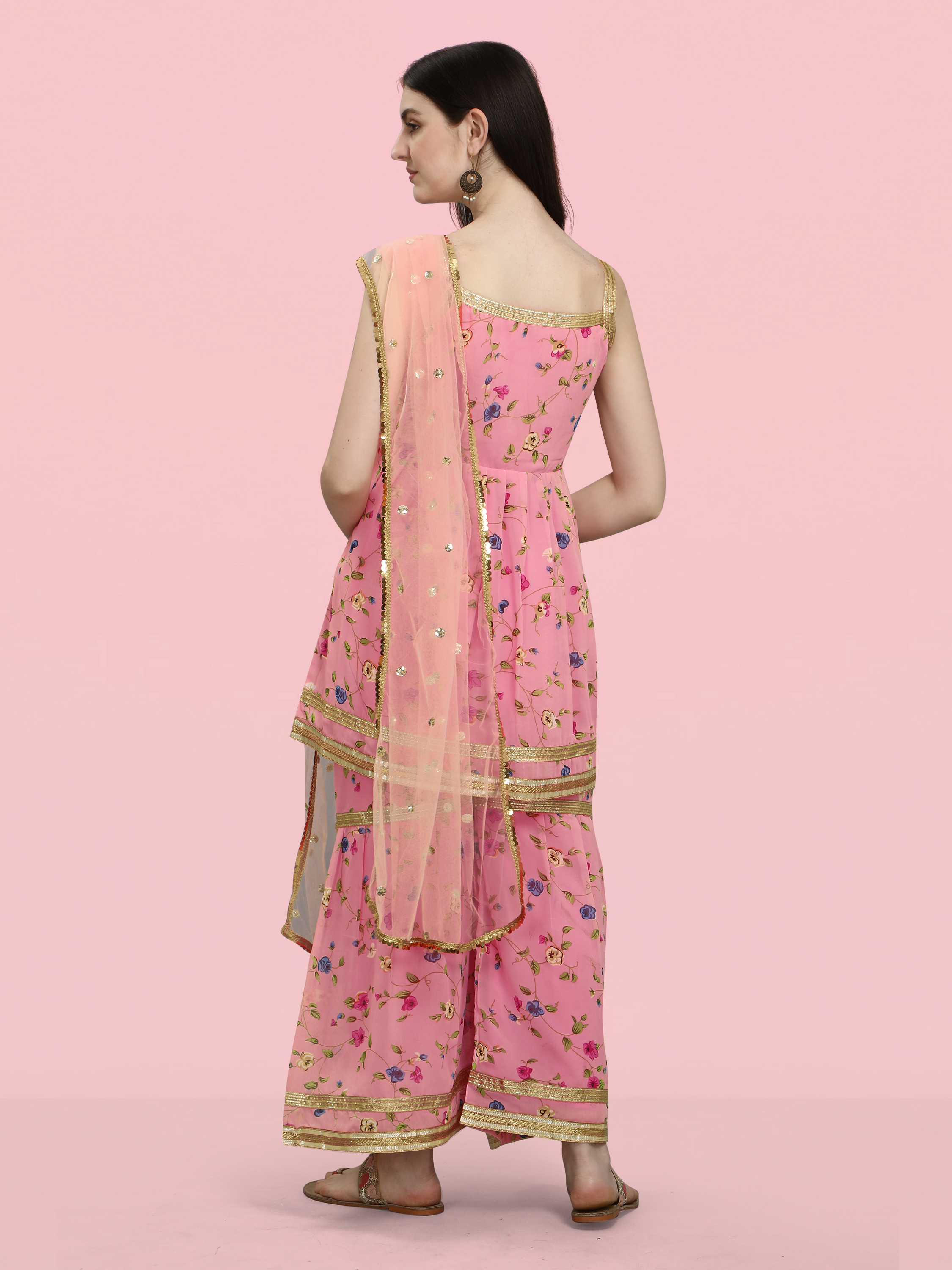 Looking These Beautiful Party Wear Readymade Sharara Suits With Dupatta.These Suit is Fabricated On Top And Bottom Are Georgette And Net Dupatta .Its Beautified With Designer Printed, Embroidery Work.