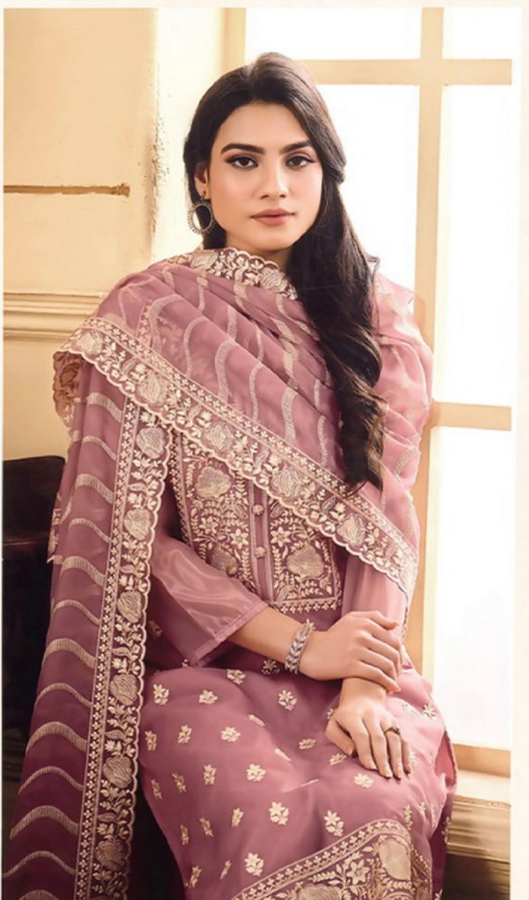 Pink Color Elegant Organza Fabric Designer Embroidered Suit