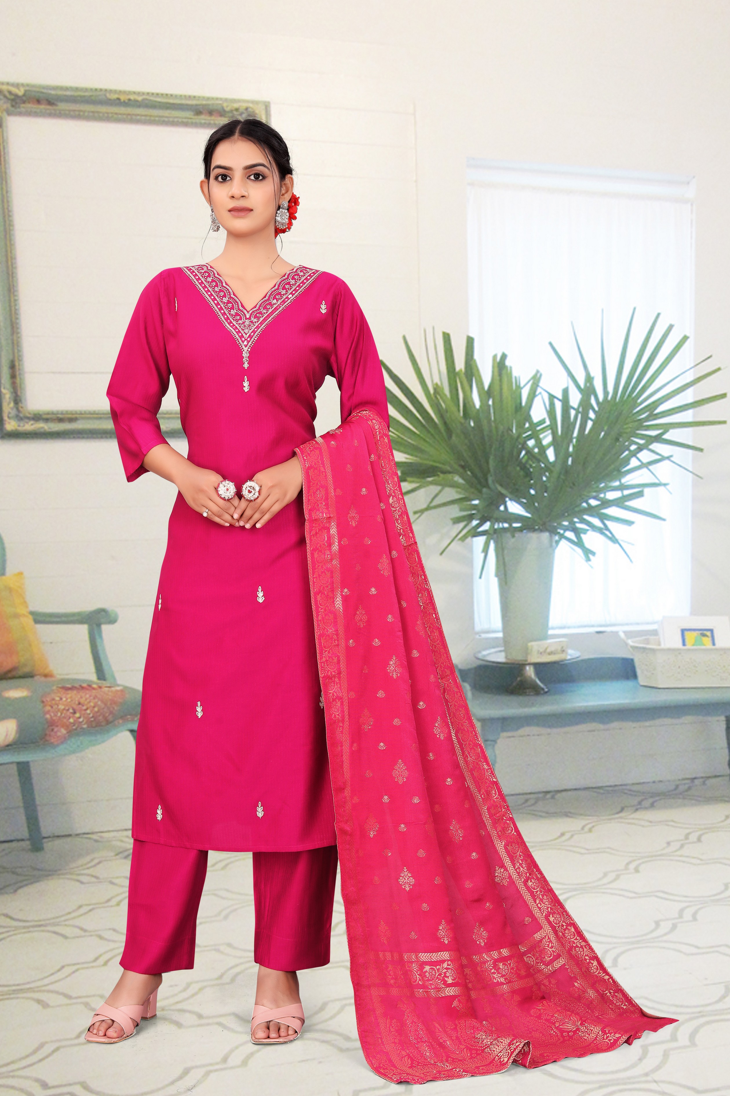 Attrective These Suit in Fine Colored Pair With Bottom And Dupatta.These Top And Bottom Are Fabricated On Vetican Pair With Muslin Banarasi Dupatta.Its Beautified With Designer Dori Embroidery Work.