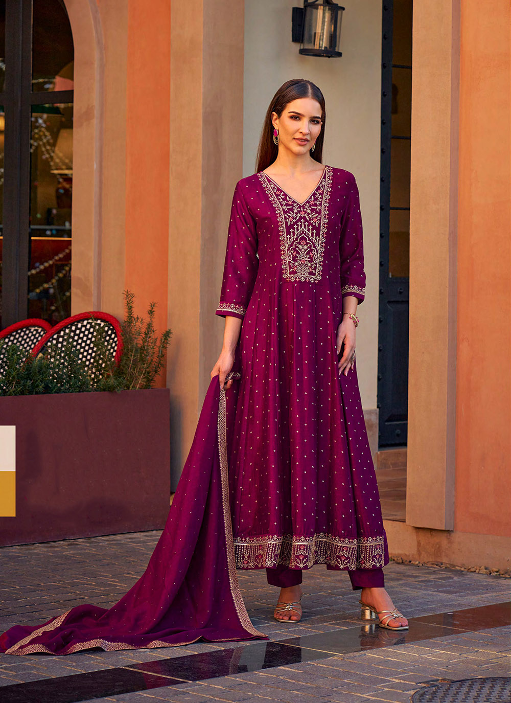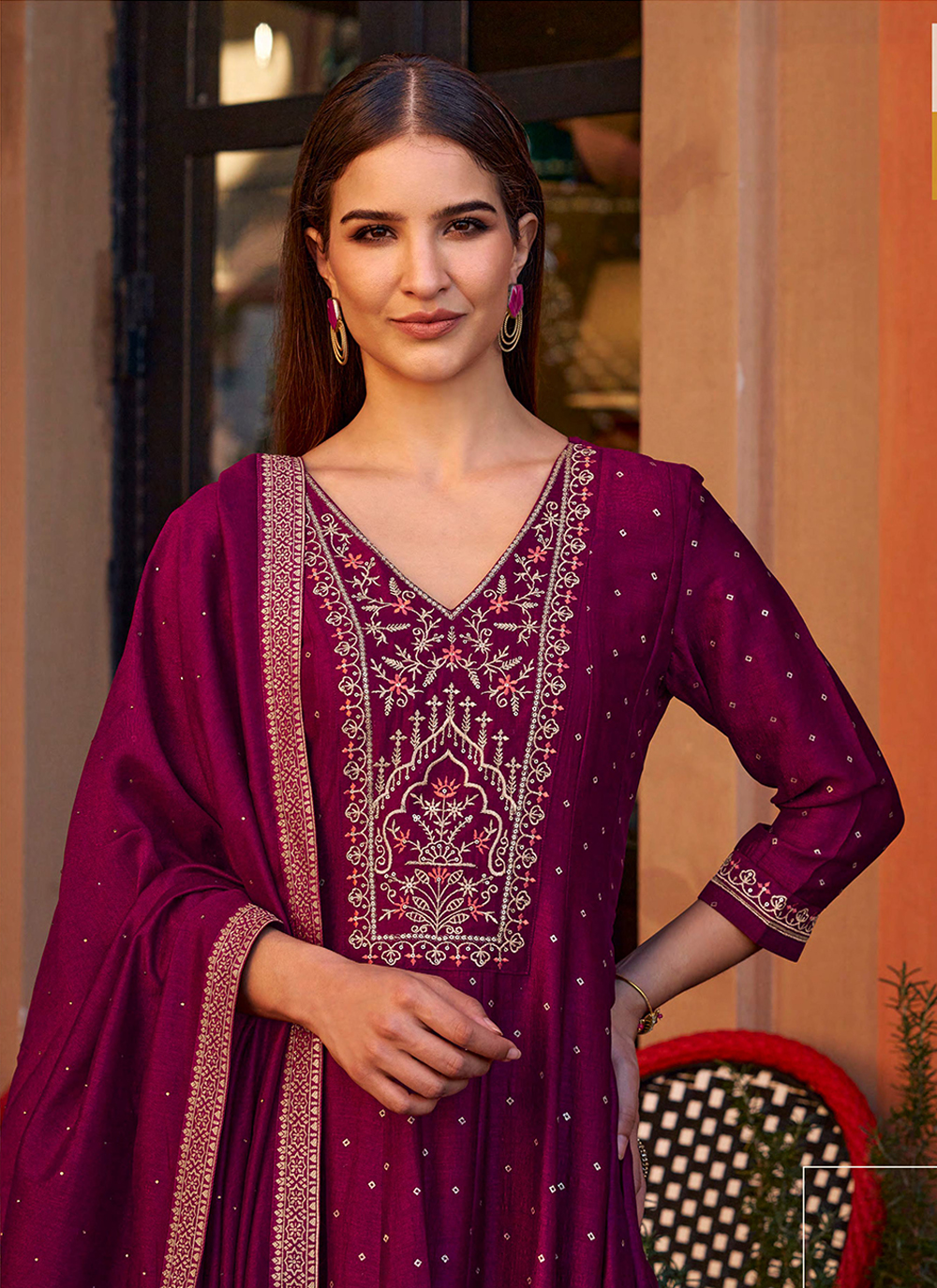 Garb These Beautiful Looking Readymade Anarkali Style Suits.These Top Are Vichitra Silk And Bottom Are Vichitra Silk And Dupatta Are Vichitra Silk Fabricated.Its Beautified With Foil Printed,Designer Embroidery,Hand Work.
