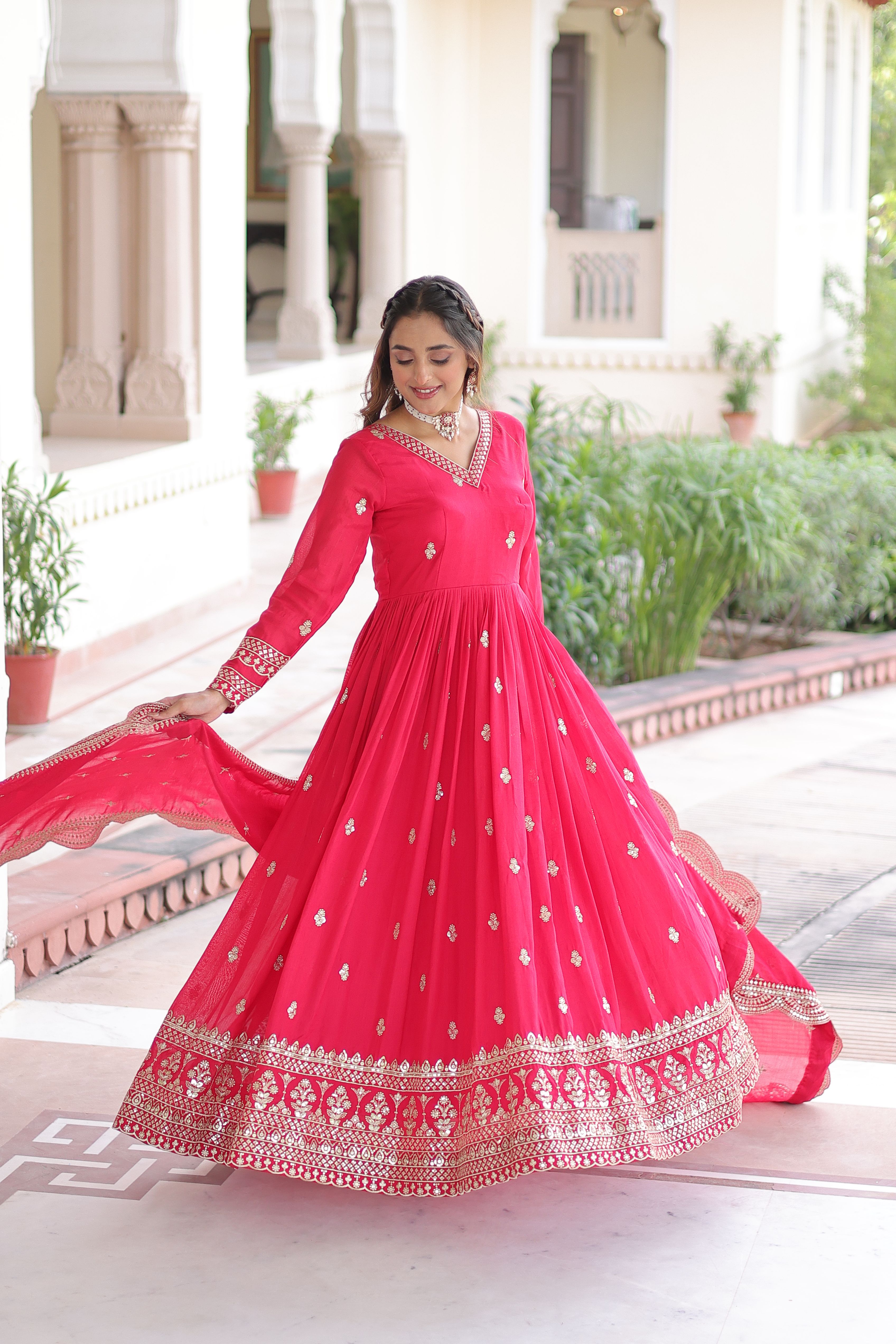 Garb These Beautiful Looking Party Wear Readymade Long Gown With Dupatta.These Gown Are Vichitra Silk And Dupatta is Fabricated On Vichitra Silk.Its Beautified With Designer Jari,Sequance Embroidery Work.