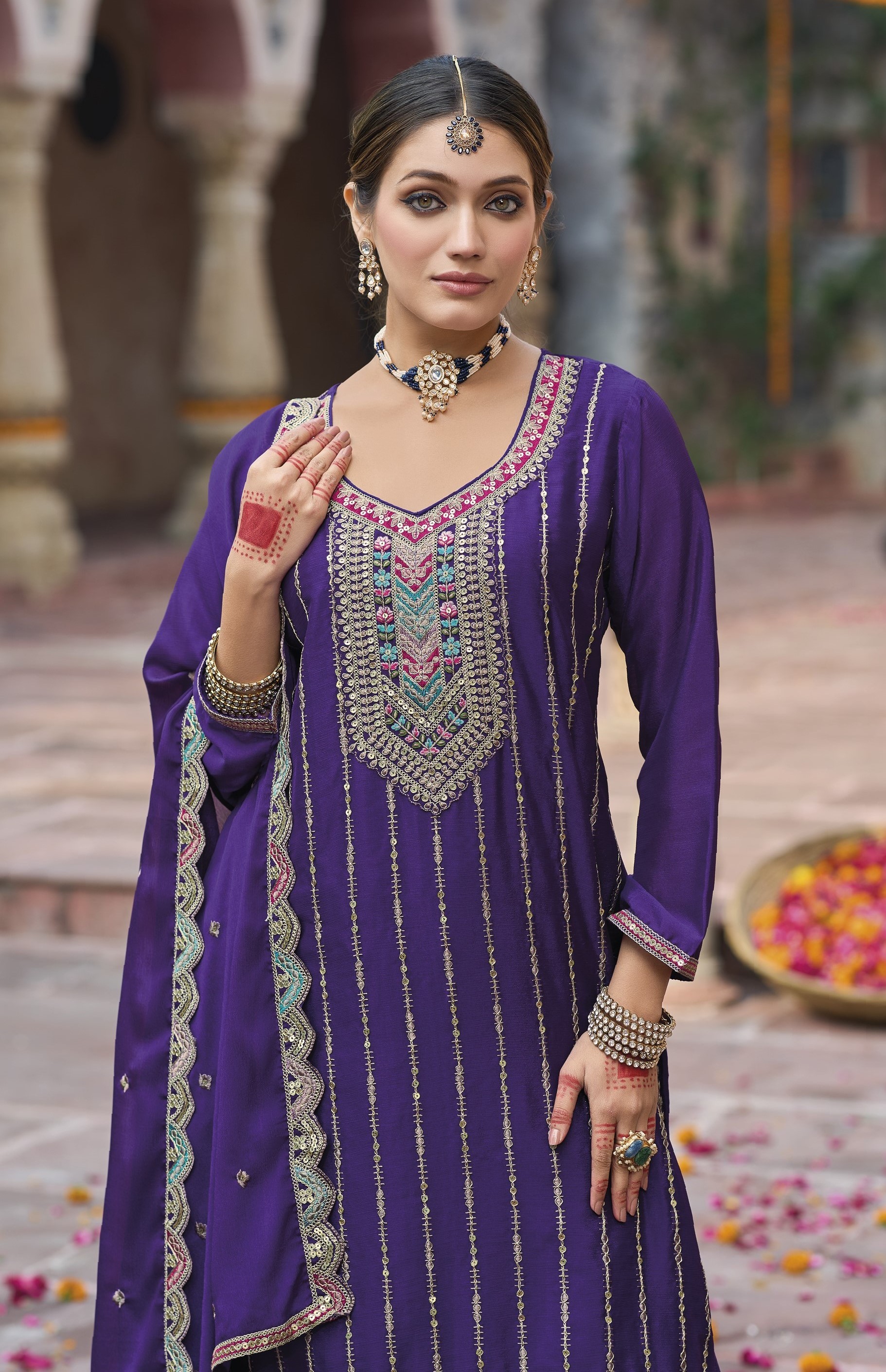 Purple Color Chinon Fabric Wedding Designer Palazzo Dress For Ceremonial Looks XXL(44)