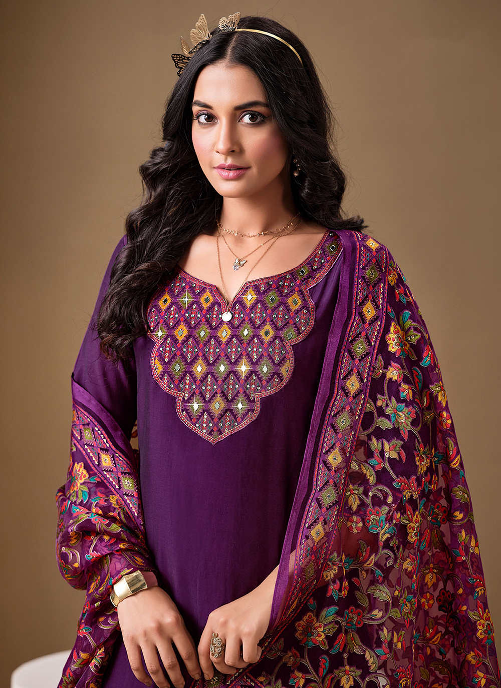 Purple Color Roman Silk Fabric Bollywood Style Ceremonial Wear Salwar Kameez