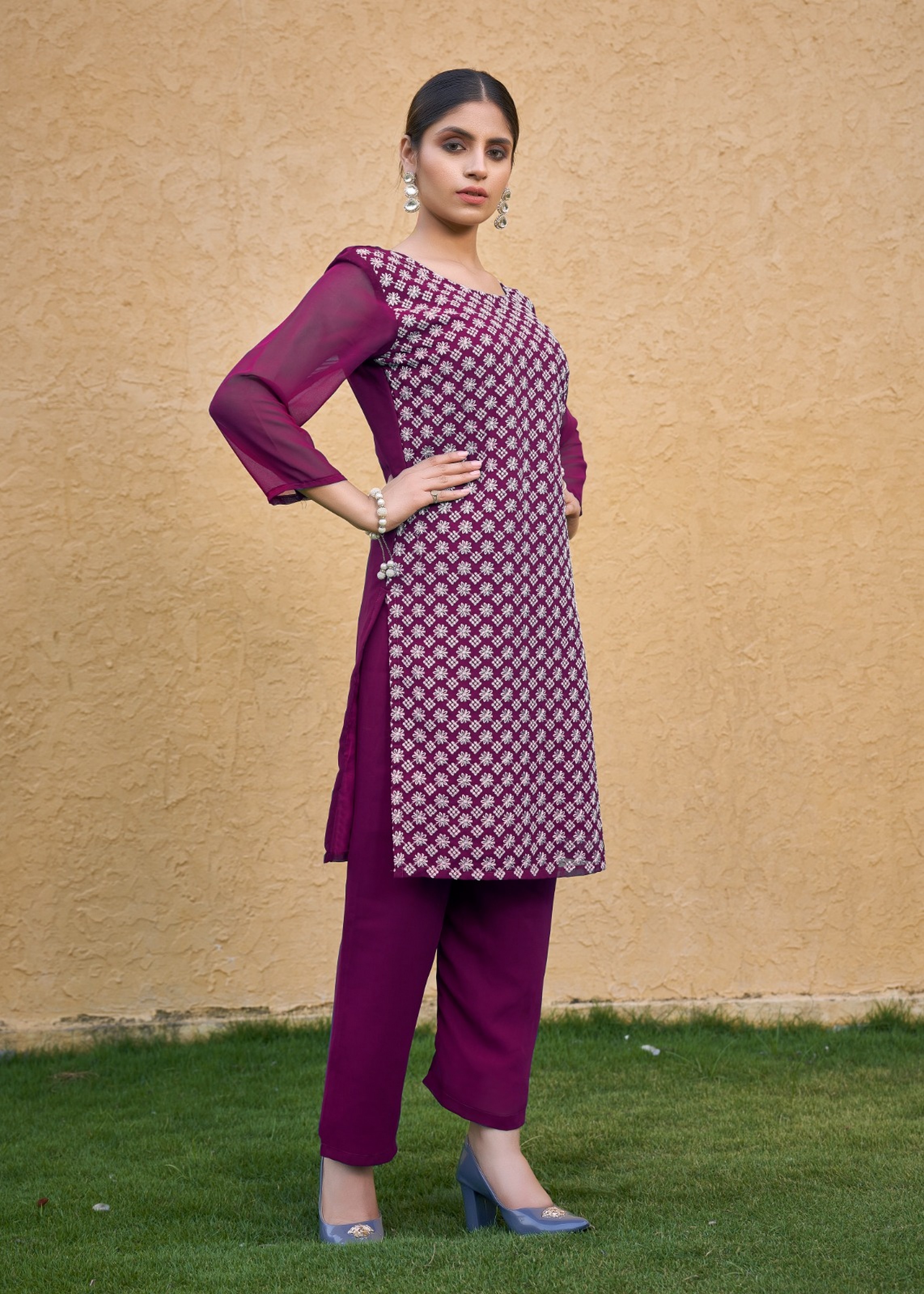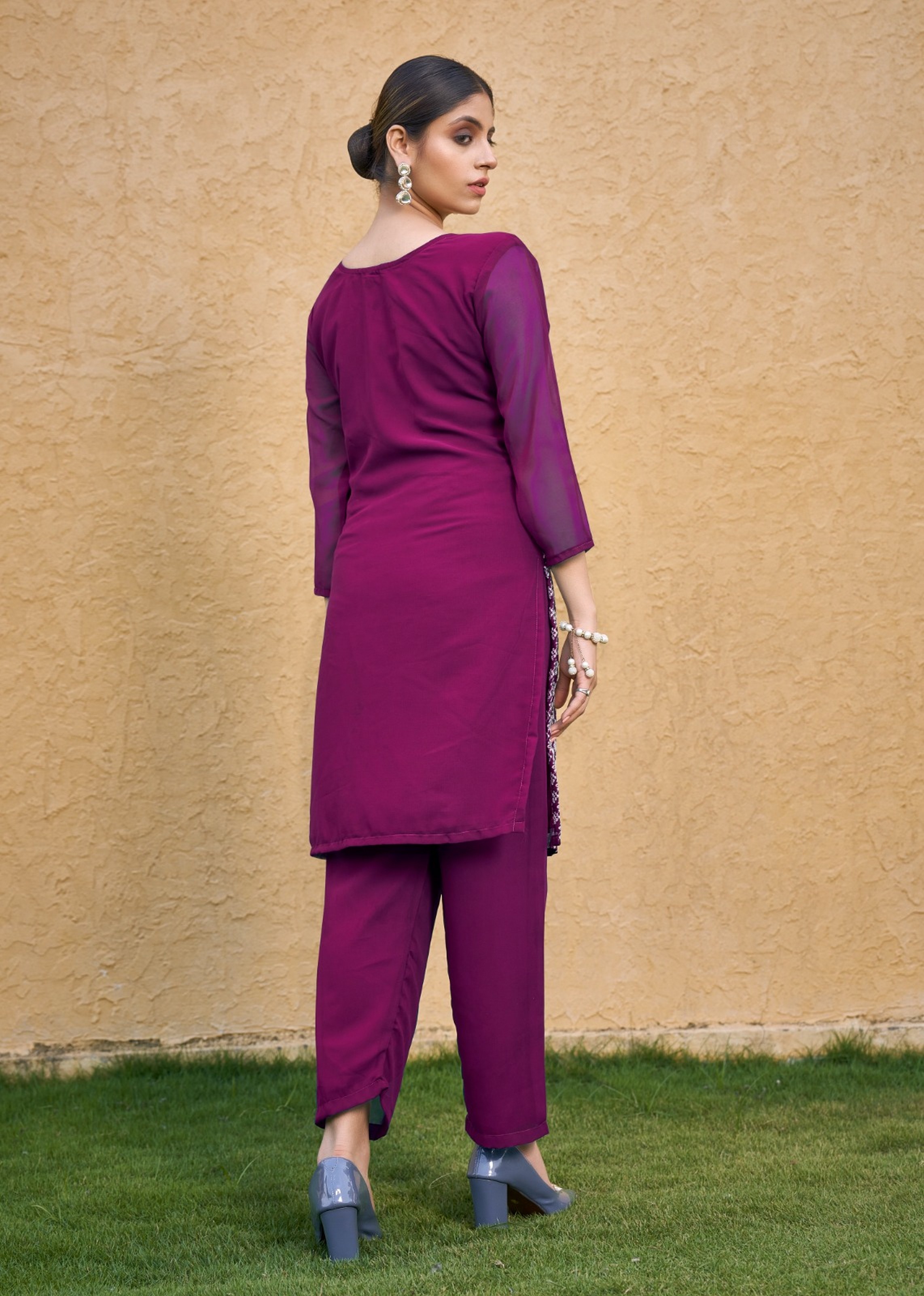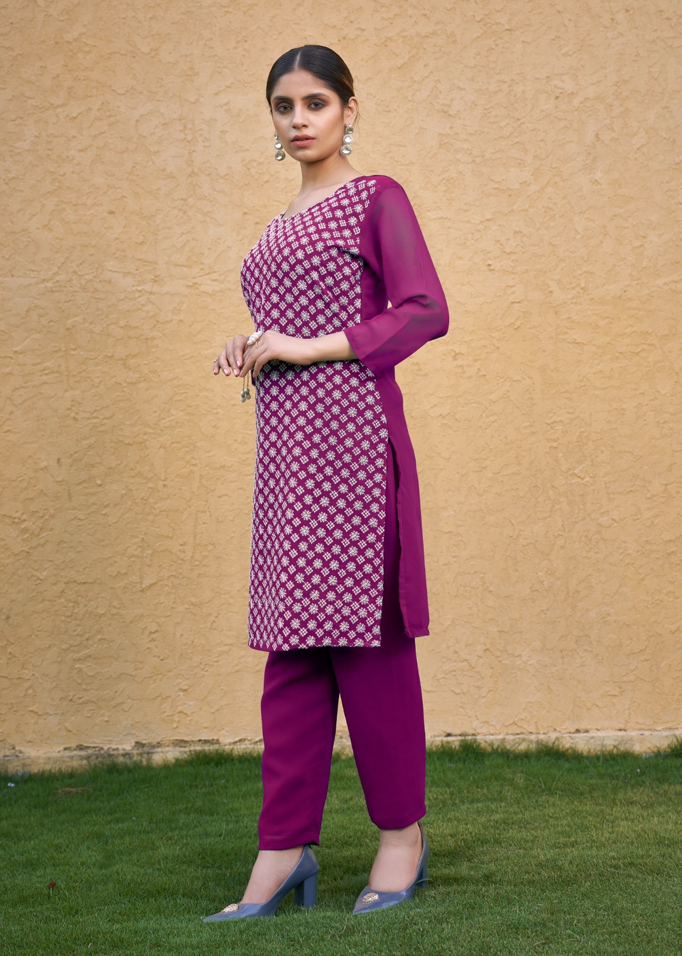 Purple Color Thread Embroidery Work Casual Georgette Kurti