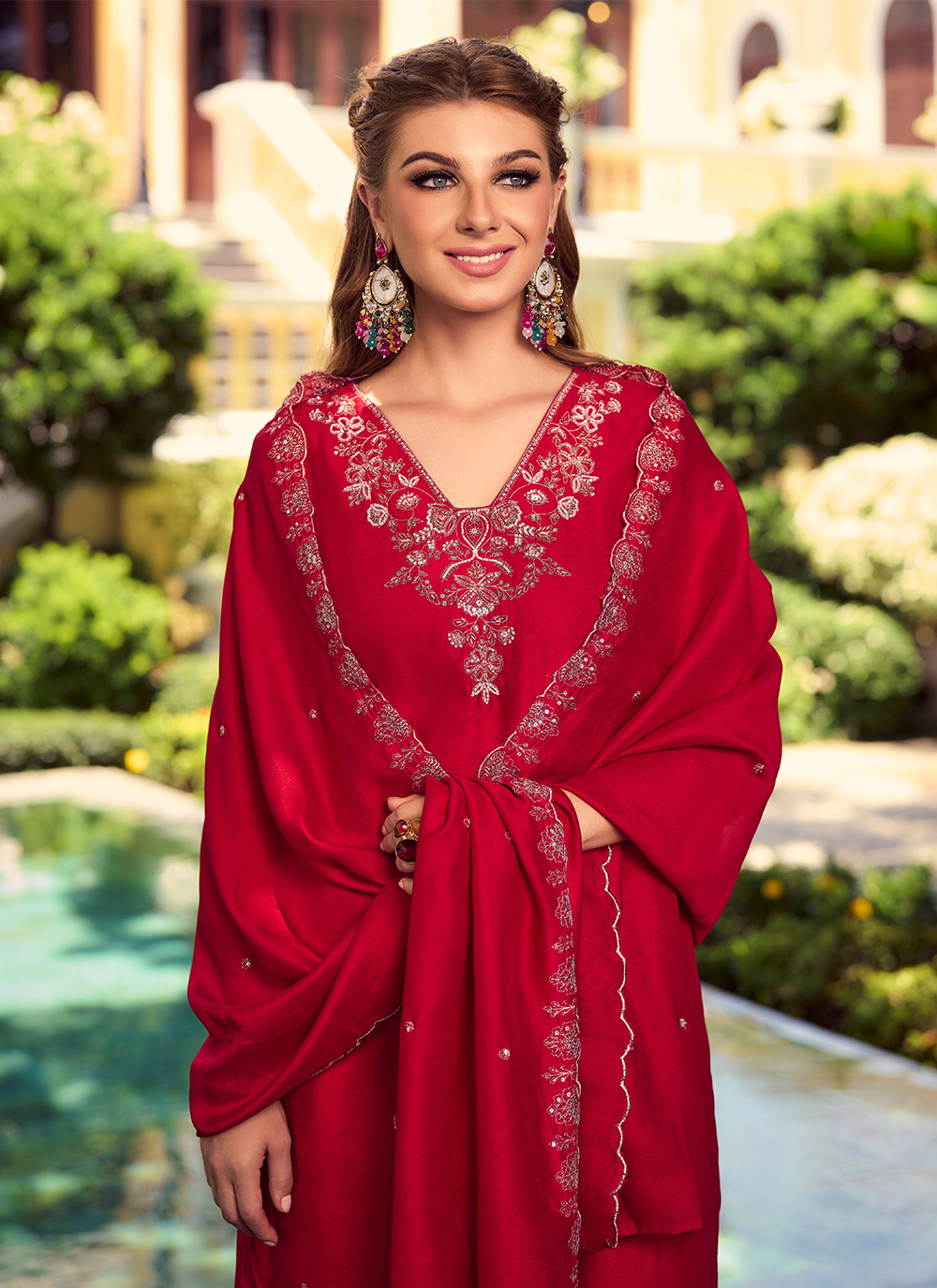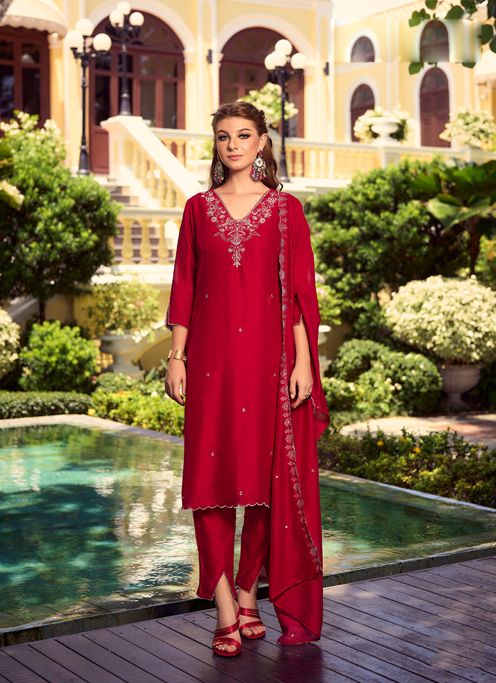 Red Color Beautiful Ceremonial Shimmer Silk Fabric Embroidered Girls Suit